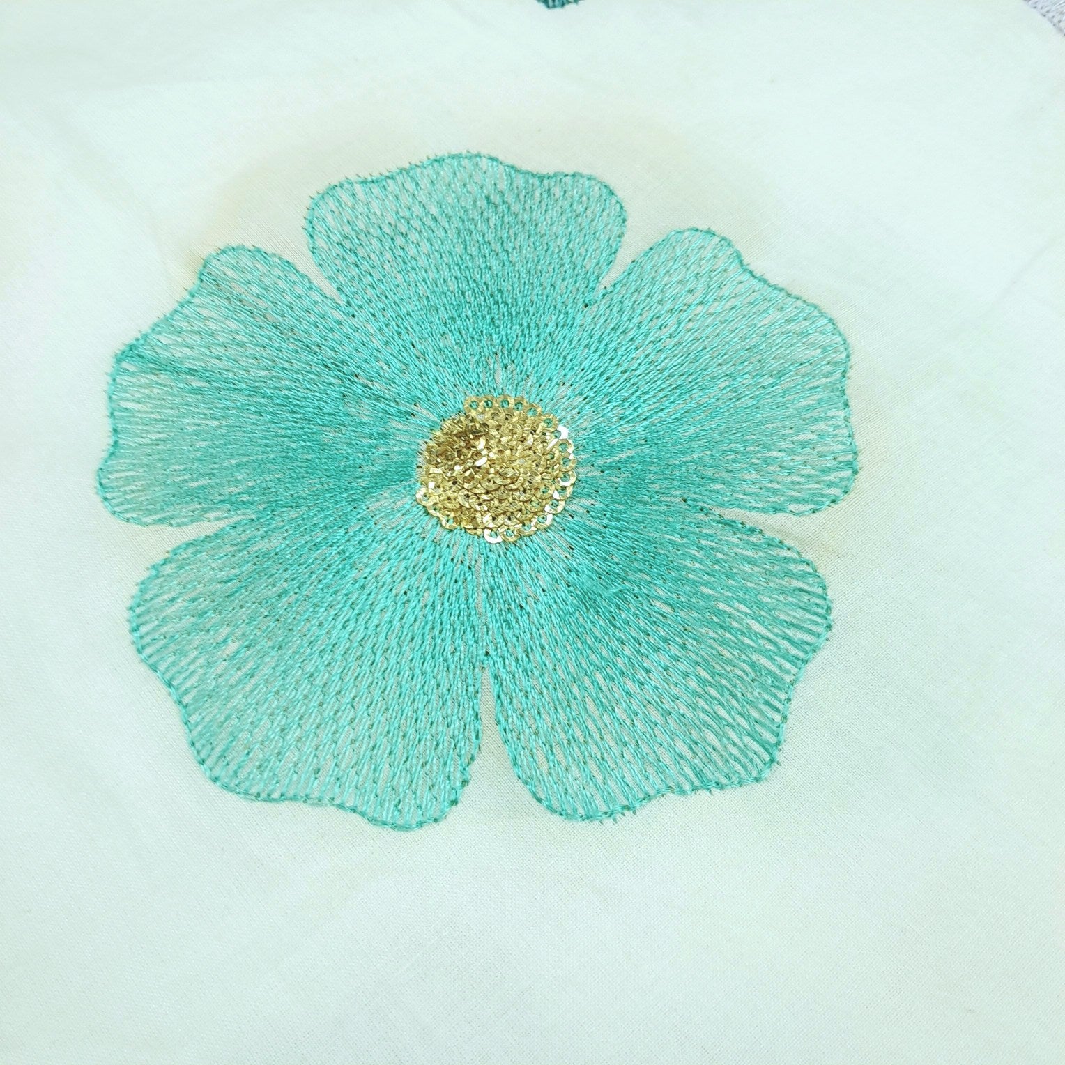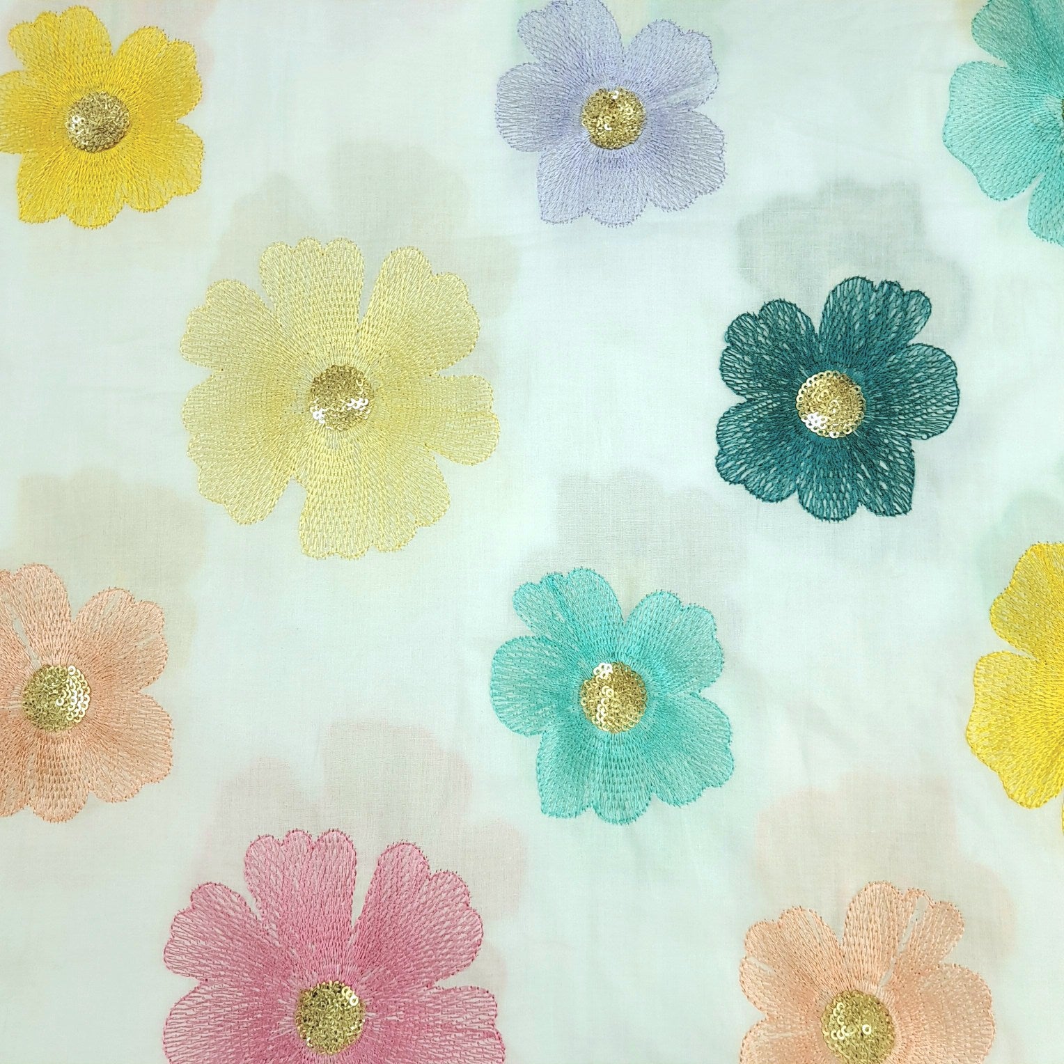 A delightful blend of softness and sparkle, this white cotton base fabric is adorned with pastel floral motifs intricately embroidered and highlighted with golden sequin centers. The multicolored blooms in pink, yellow, mint, lilac, and teal add a refreshing and playful charm, making this fabric perfect for festive wear, summer kurtas, or statement blouses.