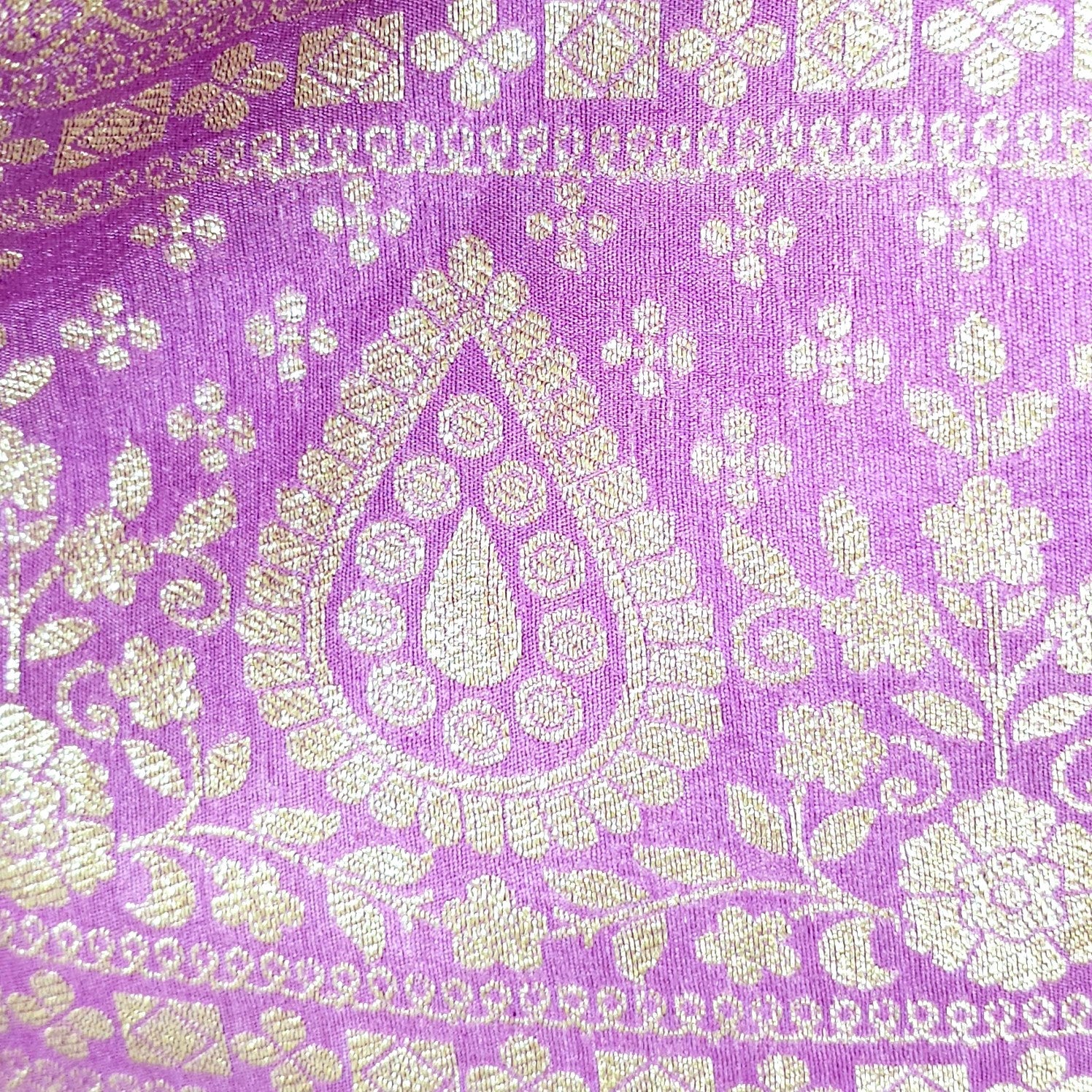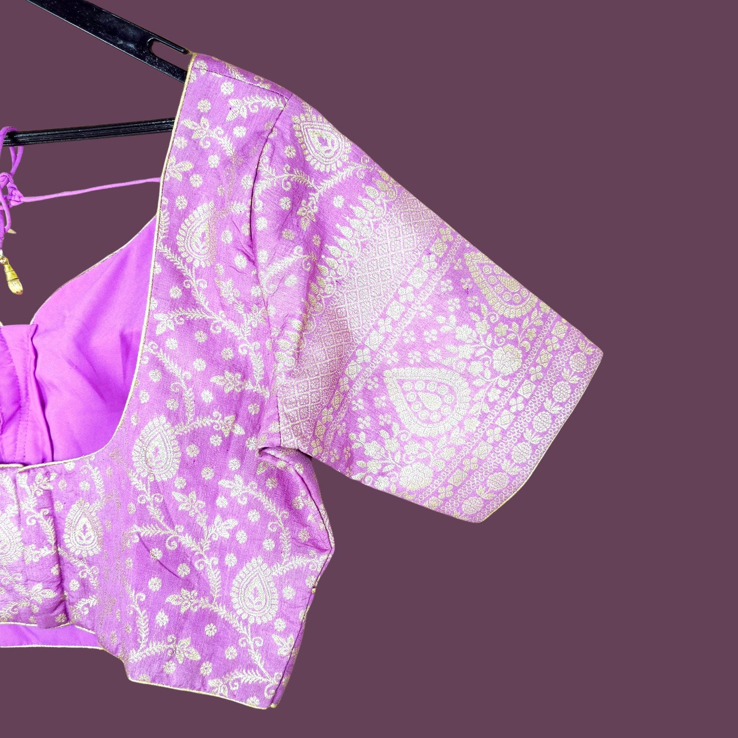 This stunning lilac color blouse features intricate golden work in traditional paisley and floral patterns. The deep sweetheart neckline and tie-up back add a touch of elegance. A perfect pick for evening functions, receptions, and festive celebrations.