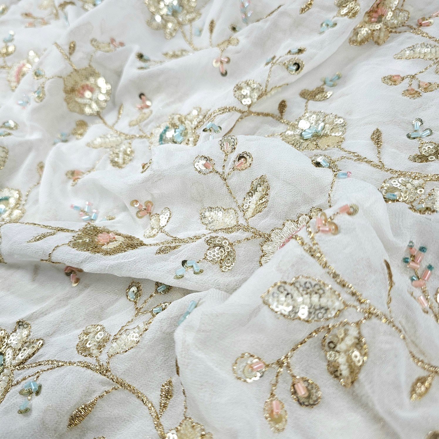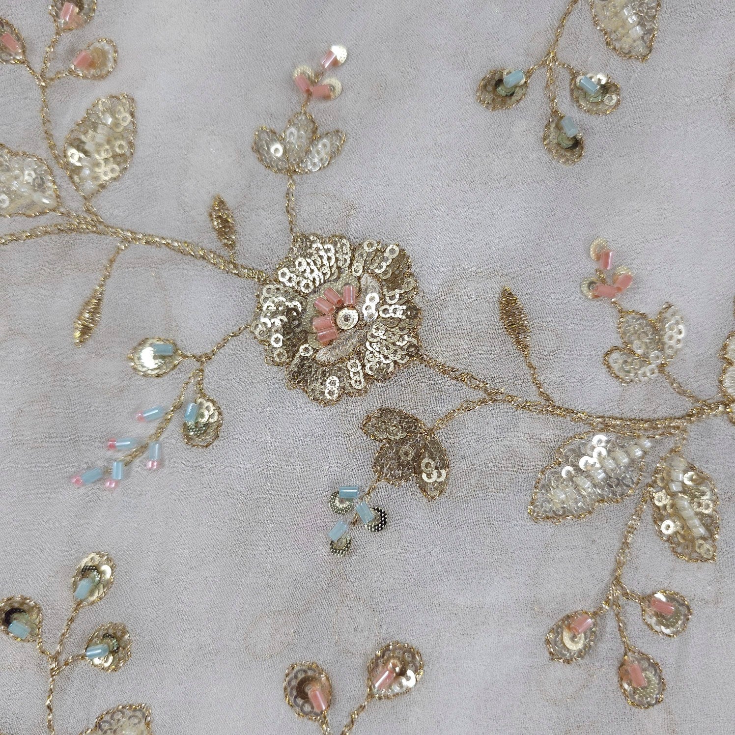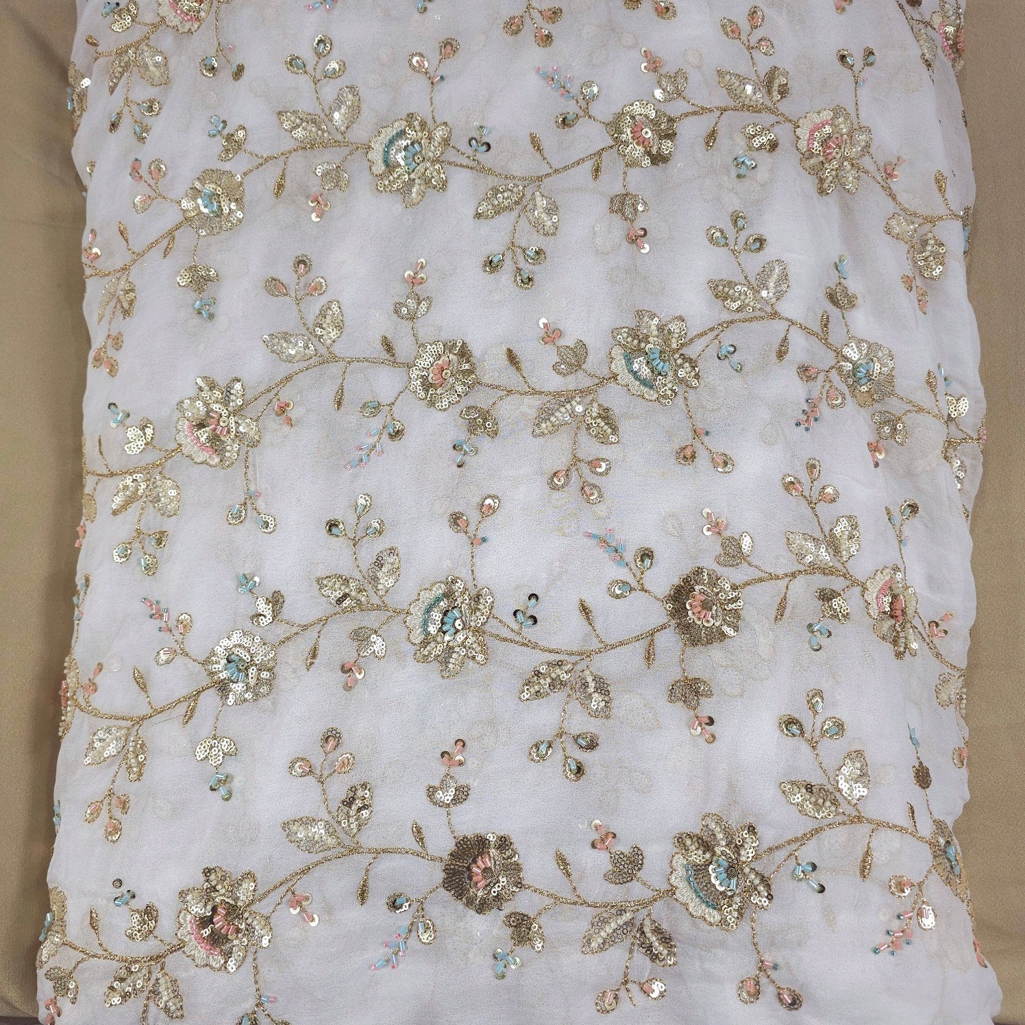 This elegant fabric features delicate vine motifs intricately embroidered on a dyeable shimmer tissue base. The design showcases fine threadwork using pastel tones of aqua blue, blush pink, and soft ivory, highlighted with sparkling sequin and zari accents. The vertical layout of the vine trails adds a graceful flow, making it an ideal choice for festive, bridal, or evening ensembles.