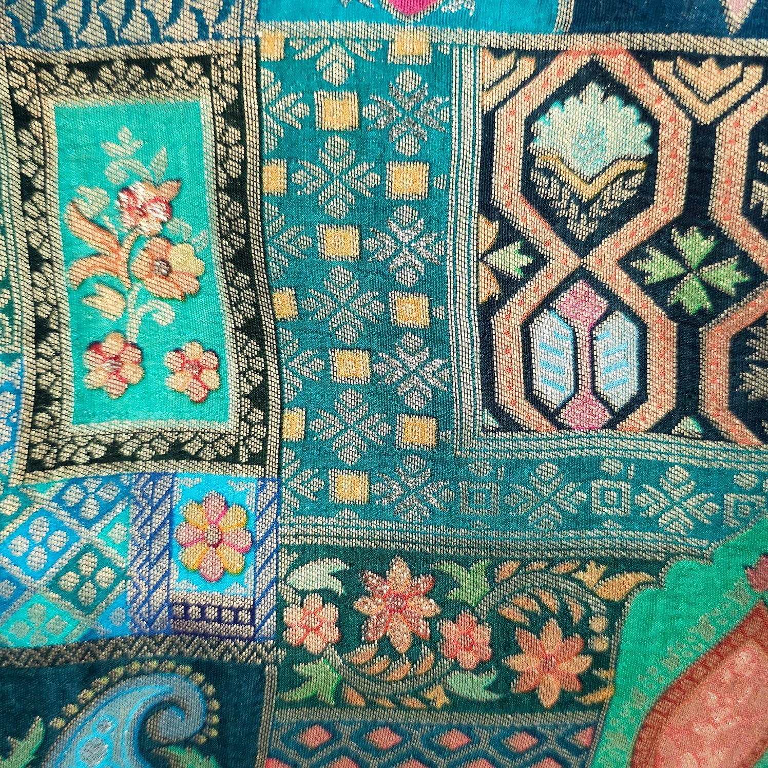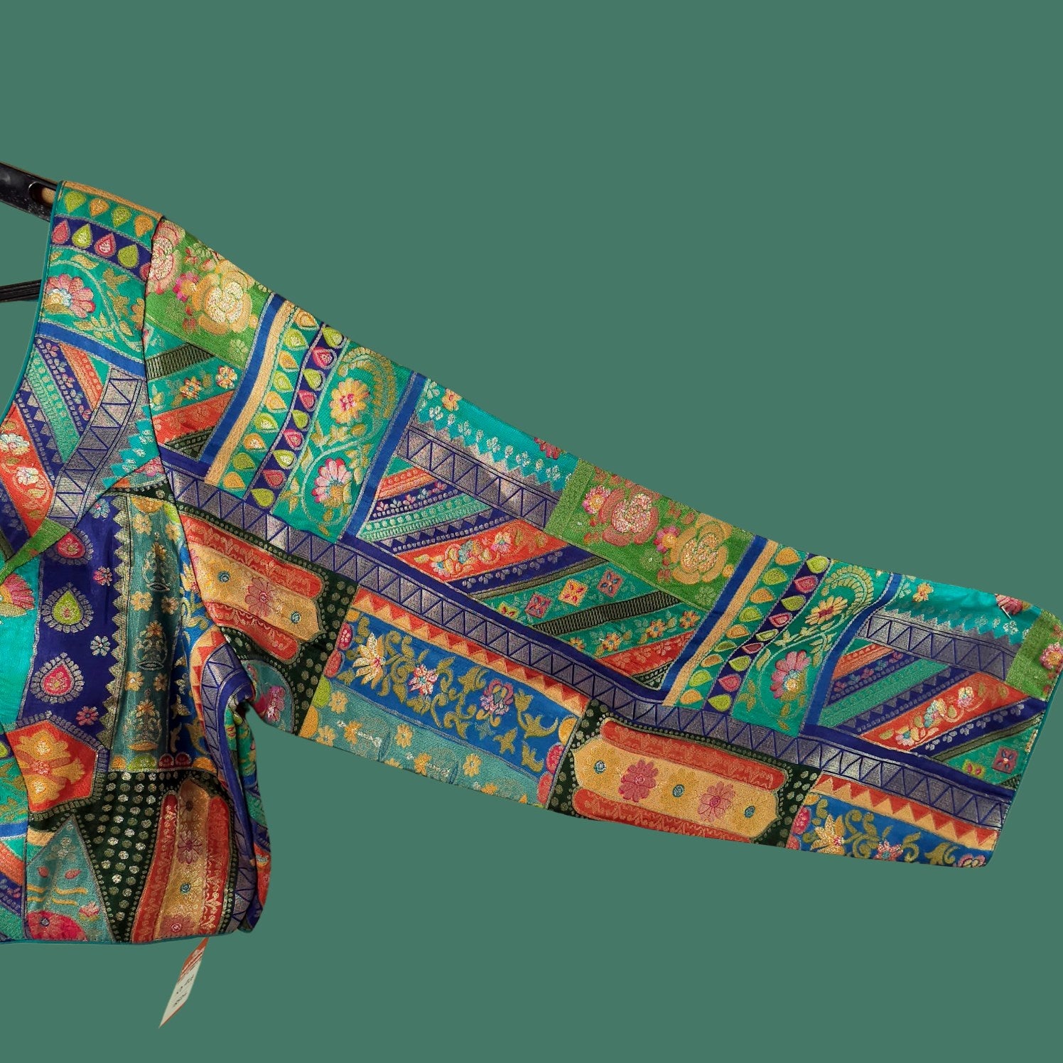 This vibrant brocade blouse showcases rich traditional motifs in striking multi color tones with gold tones. Designed with a flattering sweetheart neckline and full sleeves, it exudes festive charm. The intricate woven patterns and back tie detail add elegance and grace. Perfect for weddings, festivals, and cultural occasions.