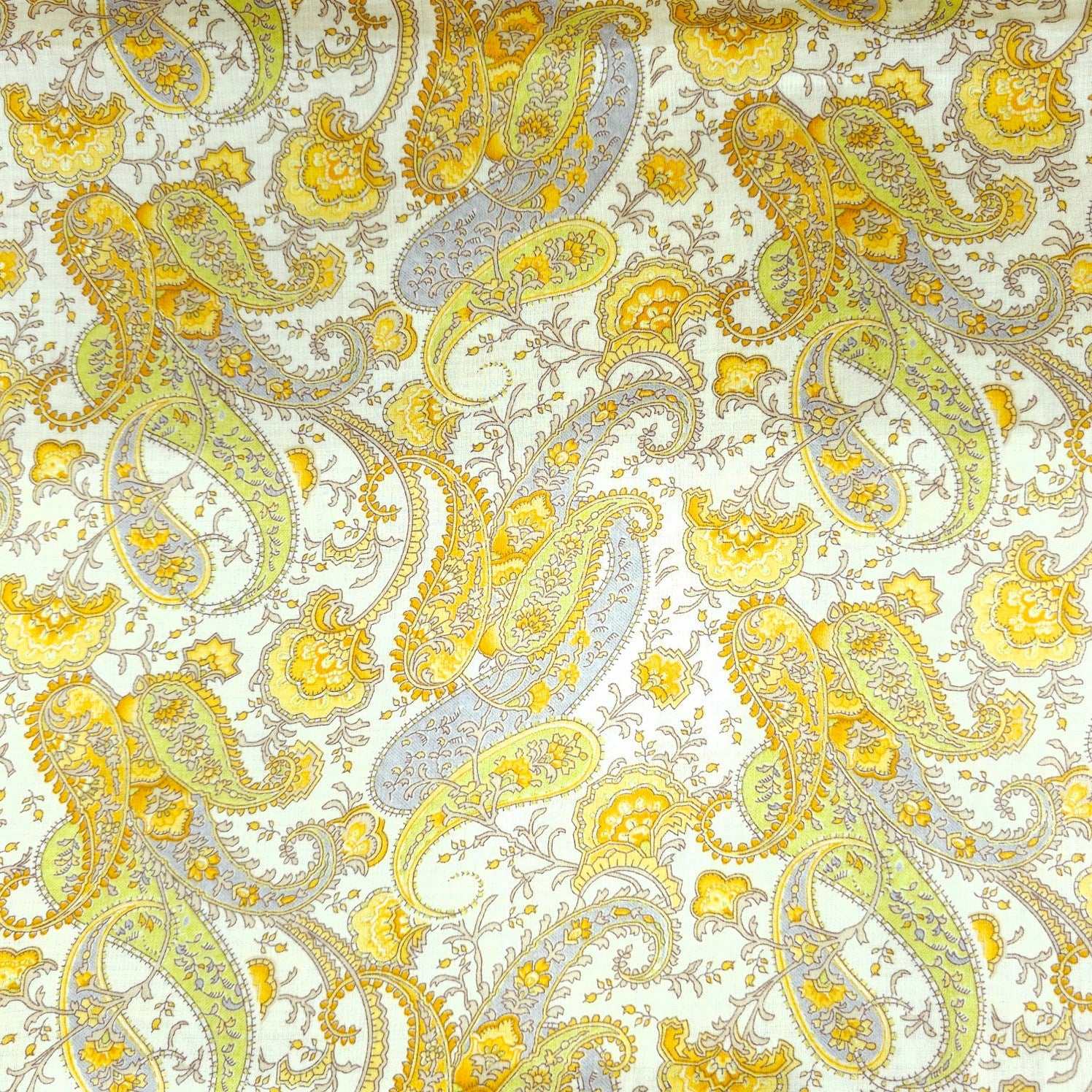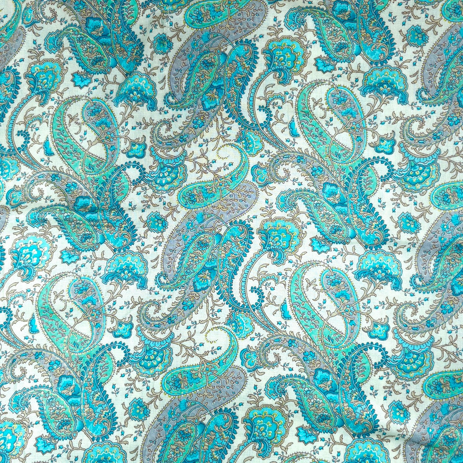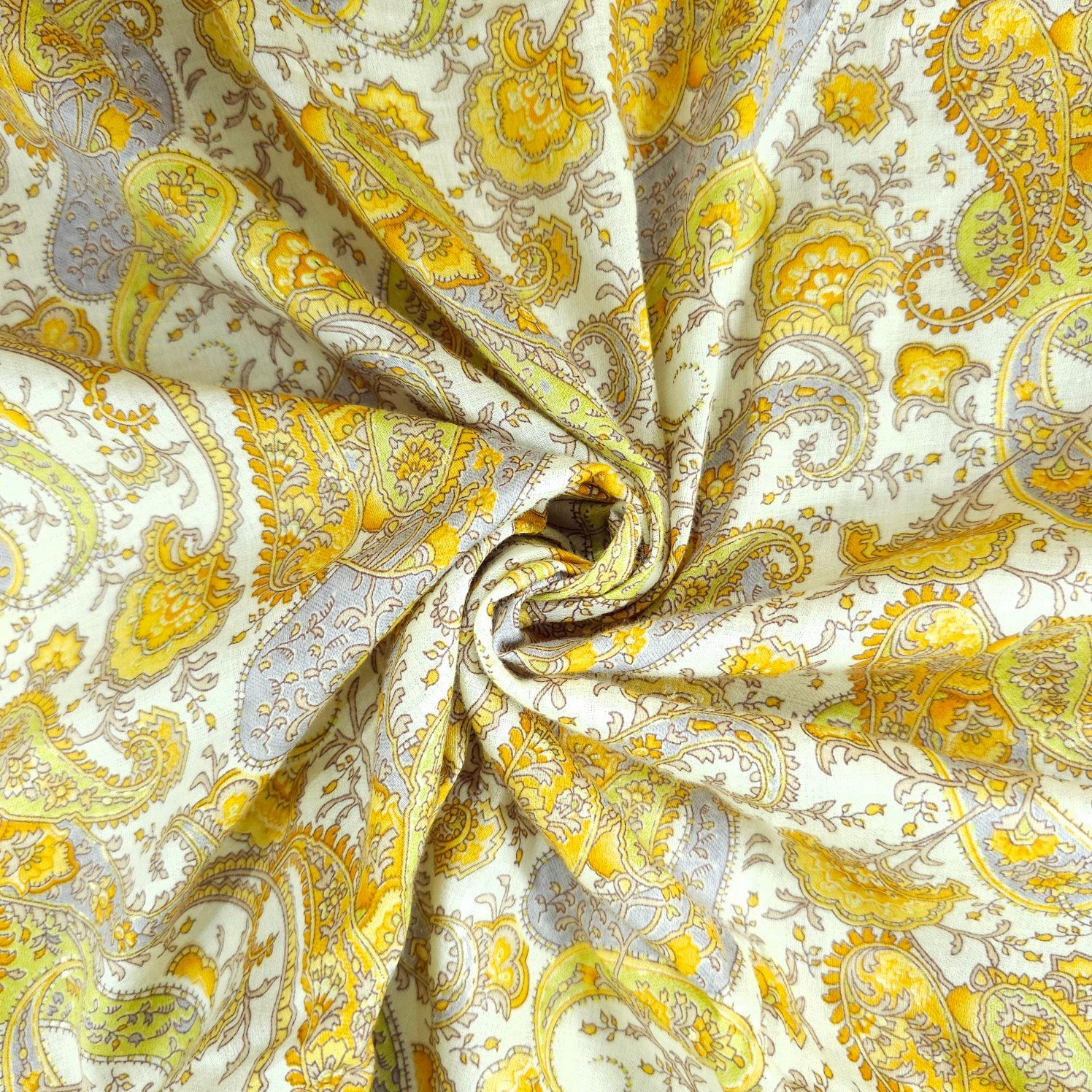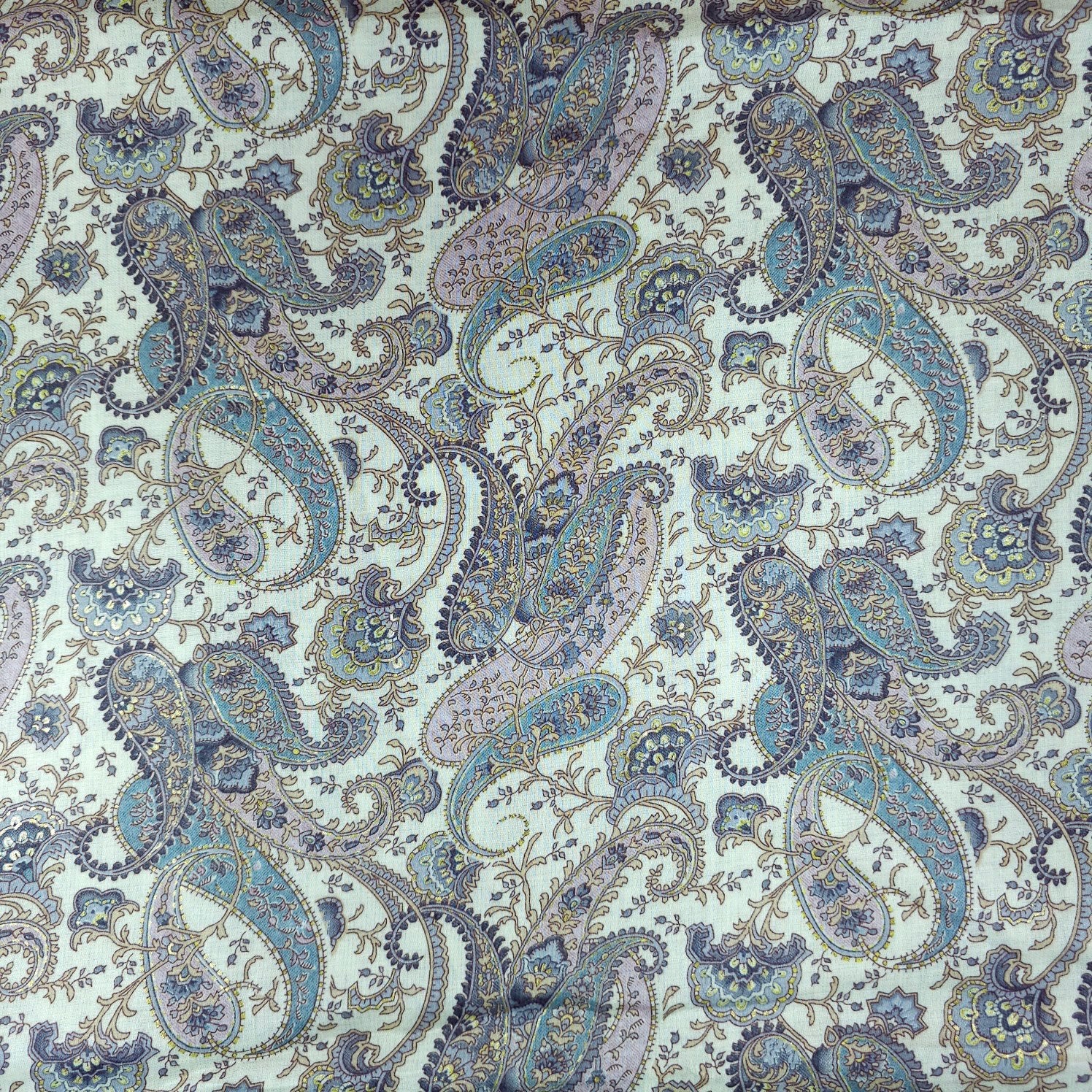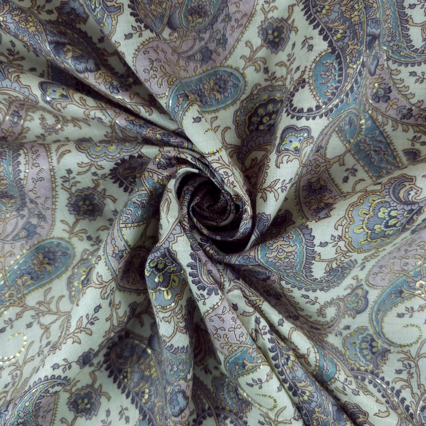 Elegant printed cotton fabric featuring intricate paisley and floral motifs. The delicate, vintage-inspired design exudes sophistication and charm. Lightweight and breathable, perfect for stylish everyday wear.