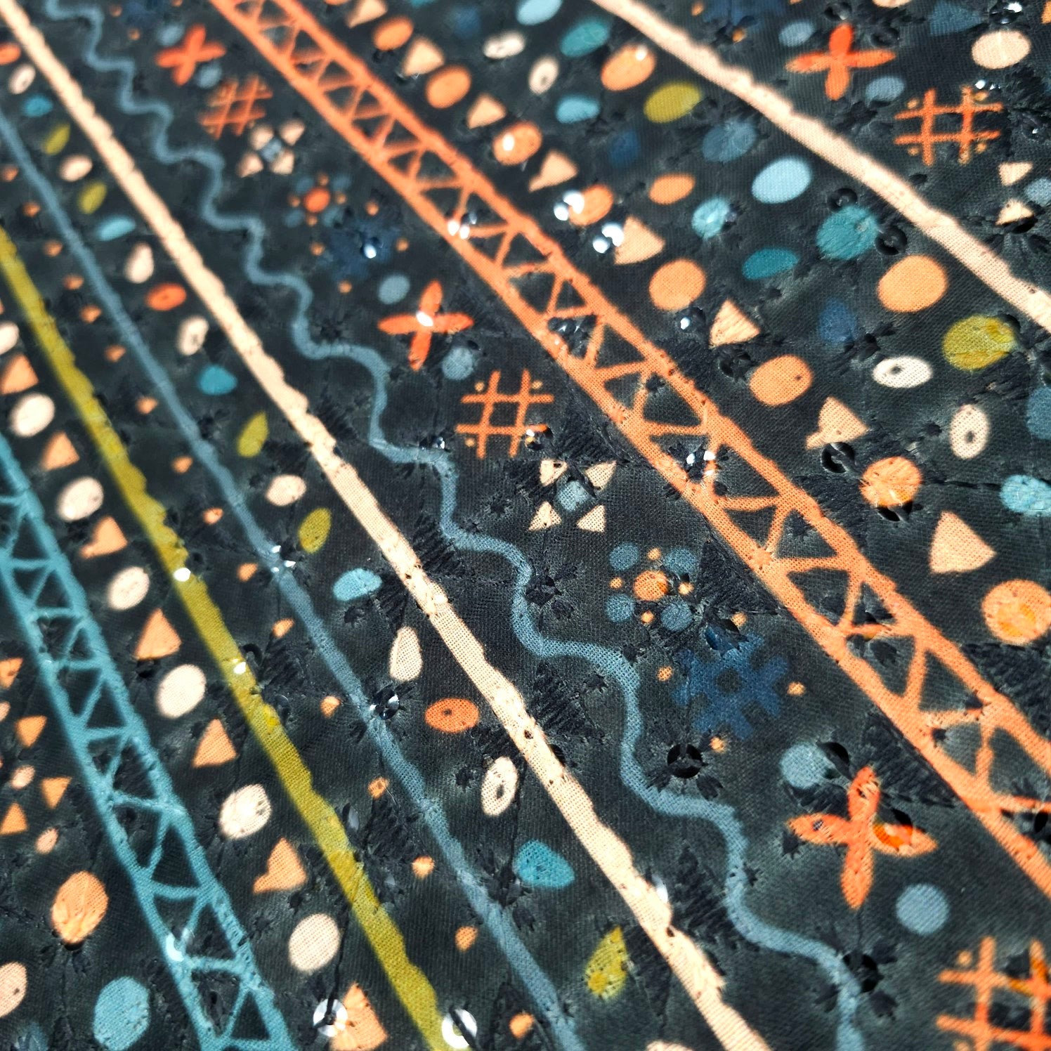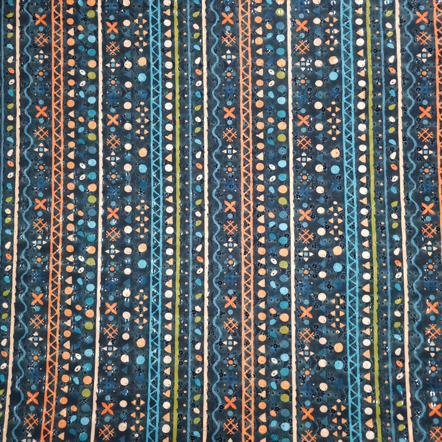 An artistic expression of symmetry and tradition, this fabric is printed with dotted and geometric motifs. Accented with sequin embellishments, It combines spiritual charm with festive sparkle, making it perfect for ethnic elegance.