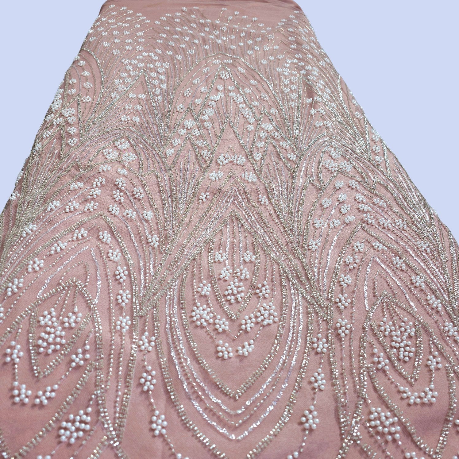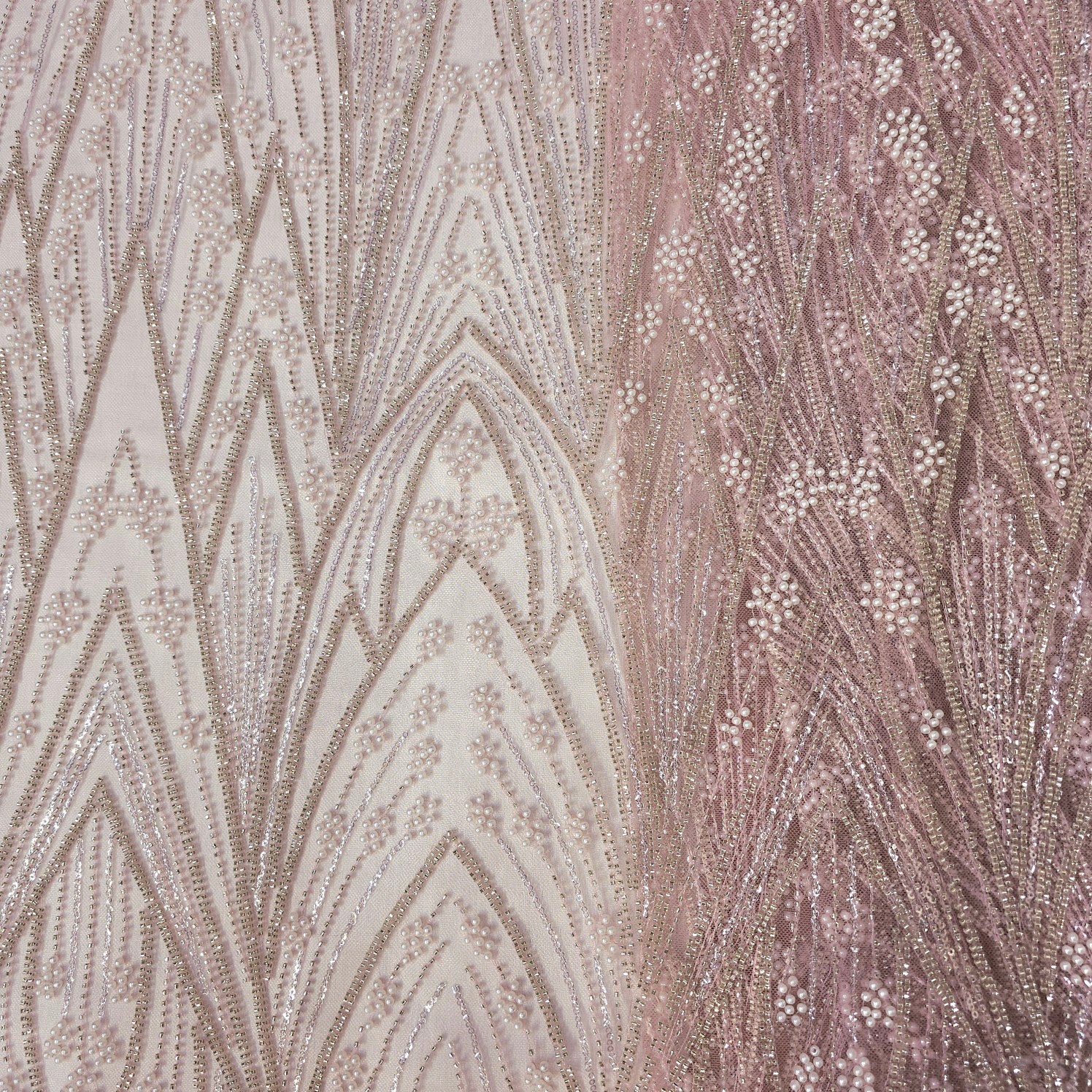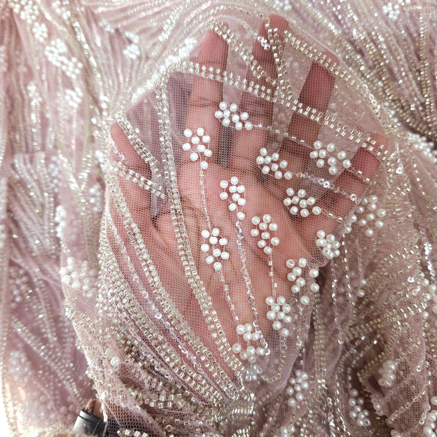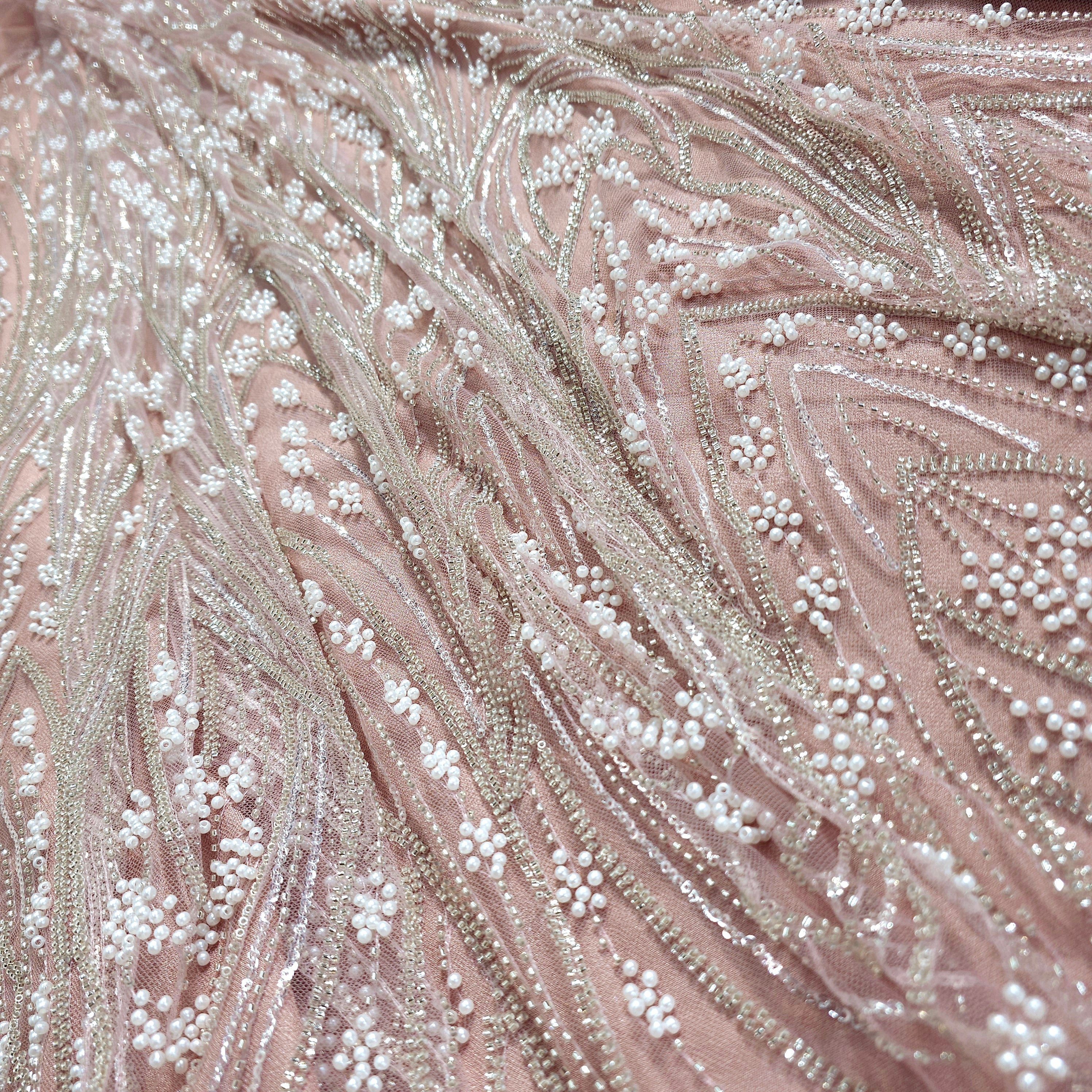 Elegant Net Fabric with intricate sequin and bead embroidery, creating a shimmering leaf and wave-like pattern. The fabric has a luxurious, flowing texture, making it perfect for bridal wear, gowns, and evening ensembles.
