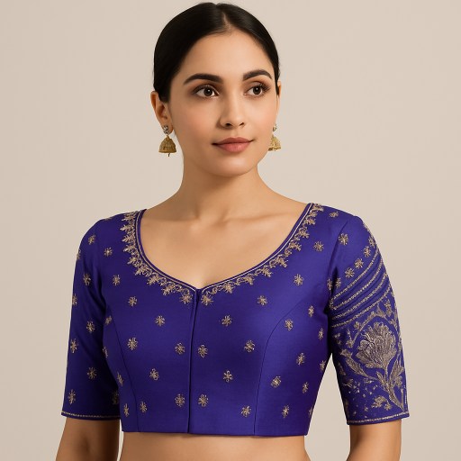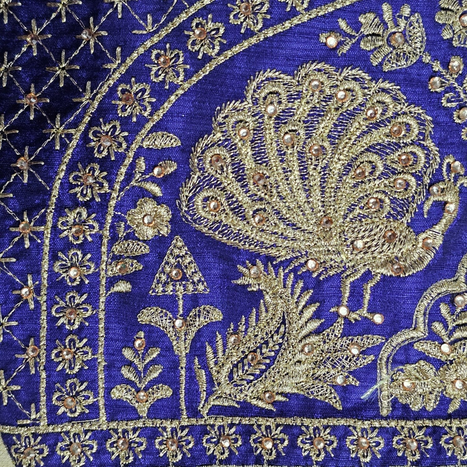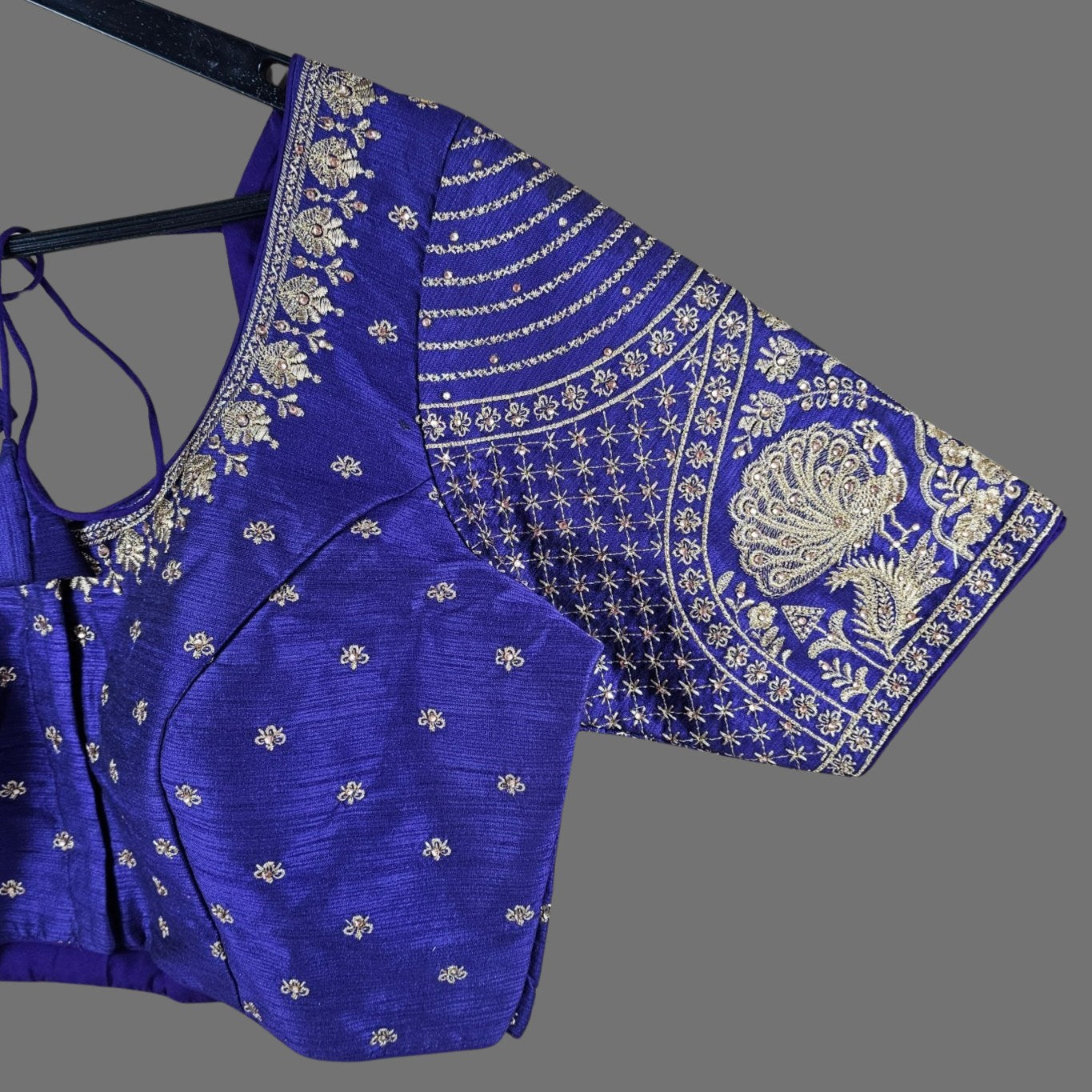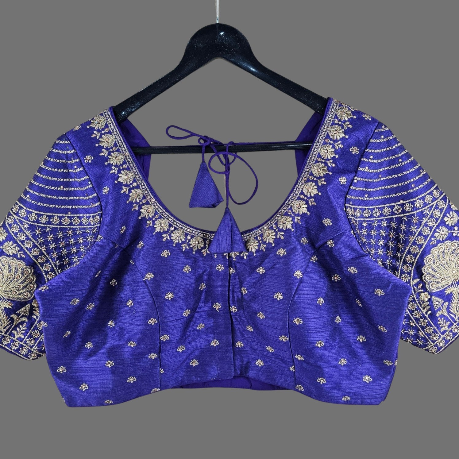This is an elegant silk blouse adorned with rich zari embroidery and intricate peacock designs on the sleeves. The royal purple tone and classic round neckline and Matka neck at back make them a regal choice and they’re perfect for weddings, receptions, or festive celebrations.