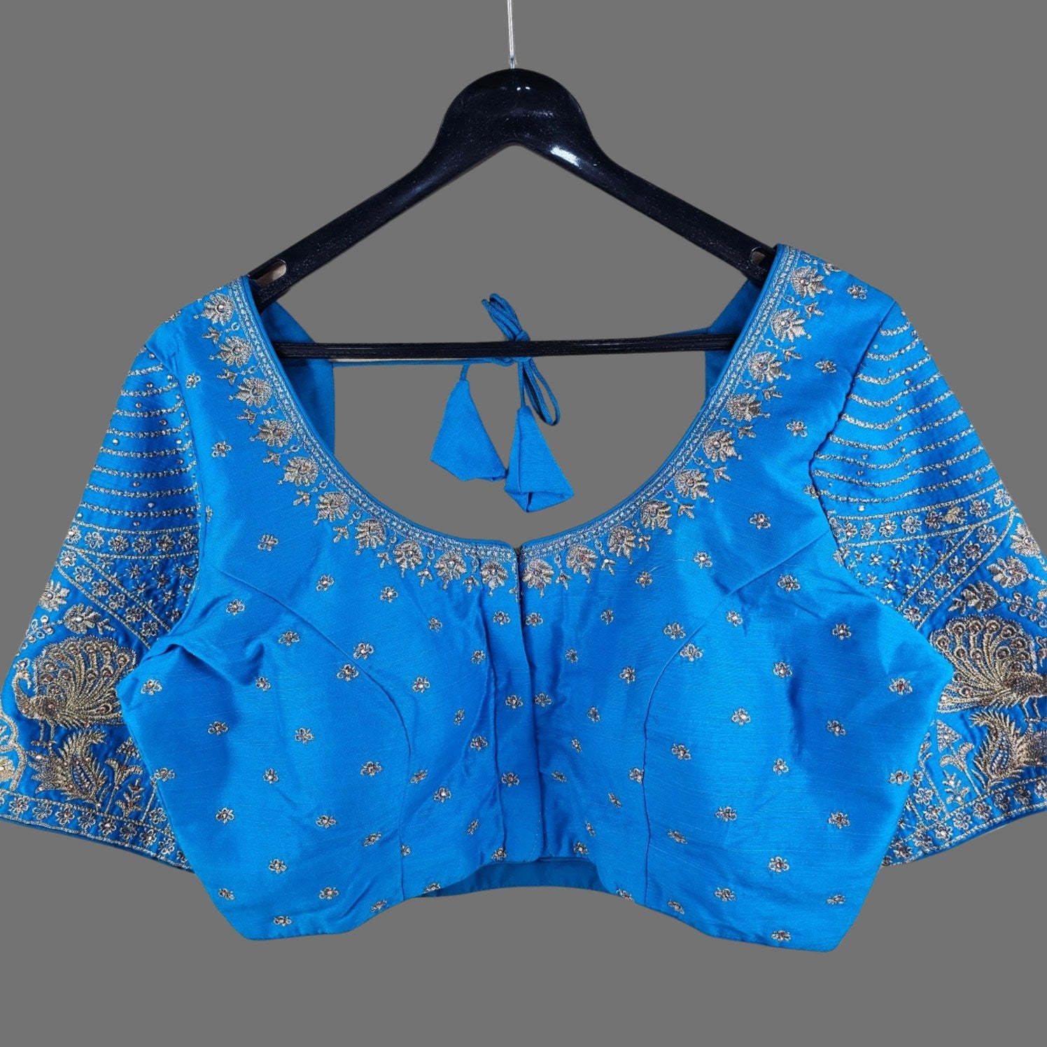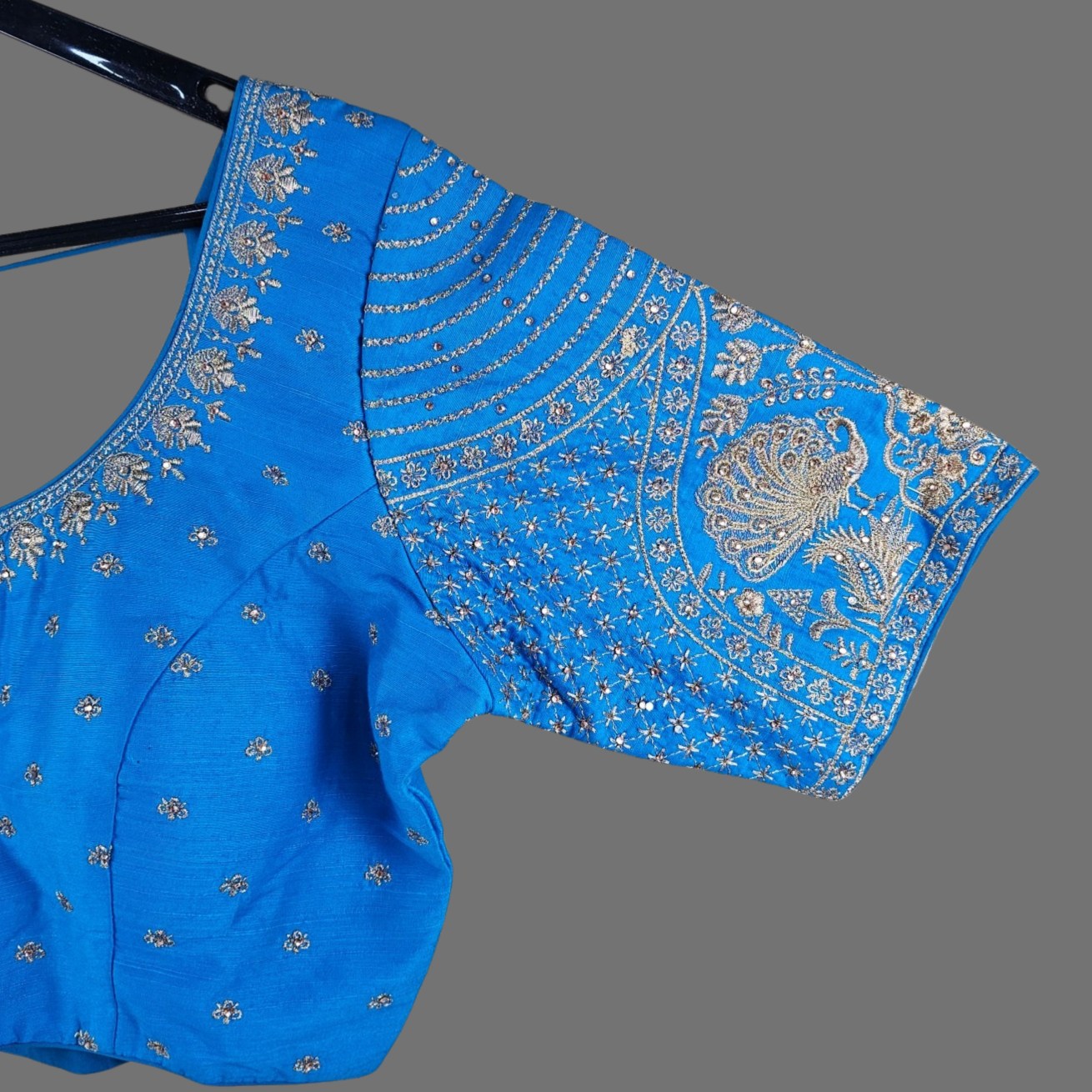 This is an elegant silk blouse adorned with rich zari embroidery and intricate peacock designs on the sleeves. The sky blue tone and classic round neckline and Matka neck at back make them a regal choice and they’re perfect for weddings, receptions, or festive celebrations.