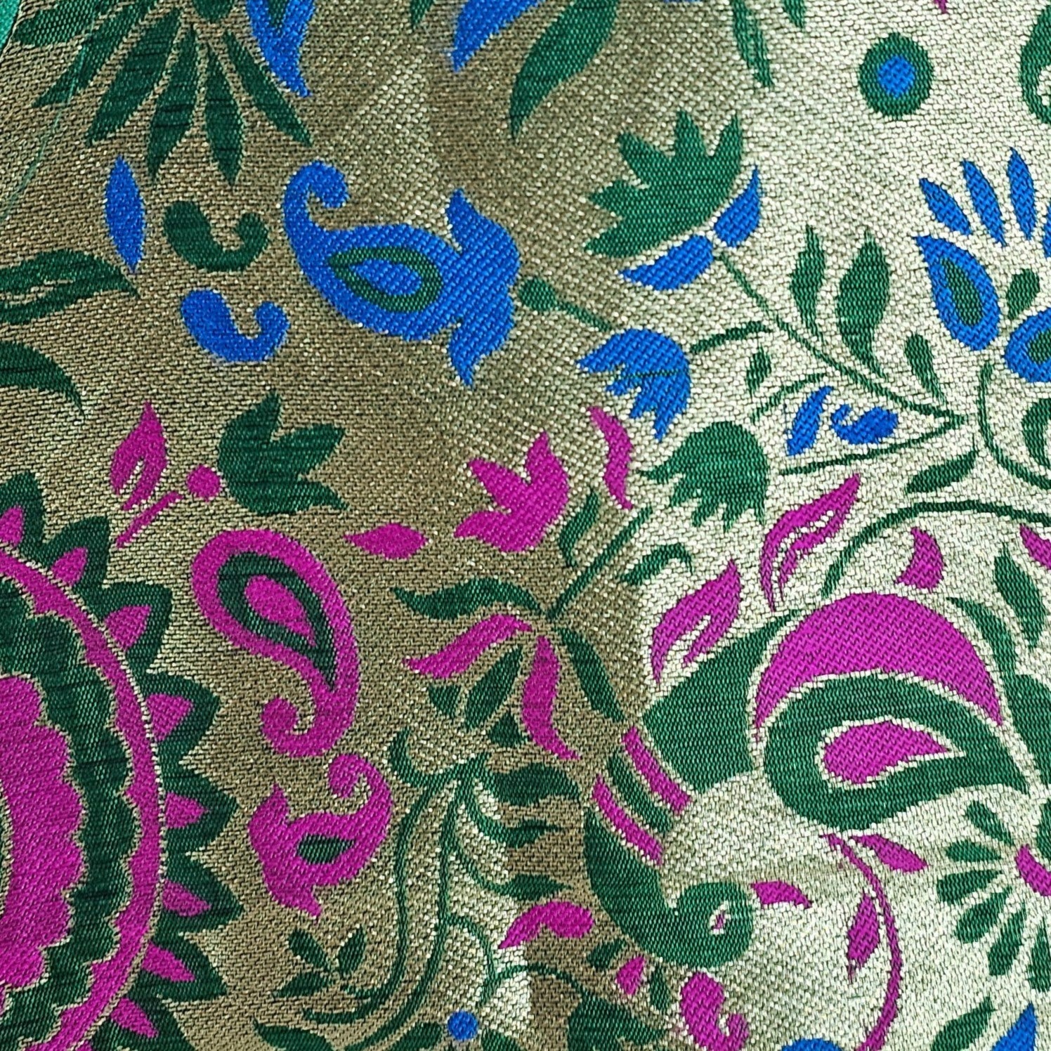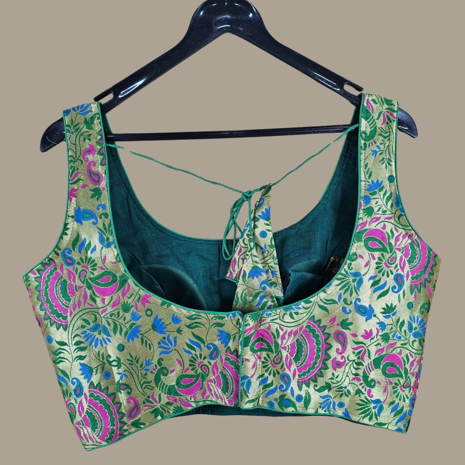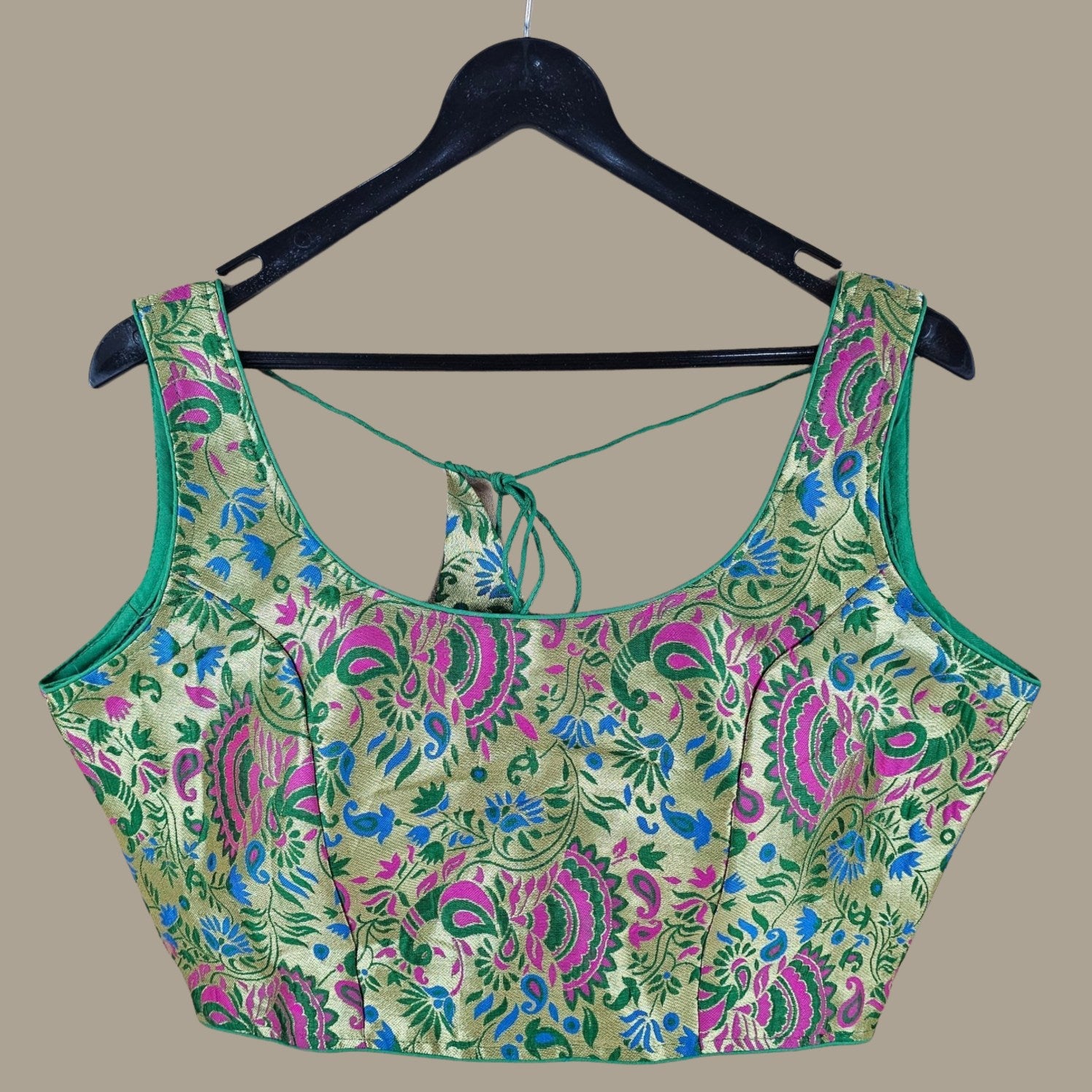 This Paithani blouse showcases the timeless elegance of traditional weaving, adorned with intricate motifs and a rich texture. The classic round neckline enhances its graceful appeal, making it a perfect complement to festive and ethnic ensembles.