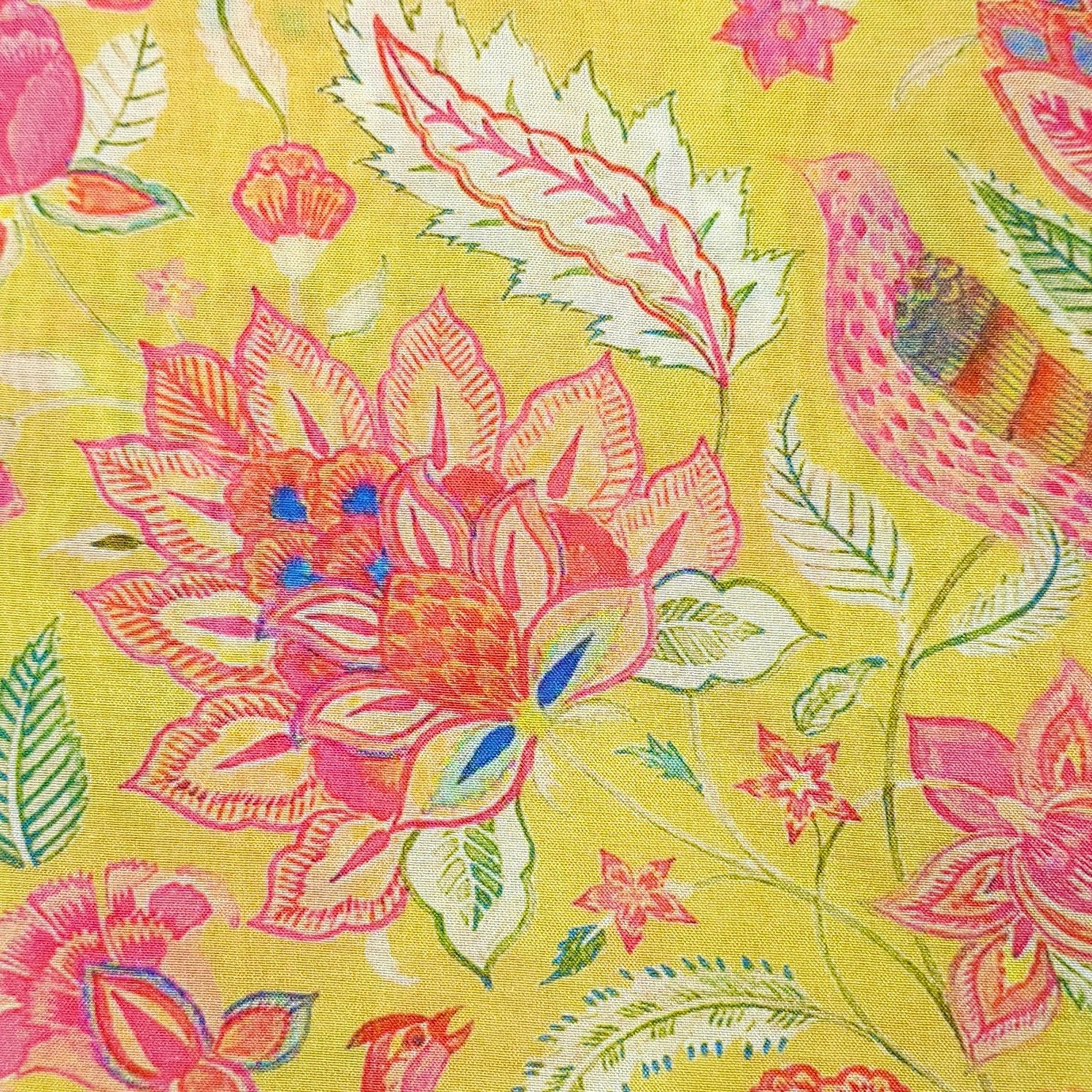 A celebration of nature’s charm, this vibrant pink fabric showcases an enchanting spread of multicolored birds and blooming florals. The detailed digital print in earthy tones and pastel accent and the cheerful tone and artistic pattern lend a joyous and sunny vibe making it ideal for standout ethnic or fusion wear. Perfect for those who adore bold statements with a touch of tradition.