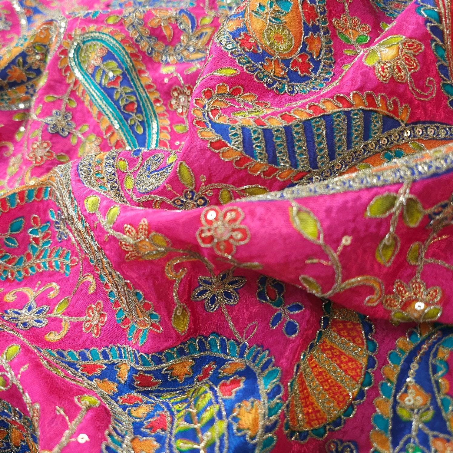 A rich crepe base brought to life with intricate multicolor embroidery, featuring vibrant floral and paisley motifs in shades of yellow, green, blue, and pink. The detailed threadwork is beautifully complemented by shimmering silver zari outlines and delicate sequin accents, adding depth and festive charm. This luxurious fabric blends traditional artistry with bold colors, making it a statement choice for grand ethnic ensembles.