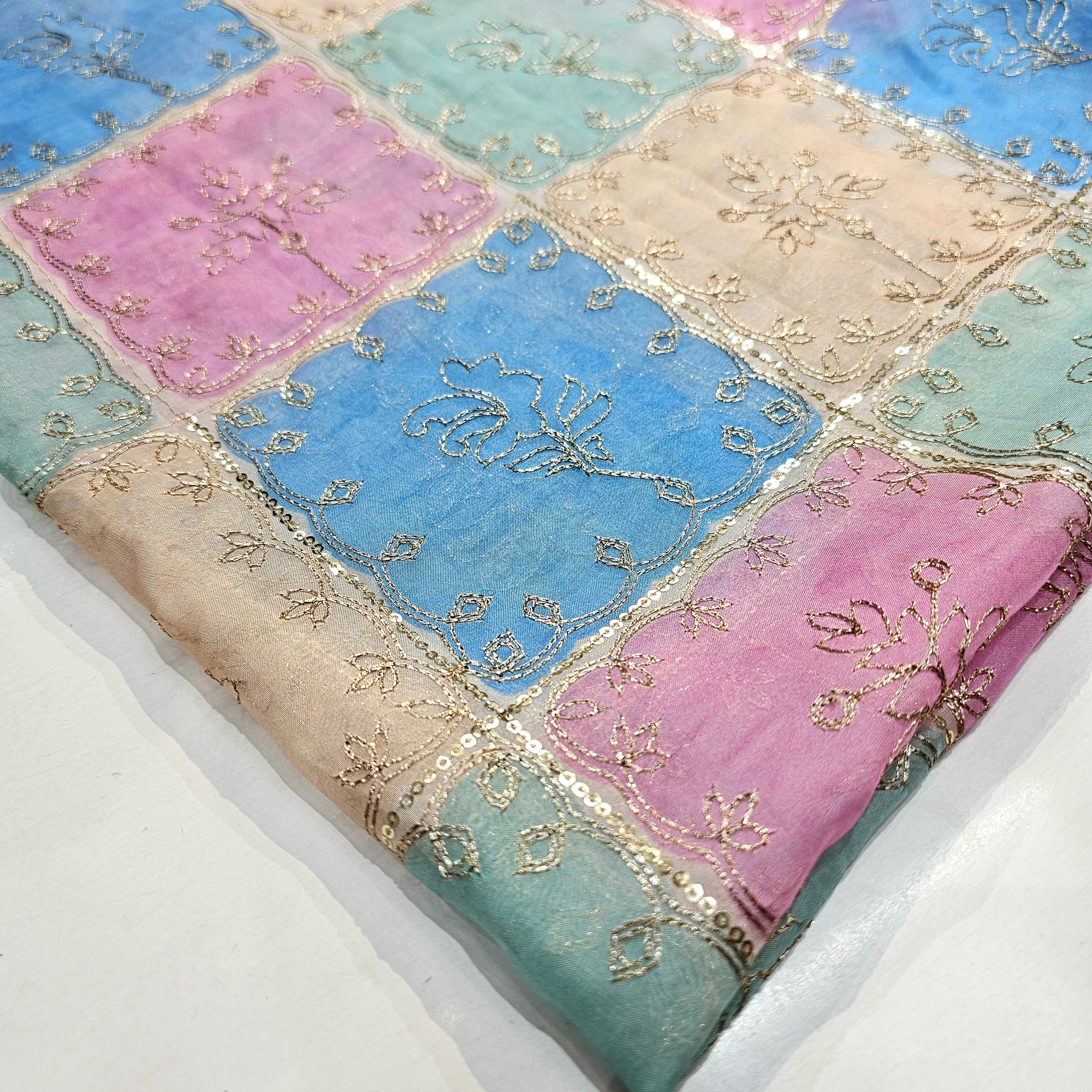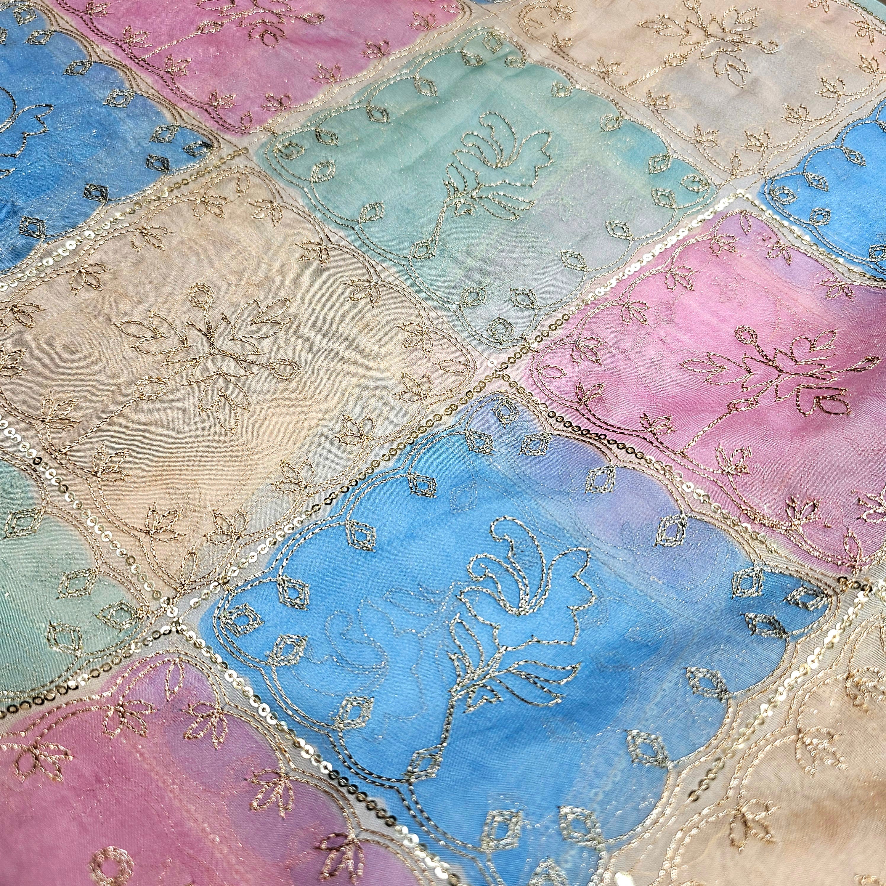 Pastel Colors. Position Print on Organza fabric with sequins and zari work. Ideal for wedding wear, indo western, lehenga, kurta, jackets etc.