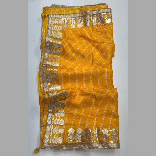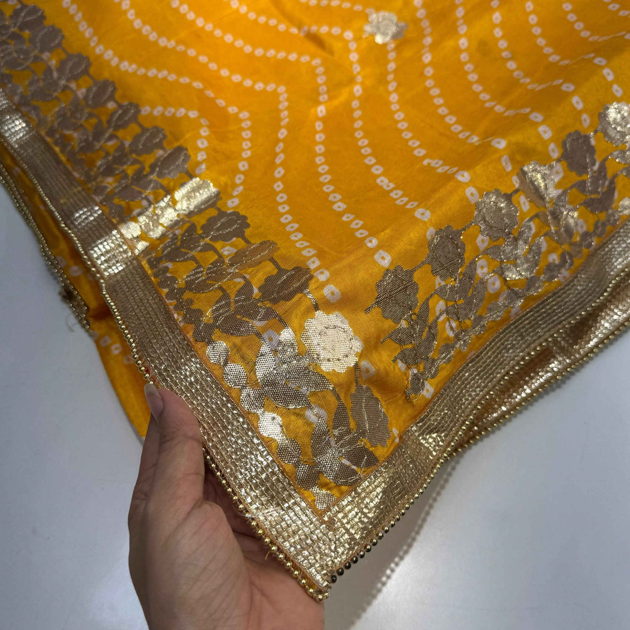 This vibrant Bandhani dupatta on semi silk base captures the essence of traditional Rajasthani artistry with its signature dotted patterns printed in lively hues. Crafted on soft, lightweight fabric, it is accentuated with a shimmering gota patti border that adds a festive touch. The combination of intricate print and gold detailing makes it a perfect accessory to elevate any ethnic outfit—be it a kurta set, lehenga, or saree.
