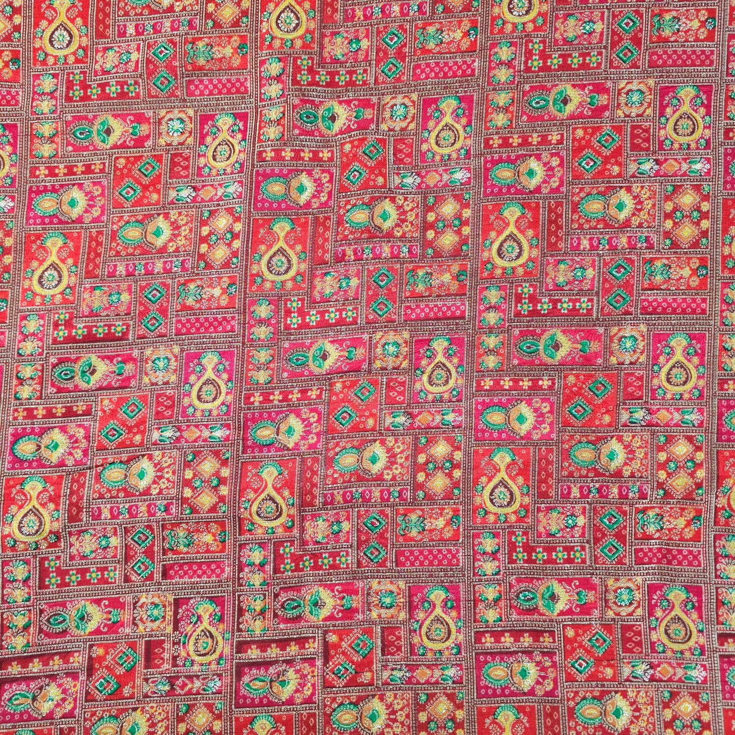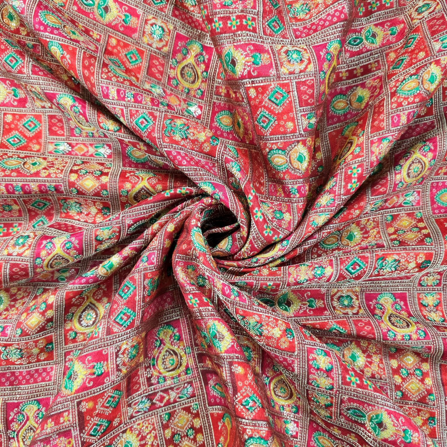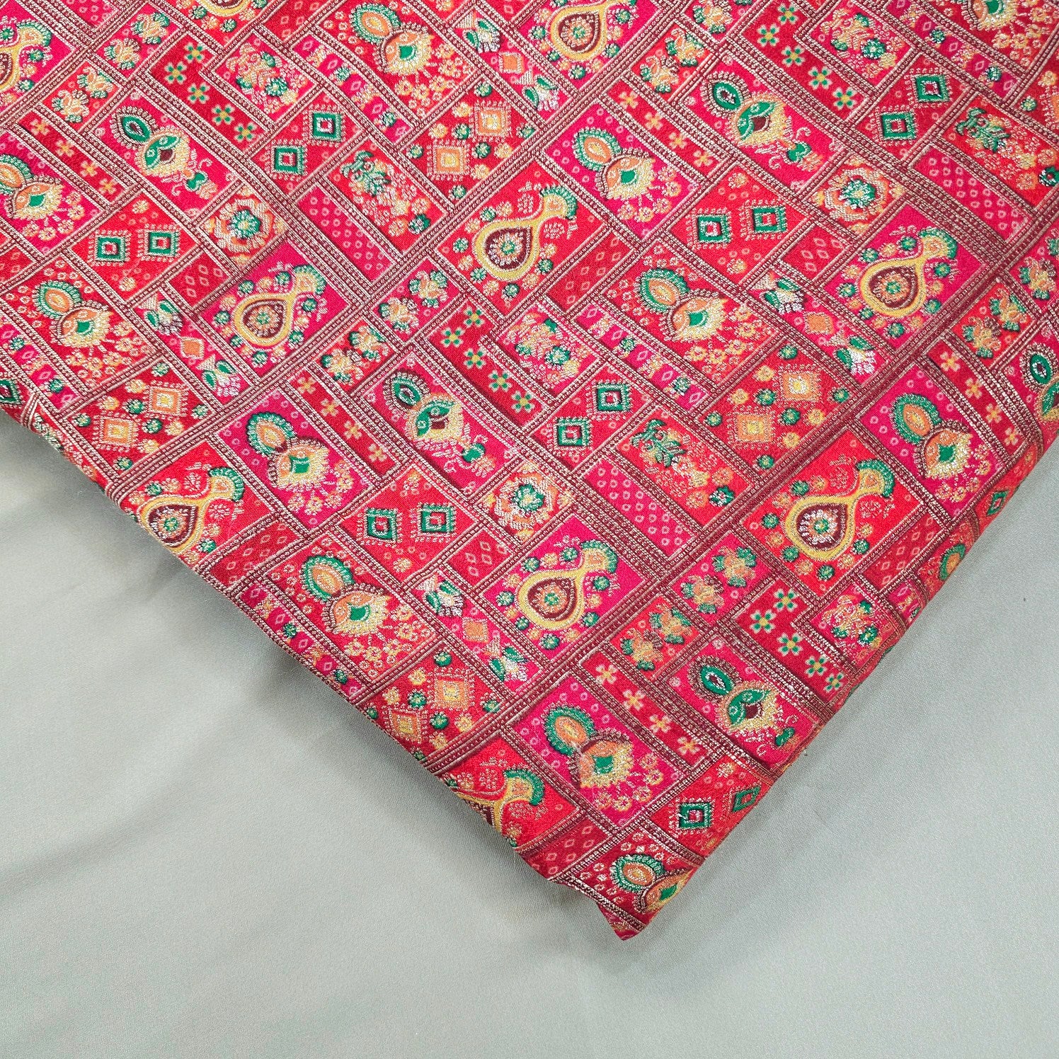A luxurious Banarasi brocade fabric featuring intricate position print and floral motifs woven with fine zari and resham threads. The exquisite weaving technique adds depth and vibrancy, making it a perfect choice for ethnic and festive wear.
