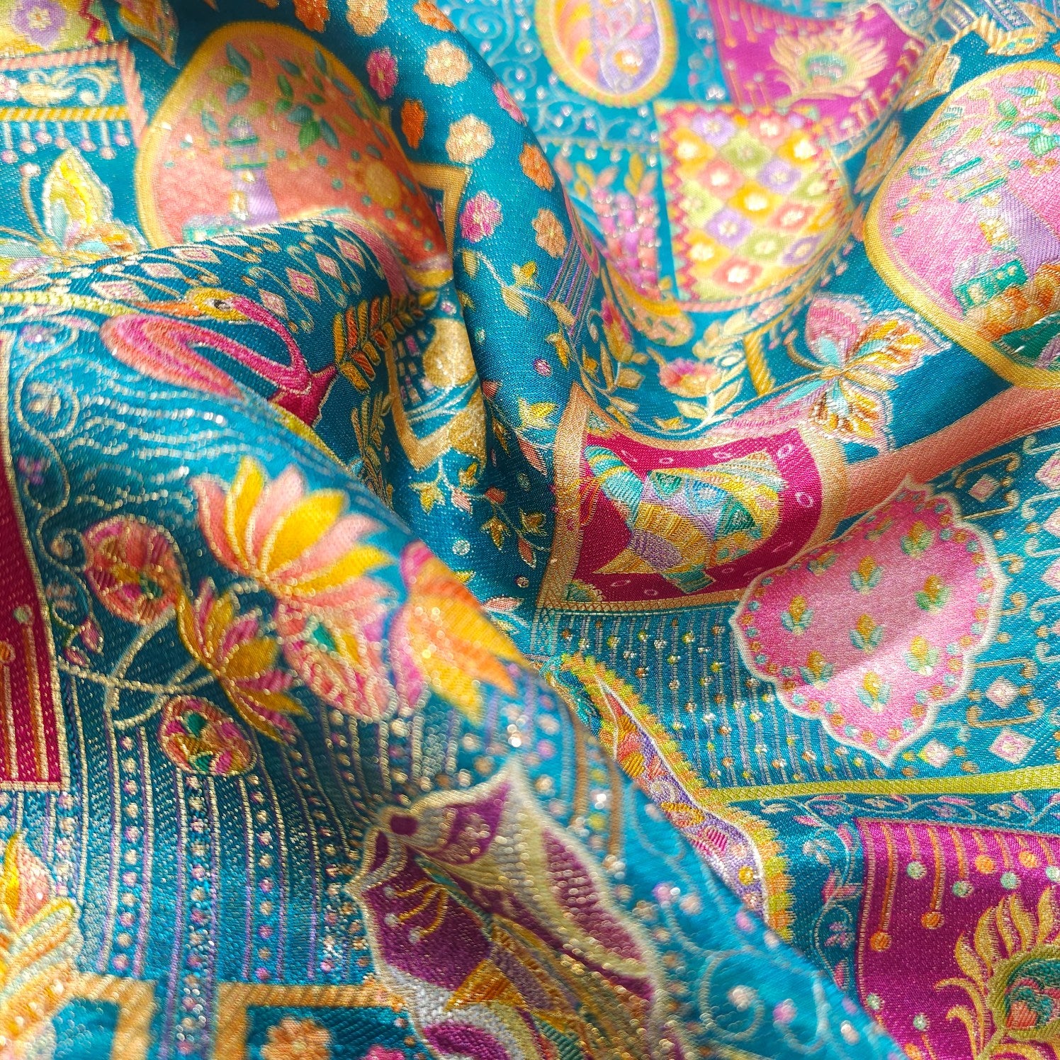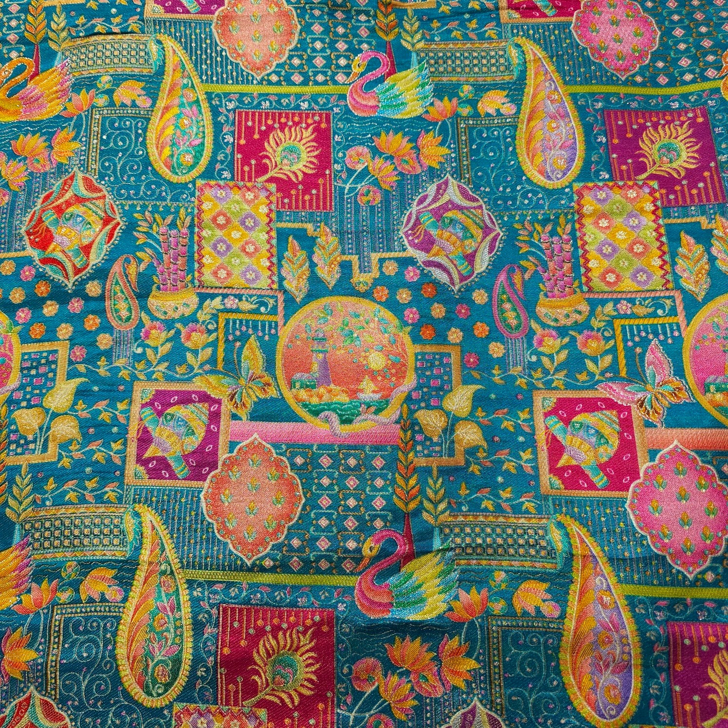 A luxurious Banarasi brocade fabric featuring intricate position print and floral & Swan motifs woven with fine zari and resham threads. The exquisite weaving technique adds depth and vibrancy, making it a perfect choice for ethnic and festive wear.