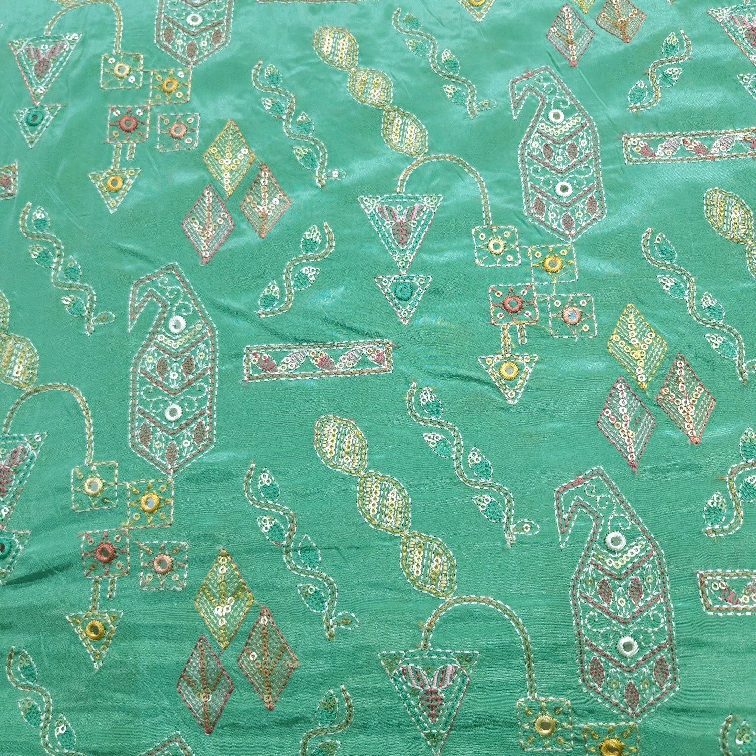 This elegant fabric features embroidery combined with shimmering sequin work on a soft crepe base. The design showcases a beautiful blend of stylized bird figures, geometric patterns, and vine-like details in pastel pink, turquoise, gold, and silver tones.