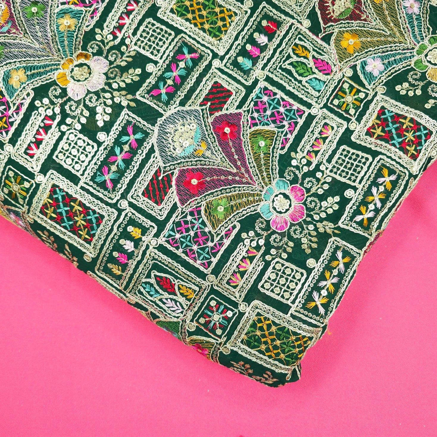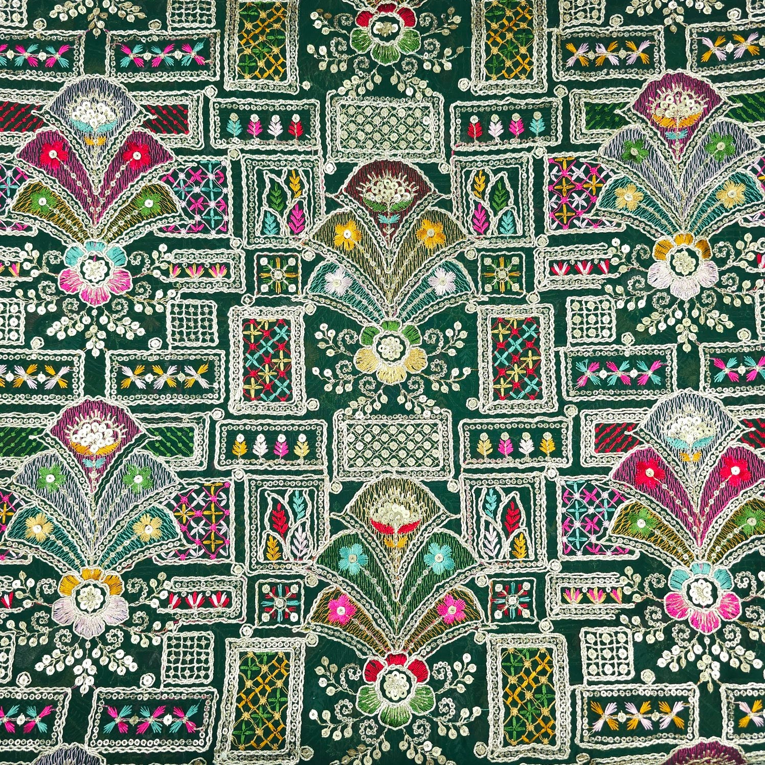 A regal fabric adorned with heritage-inspired multicolor thread embroidery and delicate sequin highlights. The intricate arrangement of floral, paisley, and traditional motifs brings out the timeless elegance of artisanal craftsmanship. Perfect for statement ethnic wear with a luxurious and festive appeal.