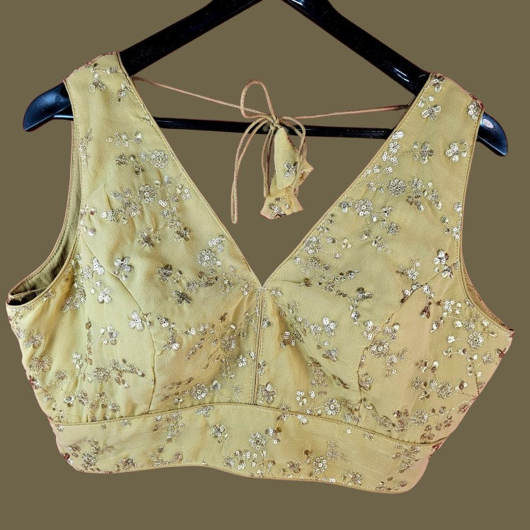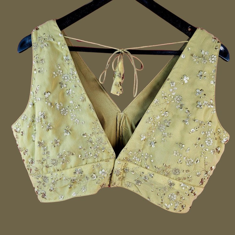 Elegant sequin-embellished blouses, featuring intricate floral patterns exuding a graceful charm with shimmery embellishment. Designed with a flattering deep V-neck and back tie-up detailing, perfect for pairing with traditional or fusion wear.