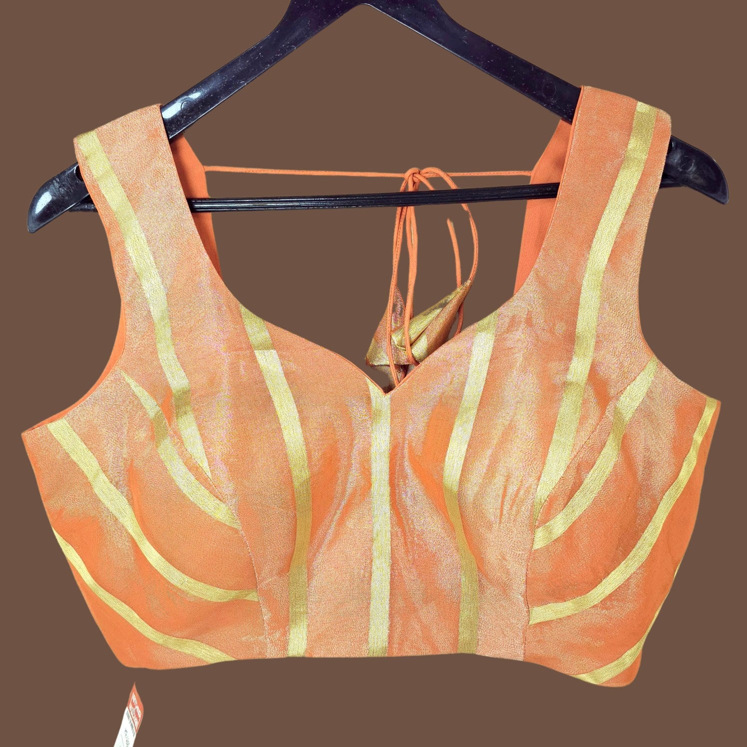 This pastel orange color two-tone blouse features golden panel detailing that adds a modern twist to traditional wear. With its sleeveless cut and deep neckline, it’s perfect for bold festive looks. Ideal for pairing with sarees or lehengas for a stylish statement.