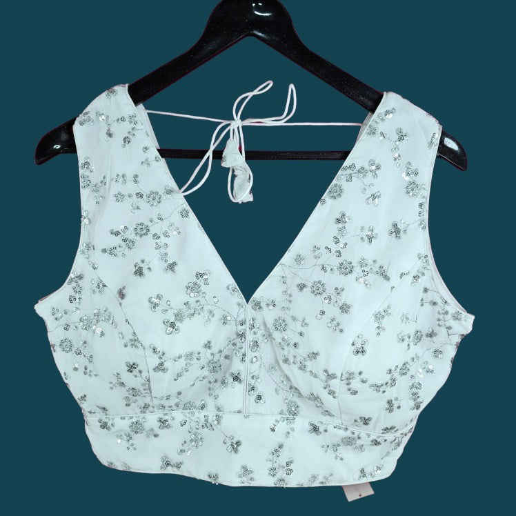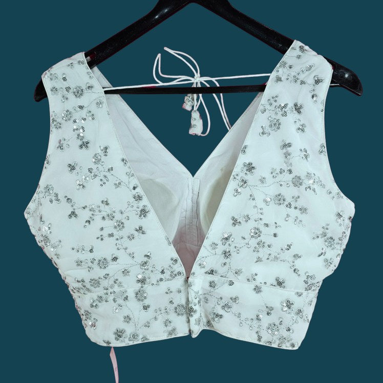 Elegant sequin-embellished blouses, featuring intricate floral patterns exuding a graceful charm with shimmery embellishment. Designed with a flattering deep V-neck and back tie-up detailing, perfect for pairing with traditional or fusion wear.