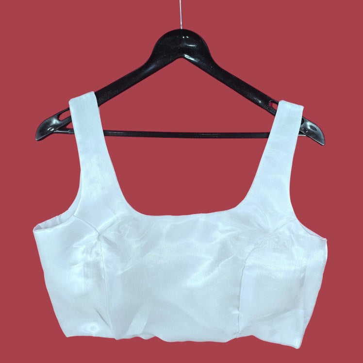 This sleeveless satin blouse exudes a sleek and sophisticated charm with its smooth, lustrous finish. The square neckline adds a modern touch, making it a versatile choice for both contemporary and traditional ensembles.