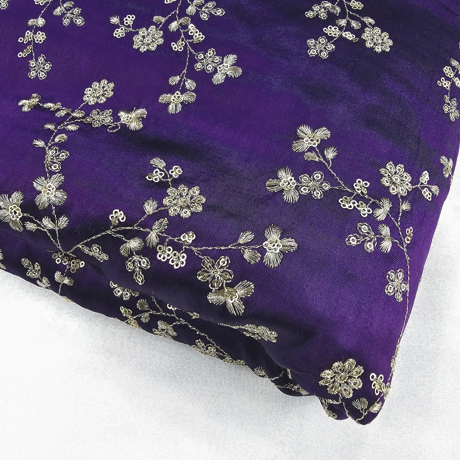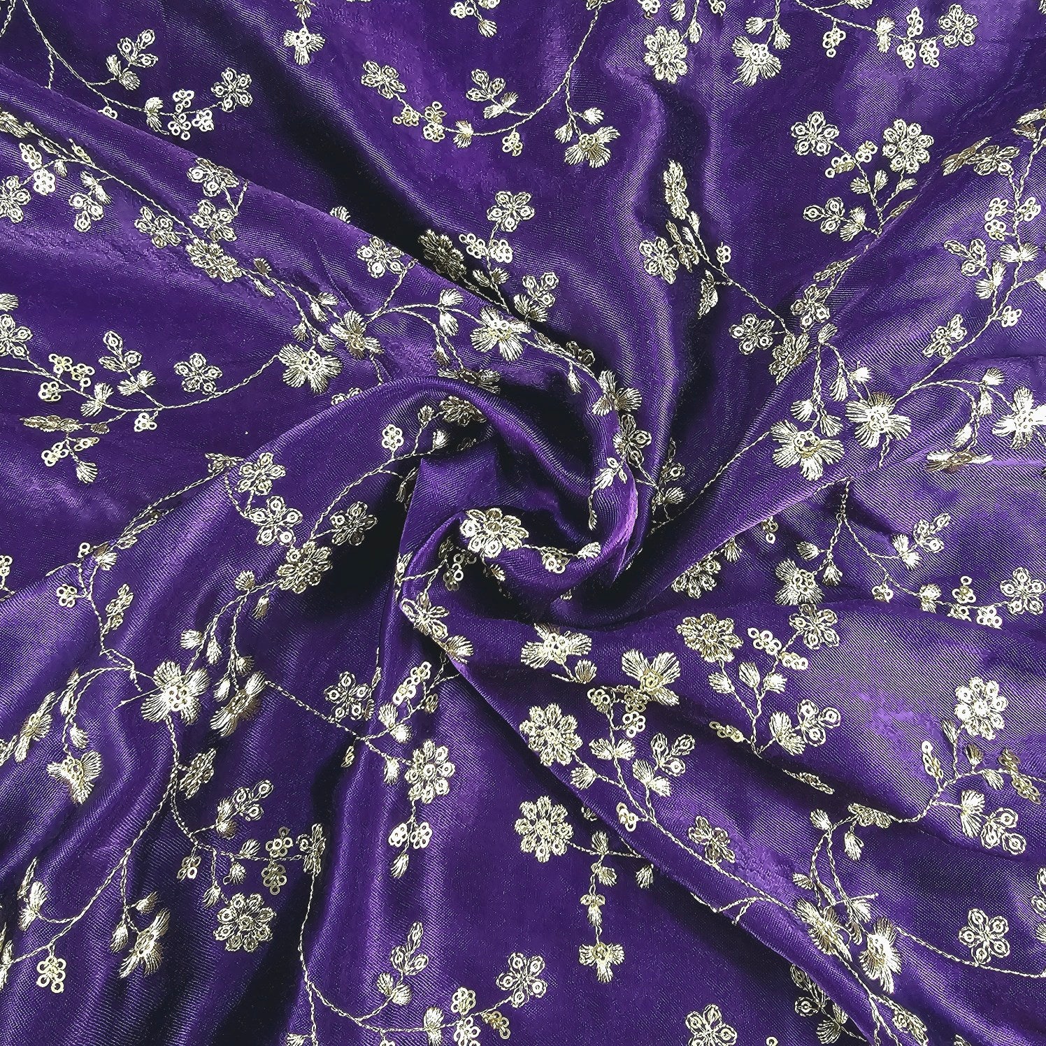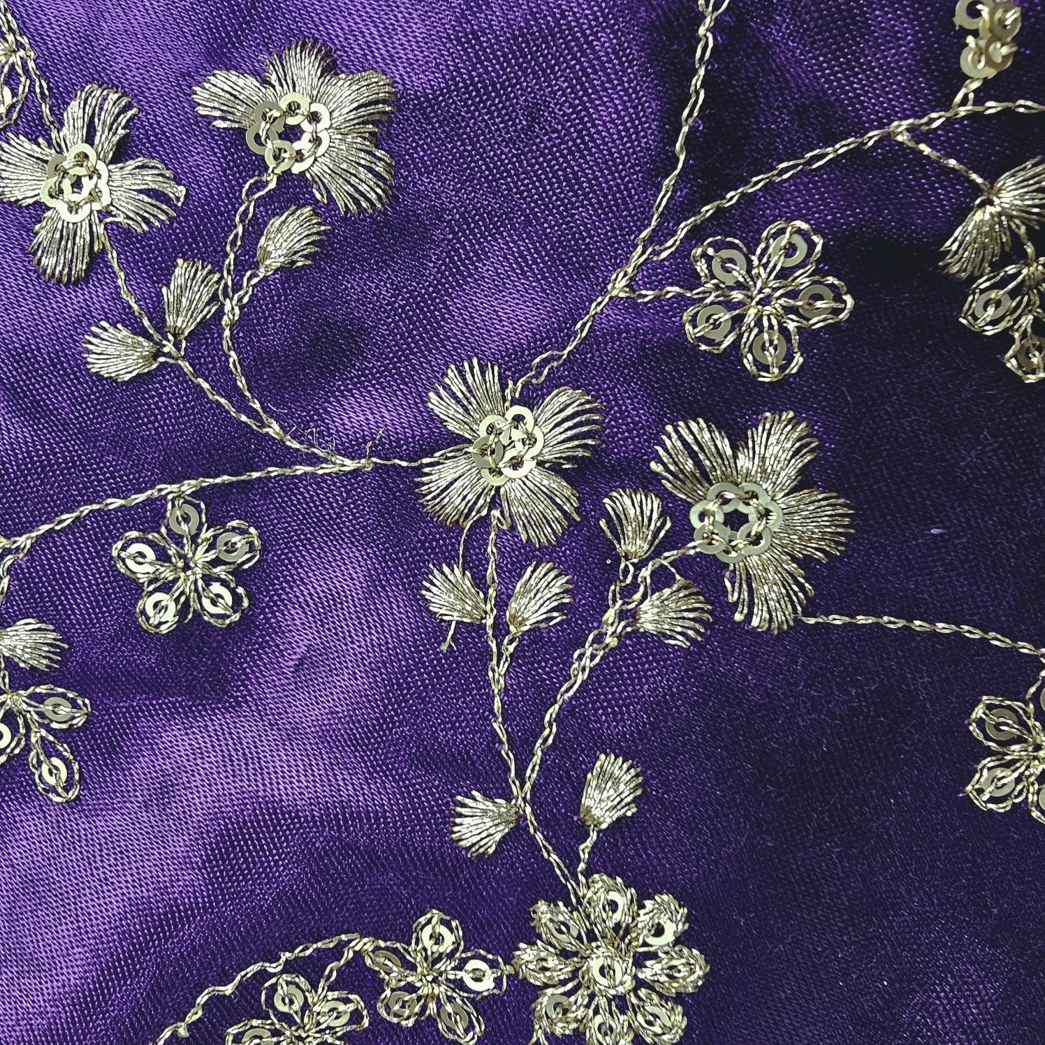 Luxurious Gajji silk fabric, adorned with intricate zari floral embroidery. The soft, smooth texture of Gajji silk offers a graceful drape, while the delicate shimmer of the golden threadwork enhances its royal appeal. Perfect for ethnic ensembles like lehengas, dupattas, and blouses for festive and bridal occasions.