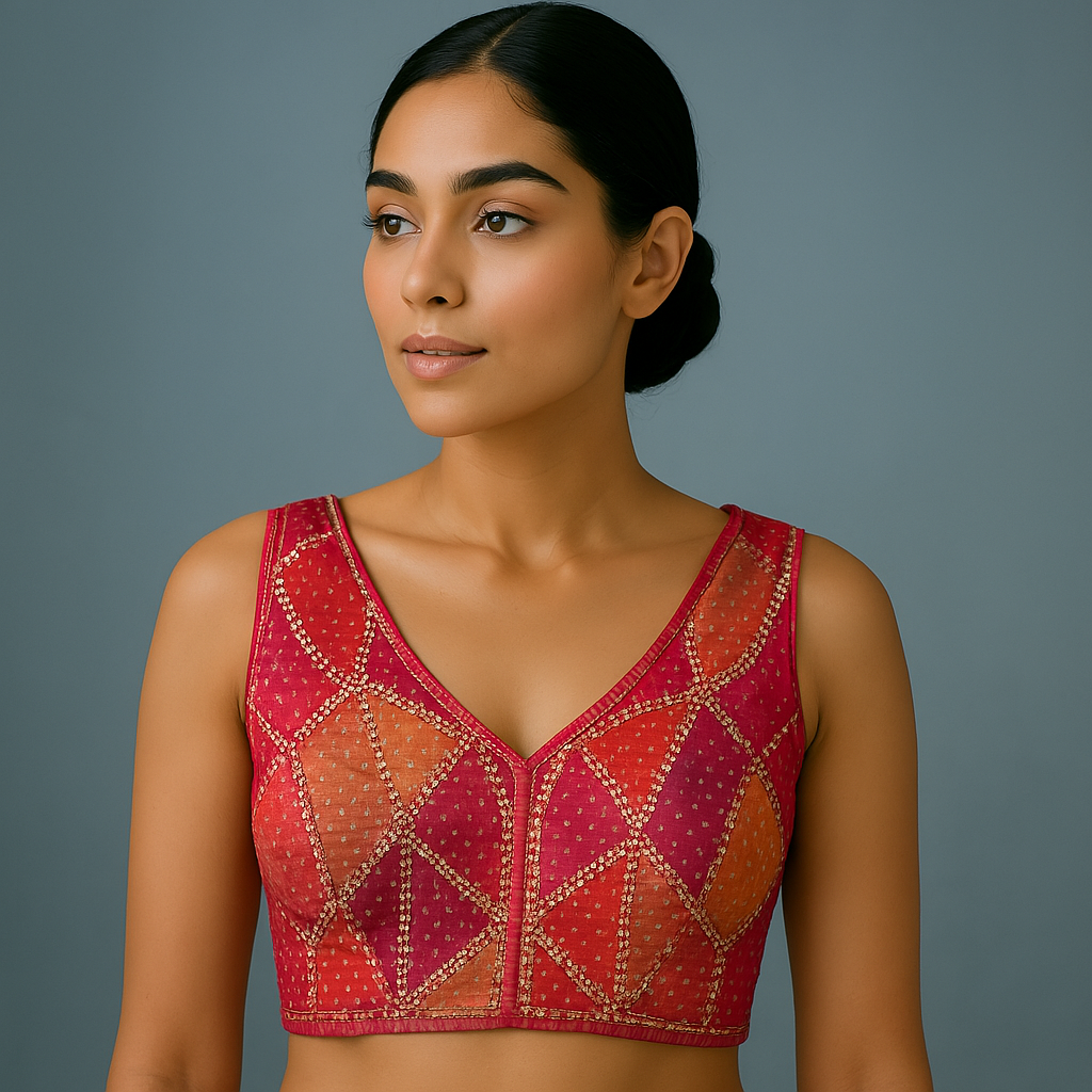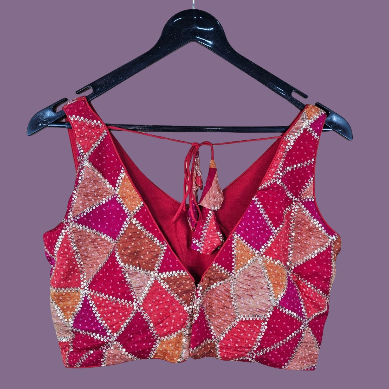 This is vibrant sequin-embellished blouse featuring a mosaic-style patch pattern in jewel tones. The sleeveless design and deep neckline add a modern edge, making them ideal for festive evenings, mehendi functions, or statement party looks.