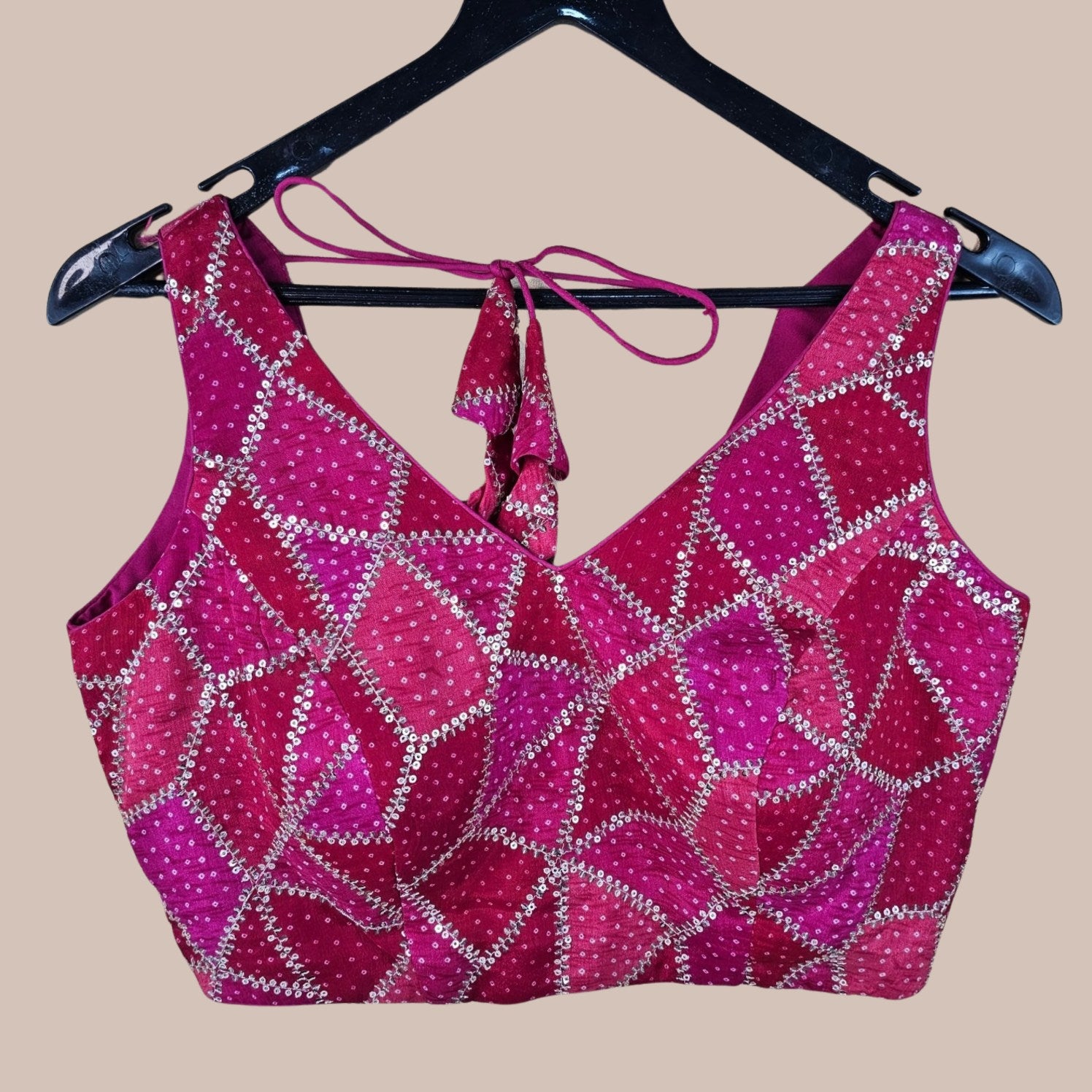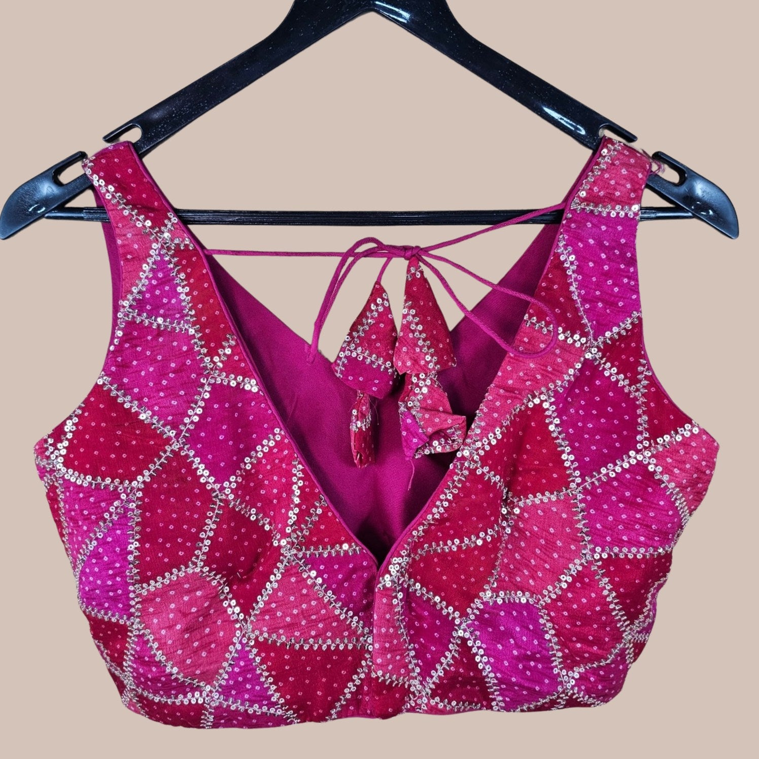 This is vibrant sequin-embellished blouse featuring a mosaic-style patch pattern in jewel tones. The sleeveless design and deep neckline add a modern edge, making them ideal for festive evenings, mehendi functions, or statement party looks.