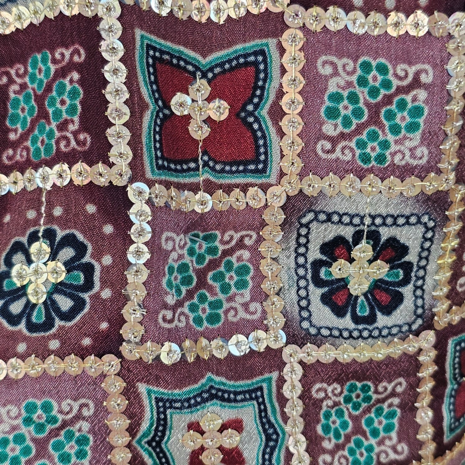 This blouses features a vibrant patch-style pattern in bandhani print with floral touches, and a sequin-embellishement with a sleeveless design and sweetheart neckline. The patchwork-style print in shades of Wine & Green Color adds a festive charm, making them ideal for mehendi, haldi, or colorful celebrations.
