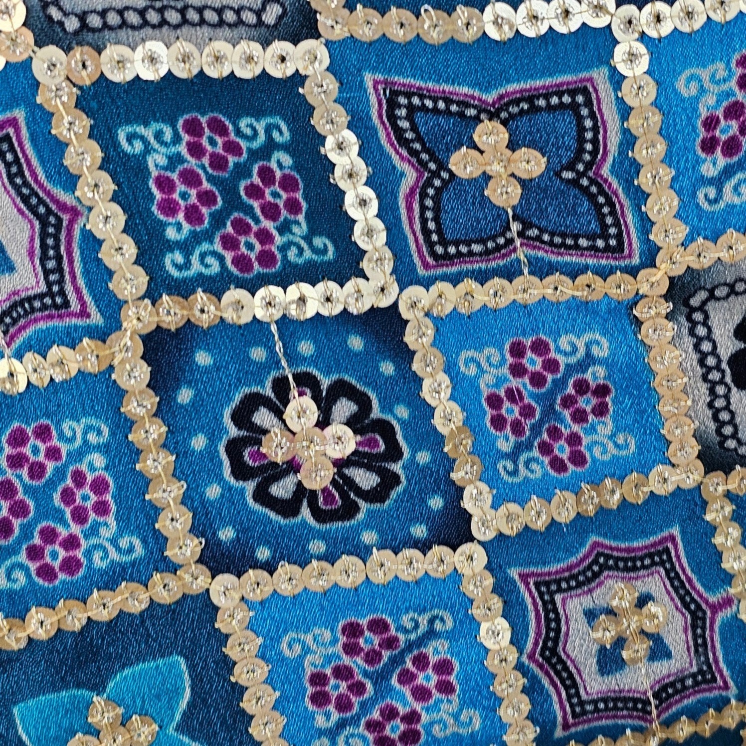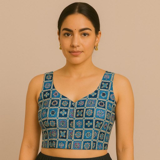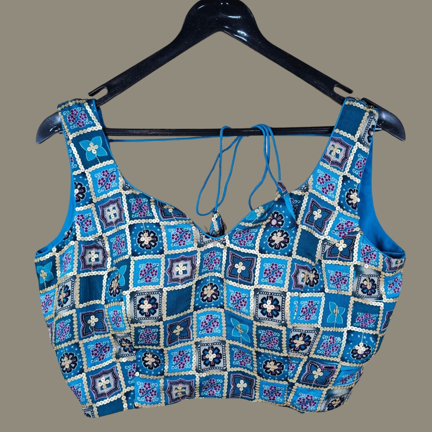 This blouses features a vibrant patch-style pattern in bandhani print with floral touches, and a sequin-embellishement with a sleeveless design and sweetheart neckline. The patchwork-style print in shades of bright blue and sea blue color adds a festive charm, making them ideal for mehendi, haldi, or colorful celebrations.