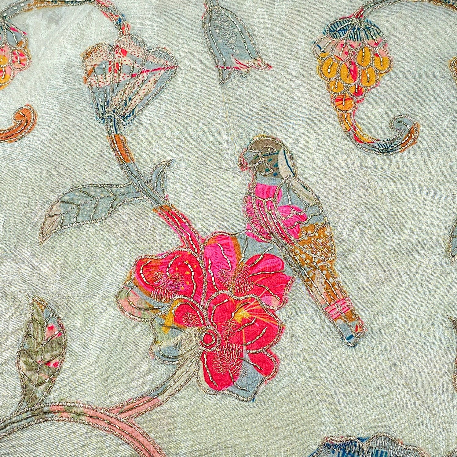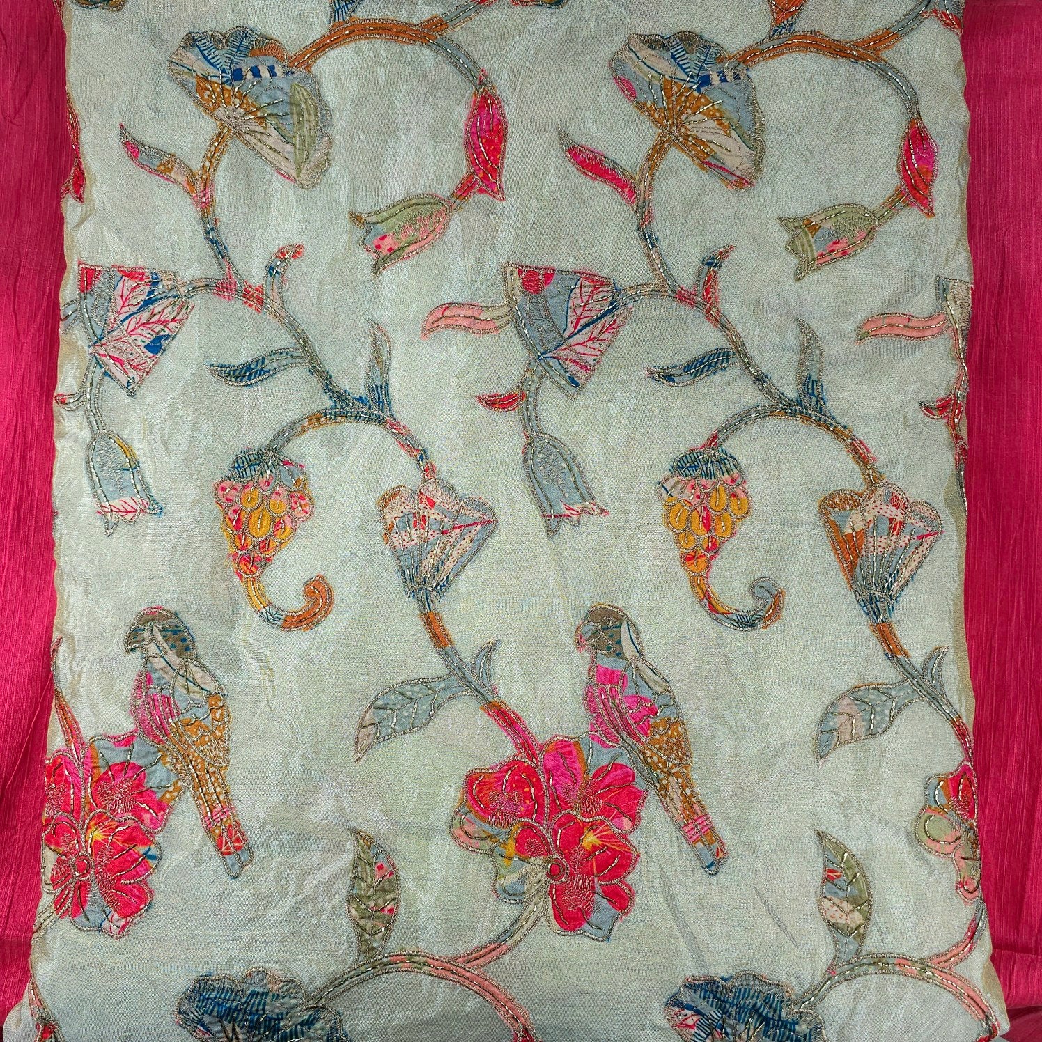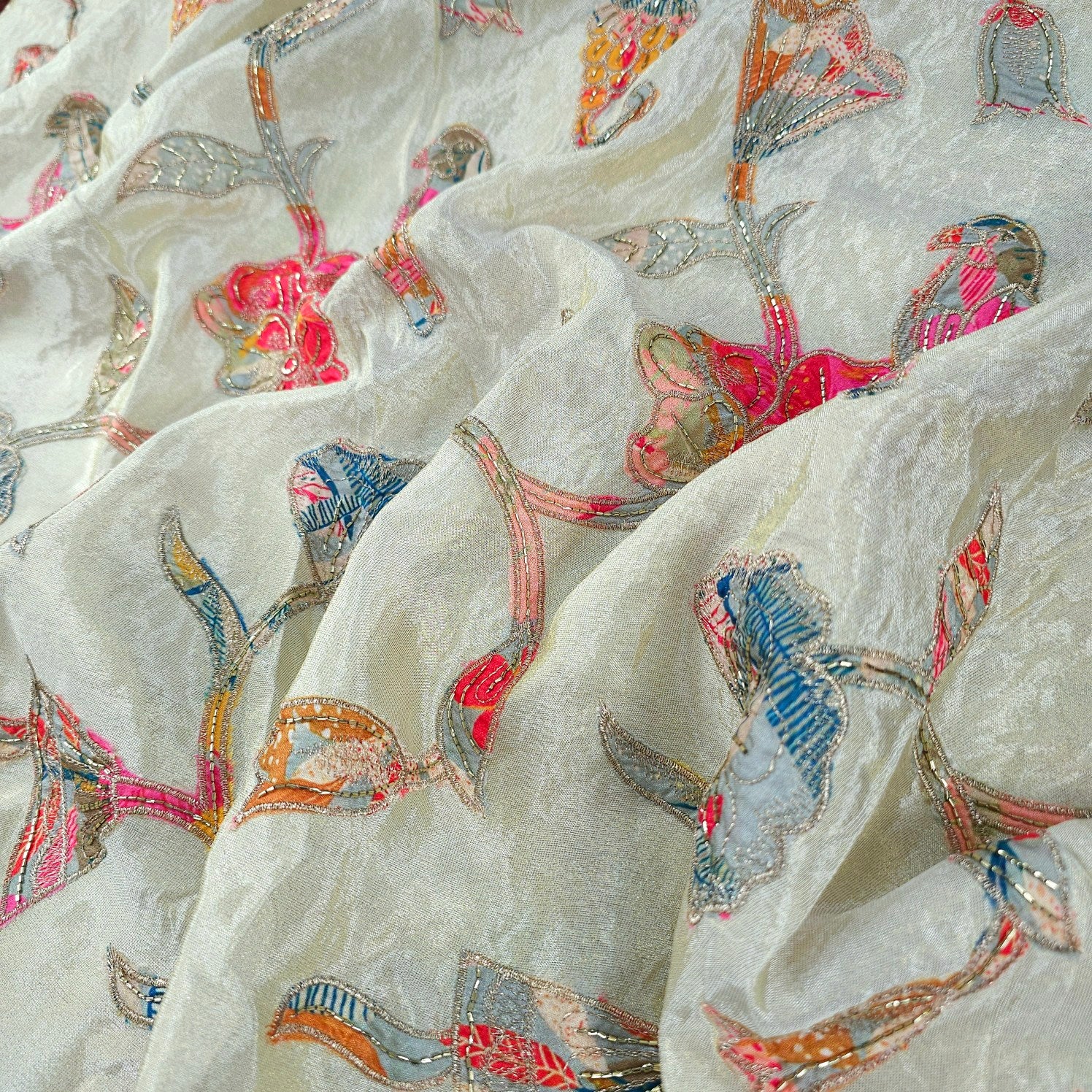 A stunning designer fabric featuring intricate floral & bird patchwork, multi-color thread embroidery, and delicate sequin embellishments on a soft base. The vibrant floral patterns are outlined with fine cord detailing, creating a three-dimensional effect that adds texture and charm. Perfect for festive and statement ensembles, this fabric blends traditional craftsmanship with a contemporary appeal.