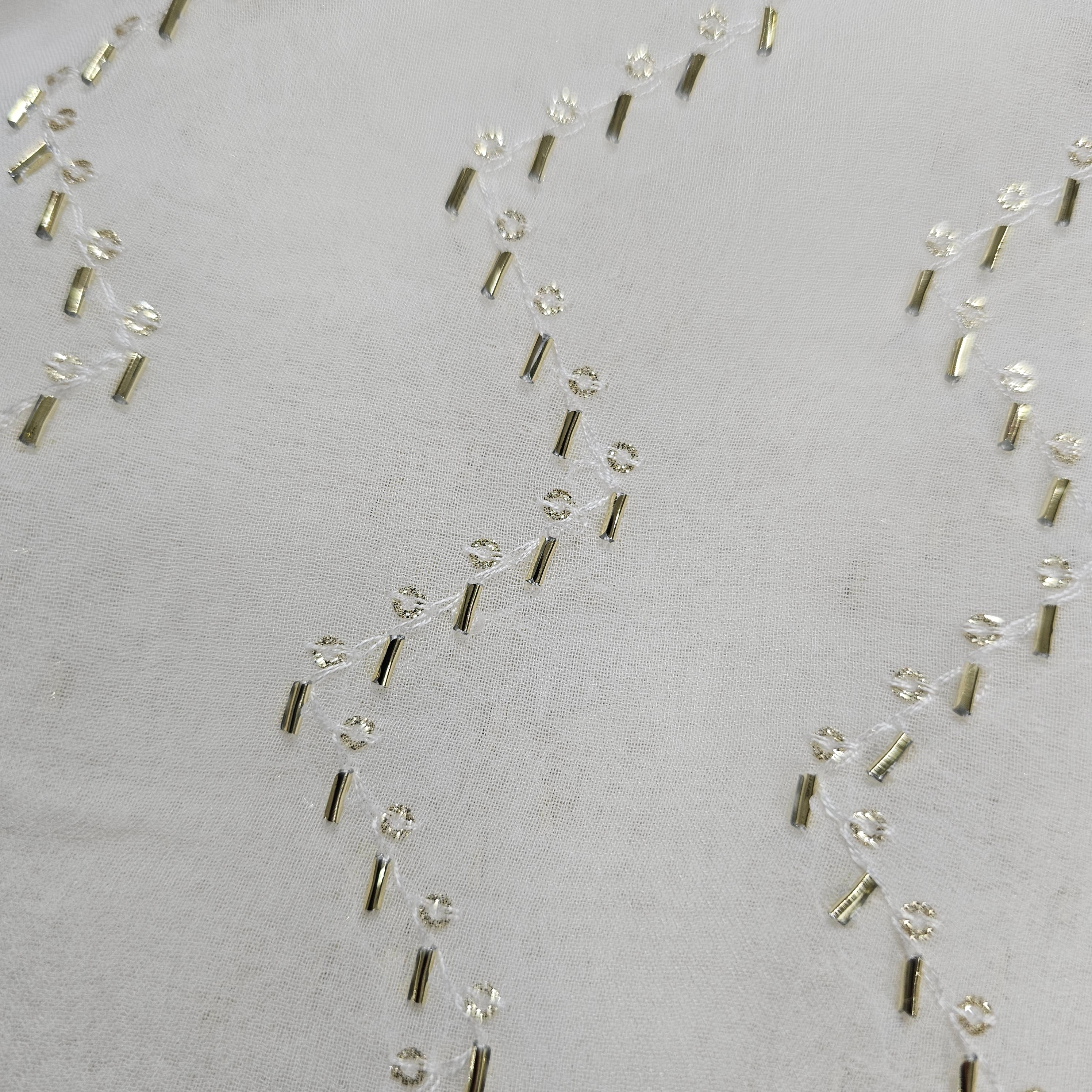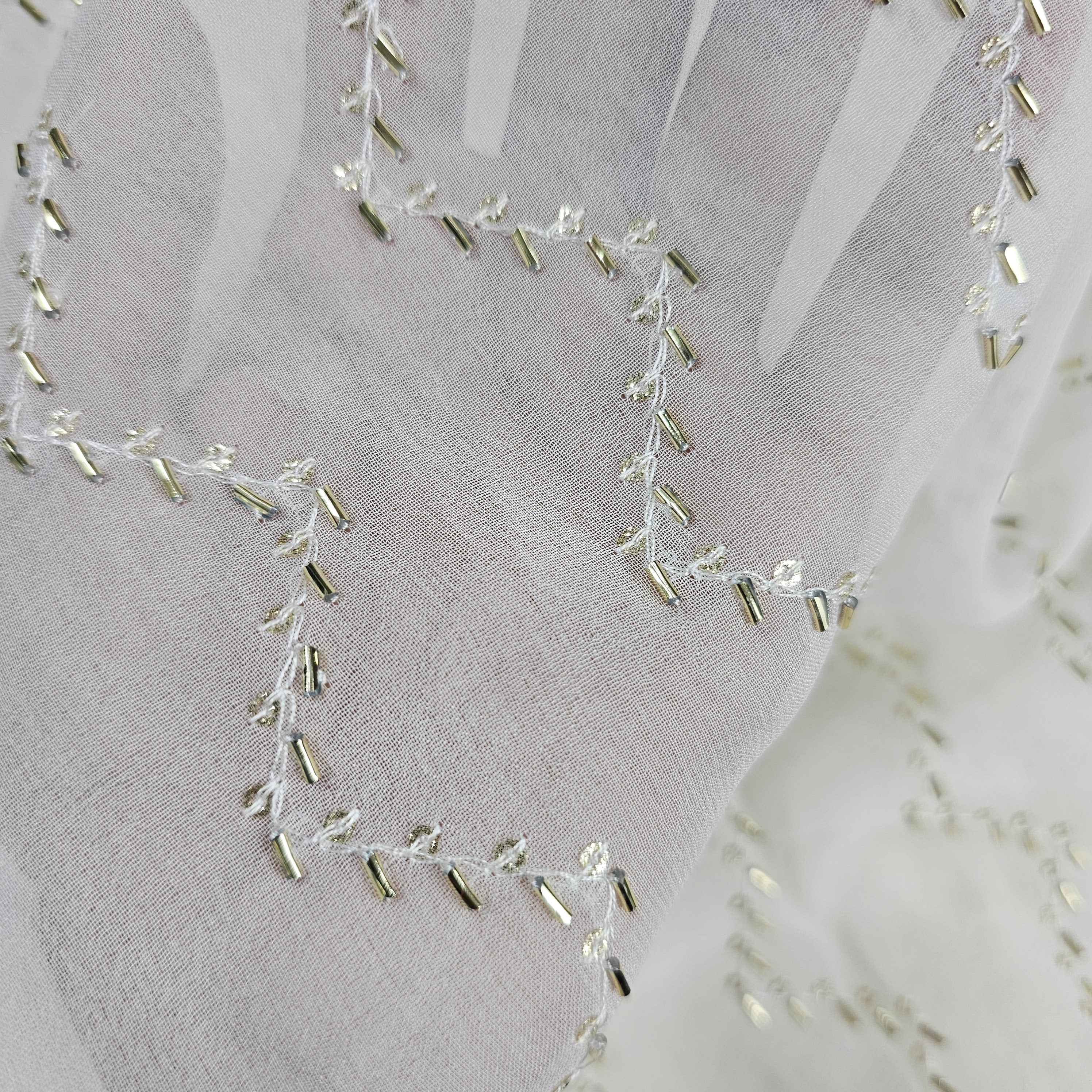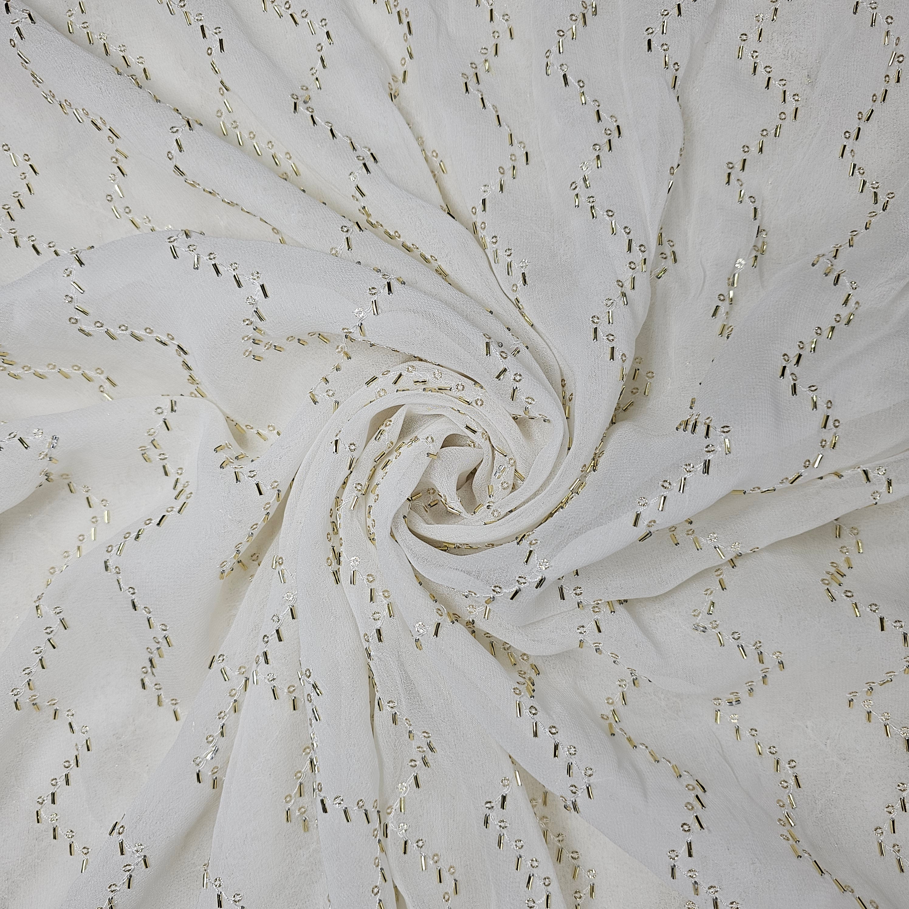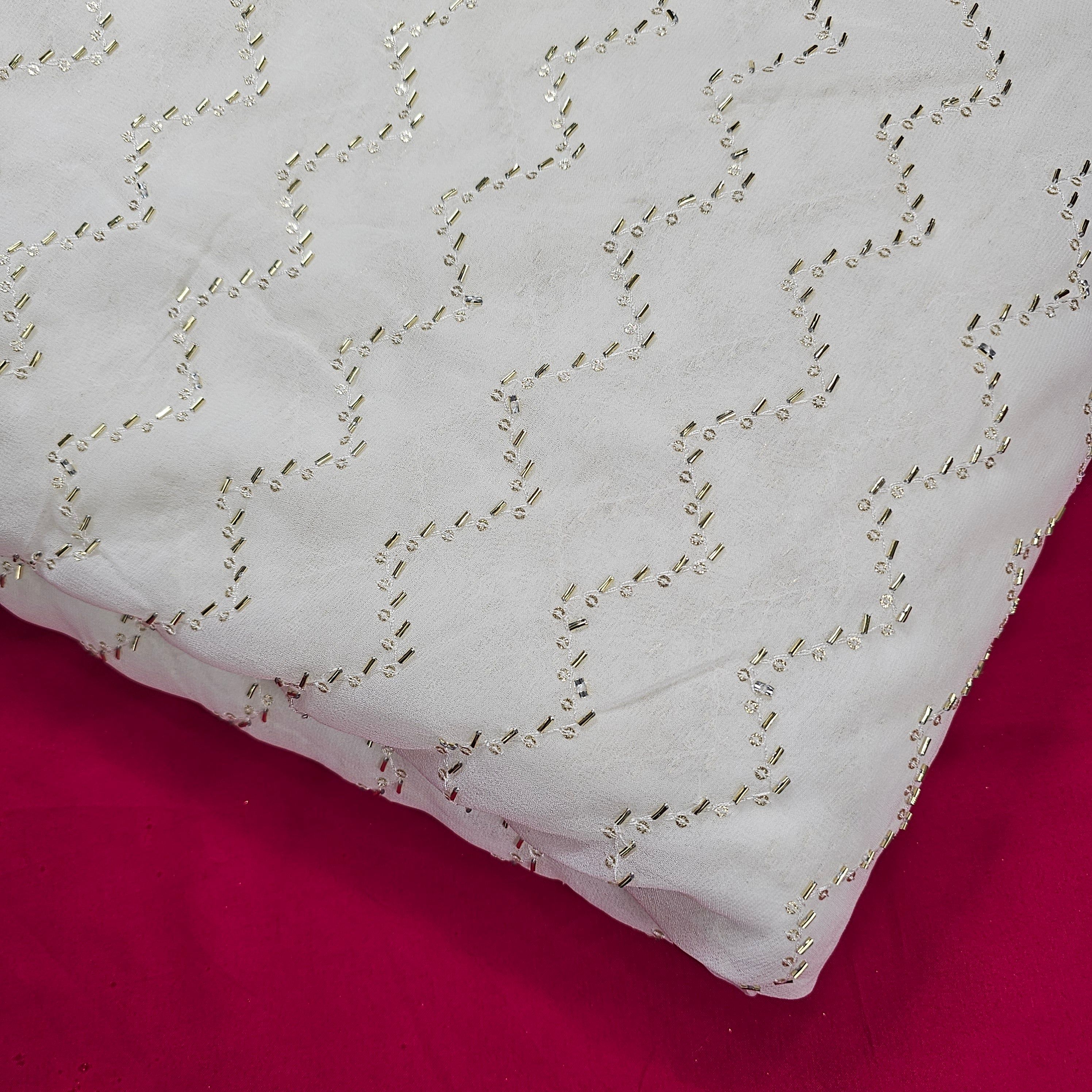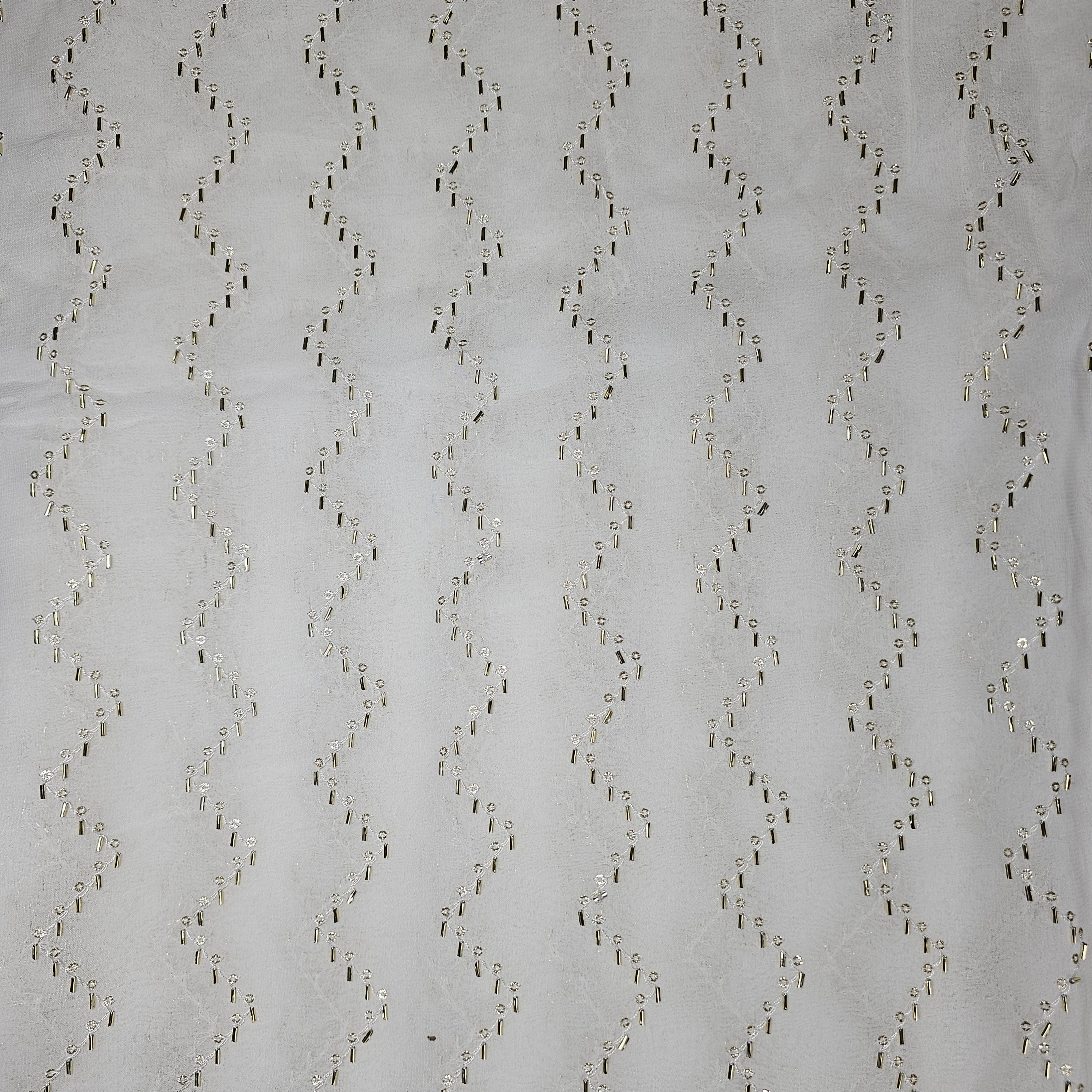 A lightweight dyeable georgette fabric adorned with shimmering zigzag sequin embroidery that add structure to any garment. The zigzag design gives it a modern aesthetic while maintaining a traditional shimmer, perfect for festive or evening wear. The embroidery runs throughout the fabric, enhancing fluid drapes and stylish silhouettes.