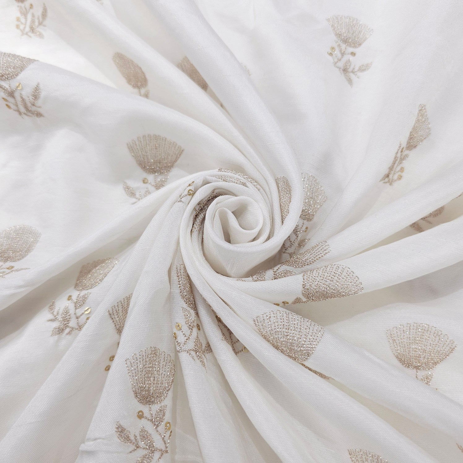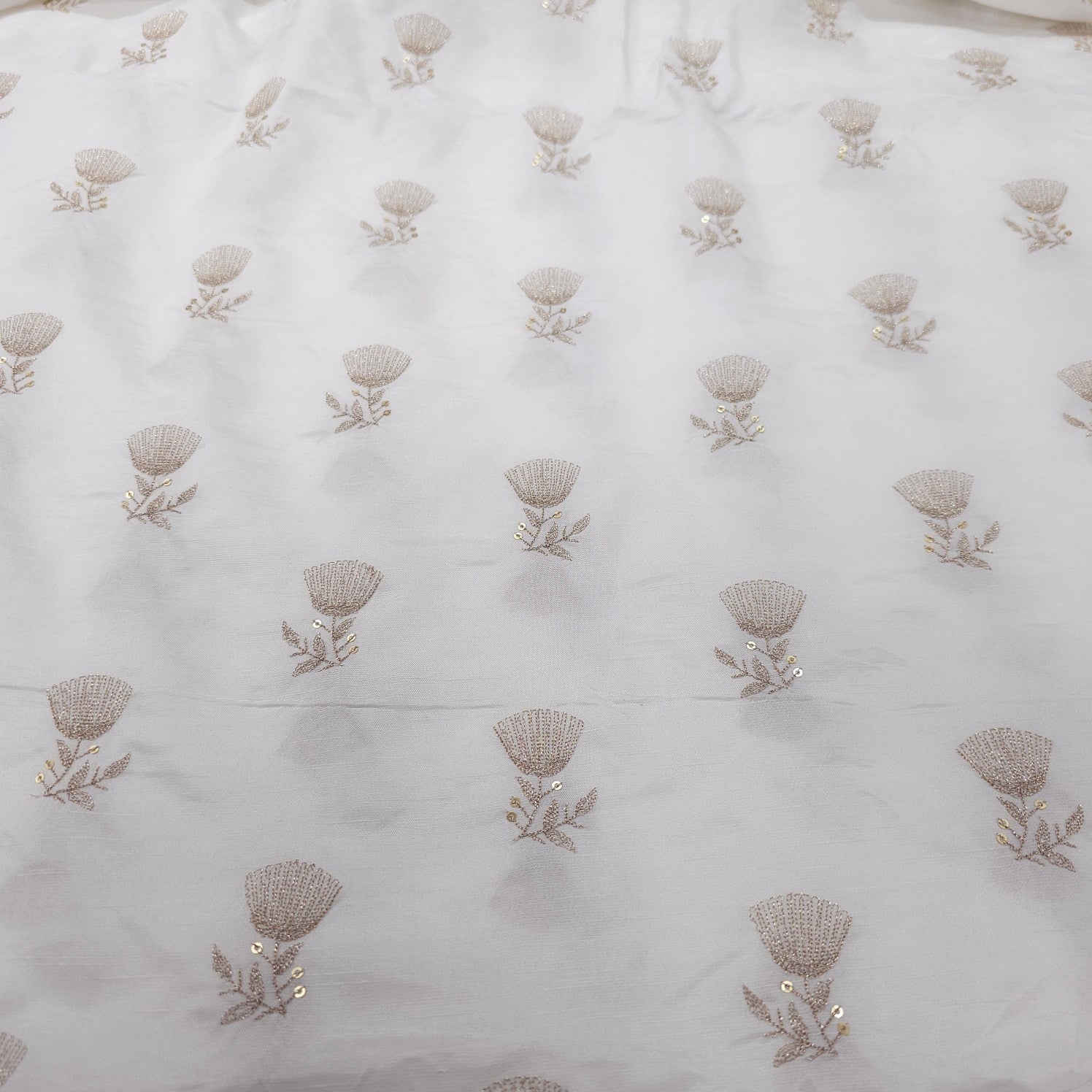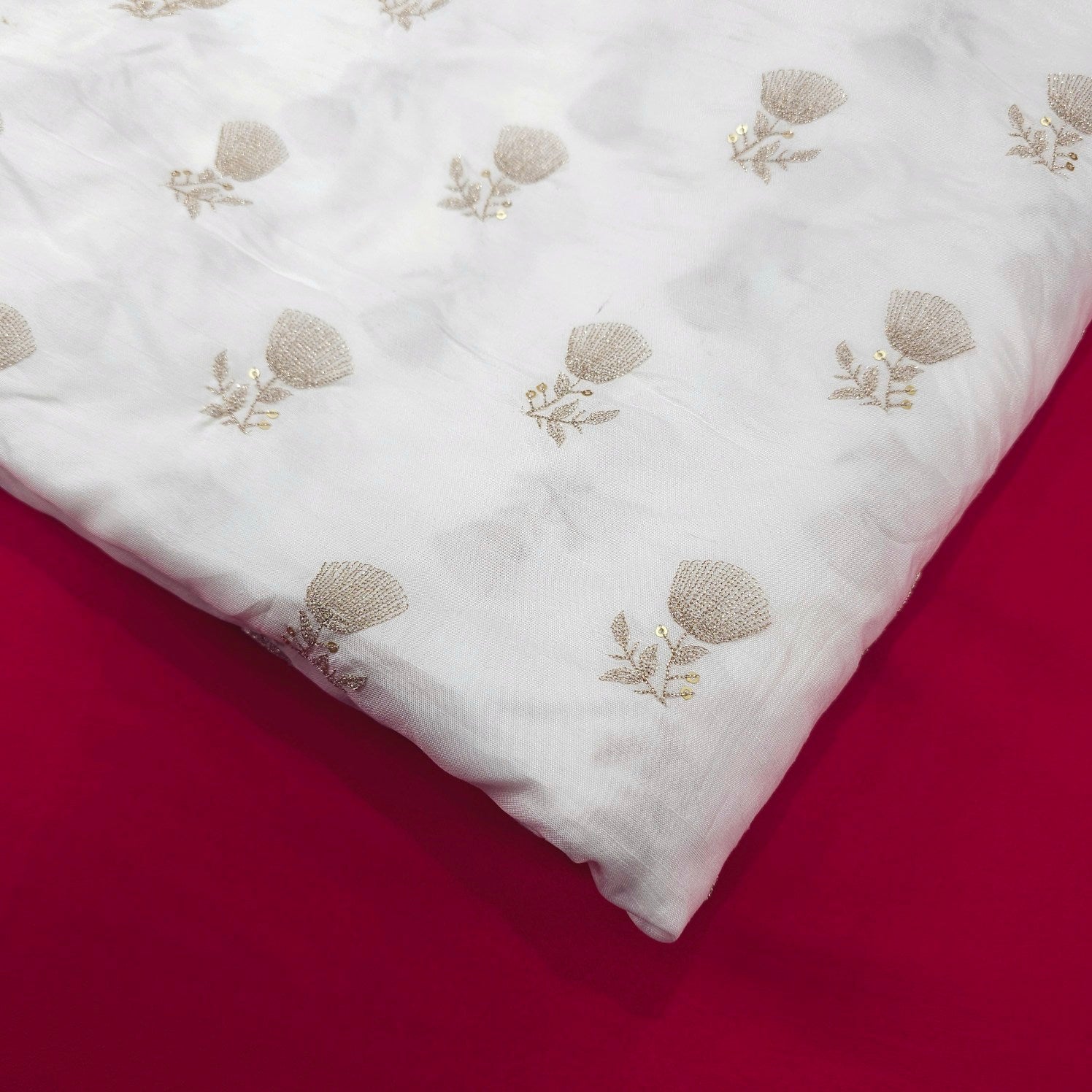 A lightweight dyeable georgette fabric adorned with shimmering floral embroidery with sequin highlights that with add structure to any garment. The design gives it a modern aesthetic while maintaining a traditional shimmer, perfect for festive or evening wear. The embroidery runs throughout the fabric, enhancing fluid drapes and stylish silhouettes.