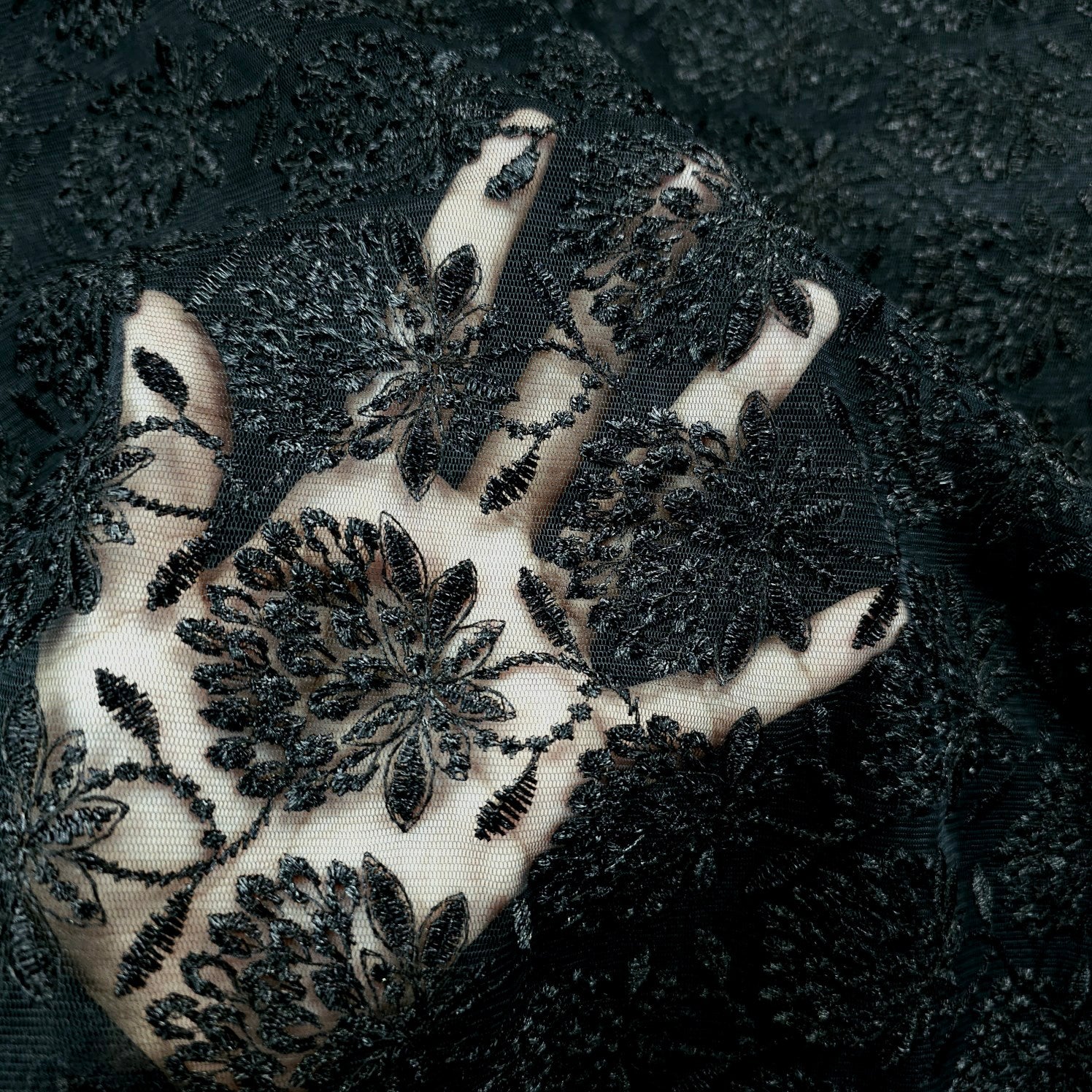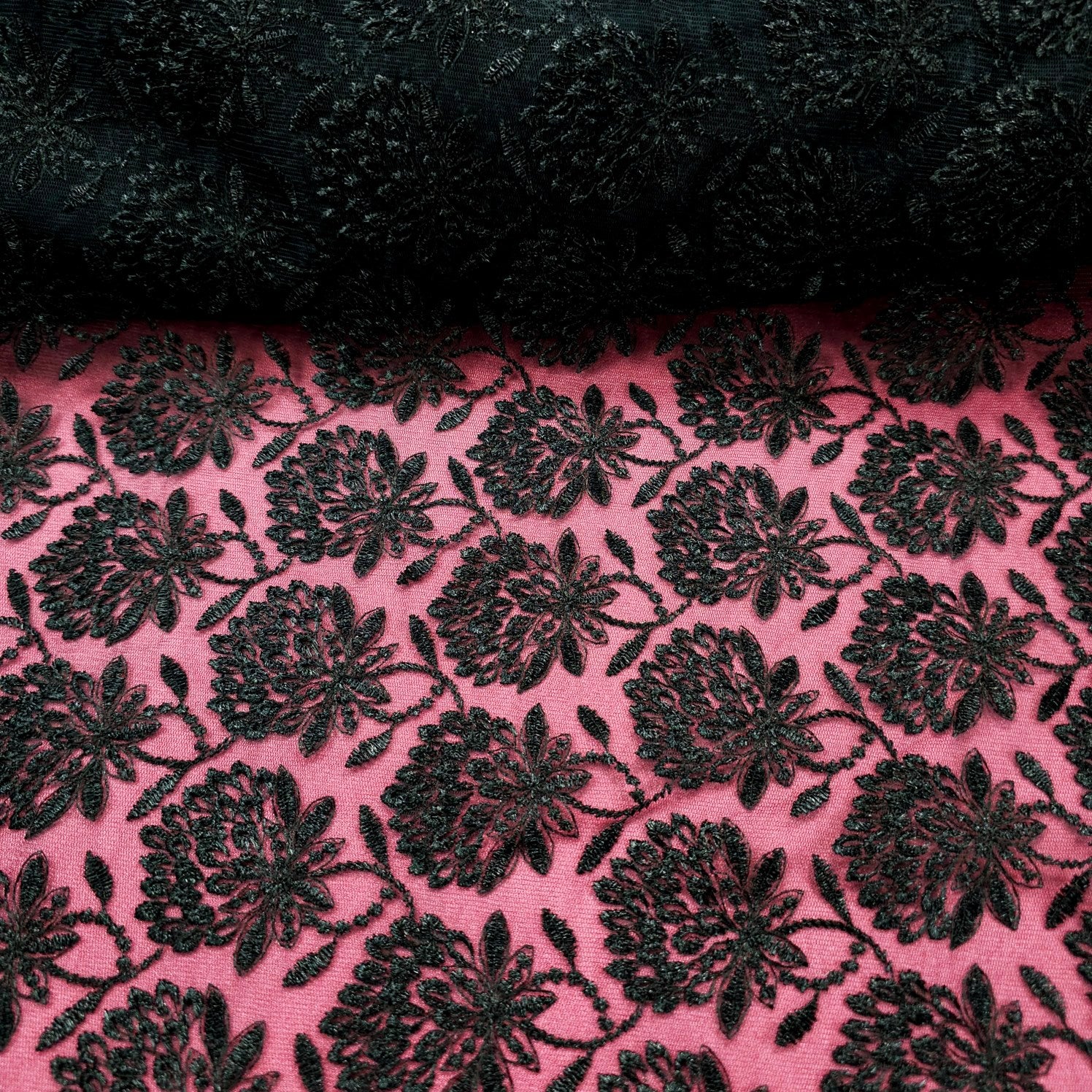Vibrant burgundy floral embroidered net fabric with a sheer base, adding a bold and festive charm to any attire.