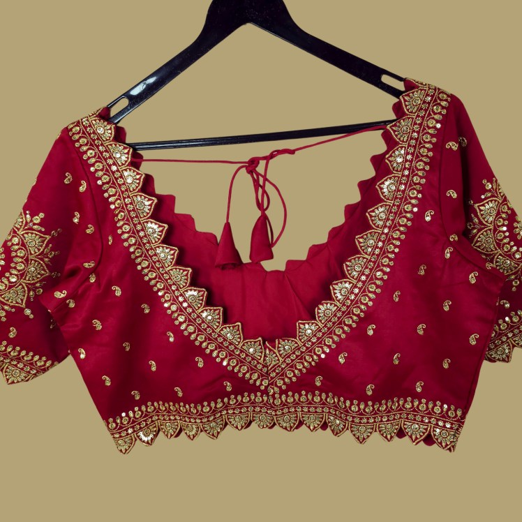 This deep red blouse features intricate golden embroidery with delicate paisley and mandala motifs. The scalloped curvy V-neckline and hem add a regal touch, while the back tie detail completes the festive look. Perfect for weddings, sangeet, and traditional celebrations.