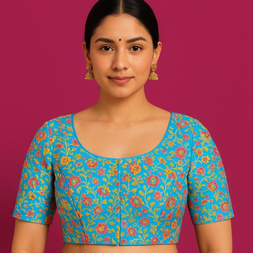 This floral Banaras brocade blouse exudes grace with its intricate multi -color woven floral motifs and luxurious sheen. The classic round front neckline offers a timeless appeal, while the matka-style back neck adds a touch of elegance, making it perfect for festive and traditional wear.