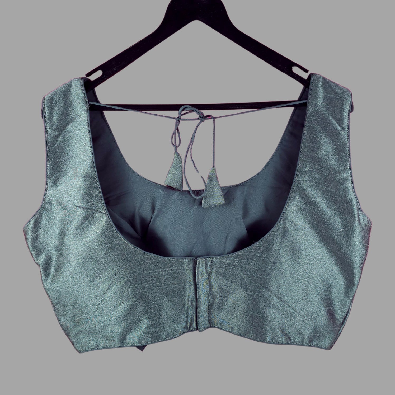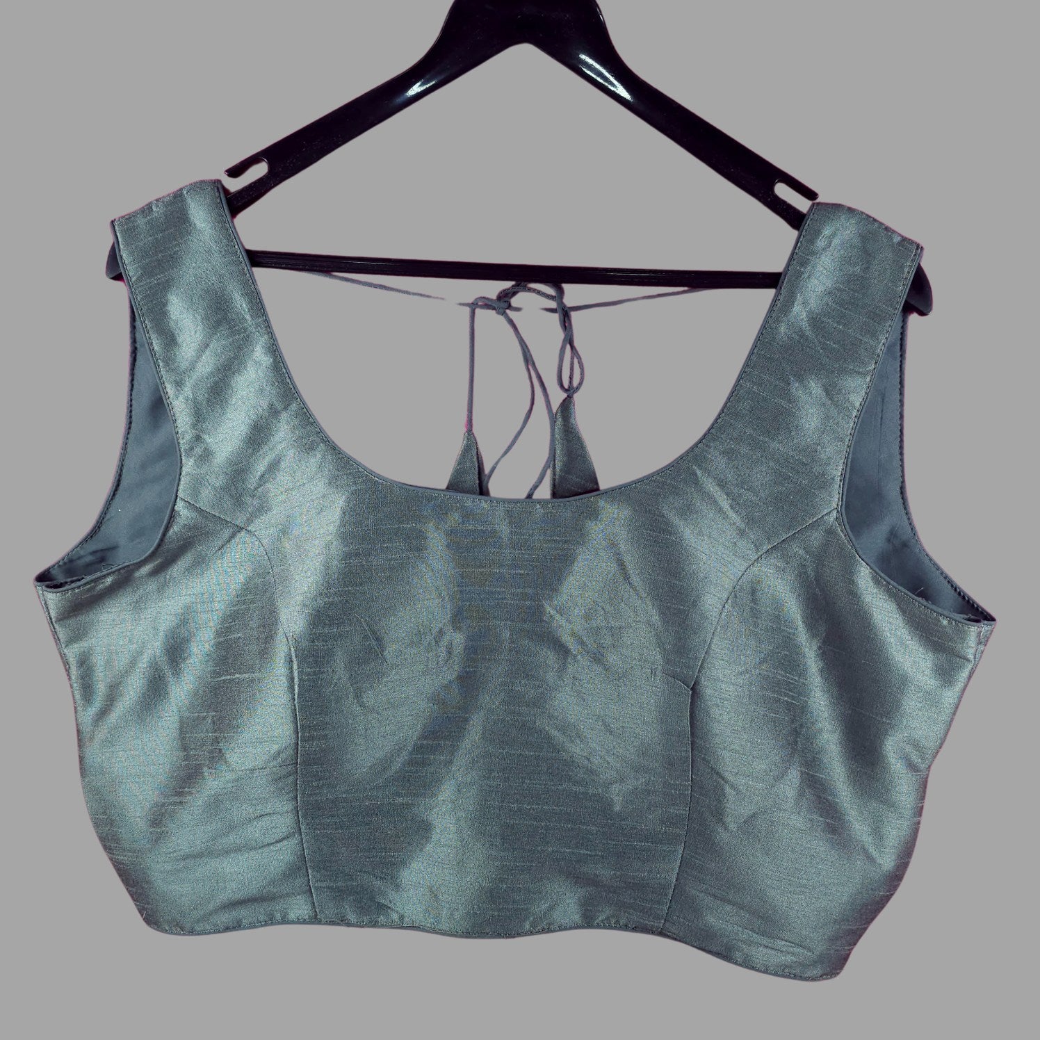 This sleeveless blouse in an elegant Grey color is crafted from rich raw silk, offering a luxurious texture. The Round neckline and back tie-up detail add a refined charm, making it a perfect choice for traditional and festive ensembles.