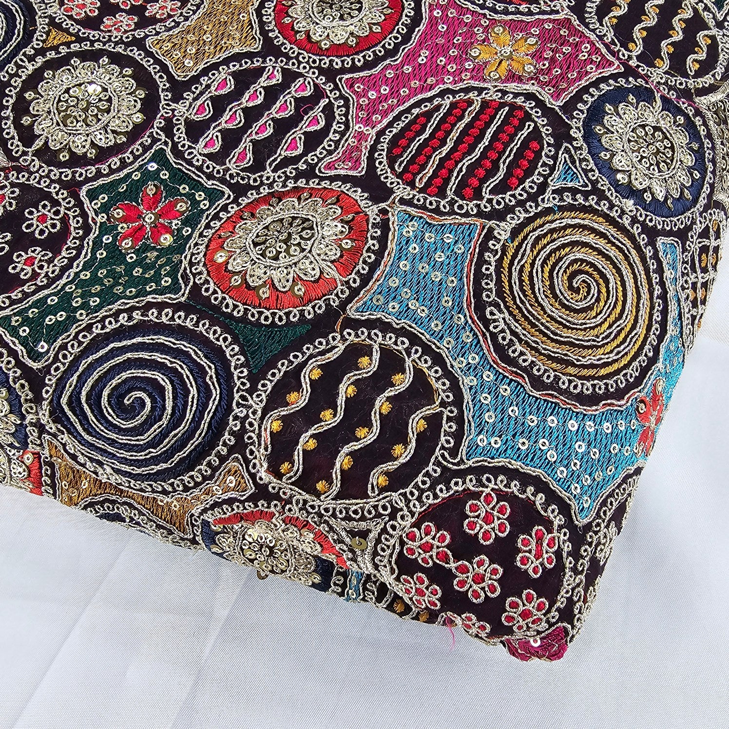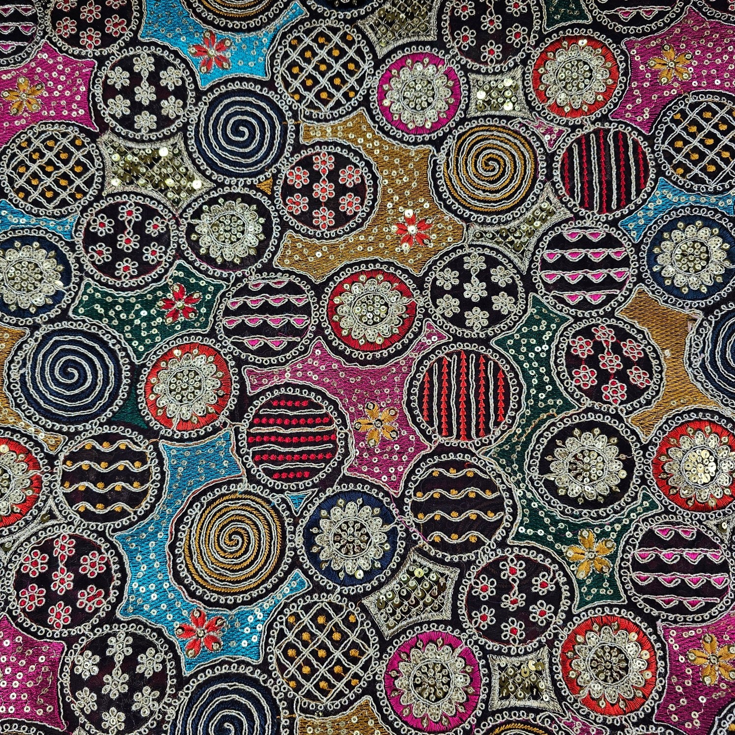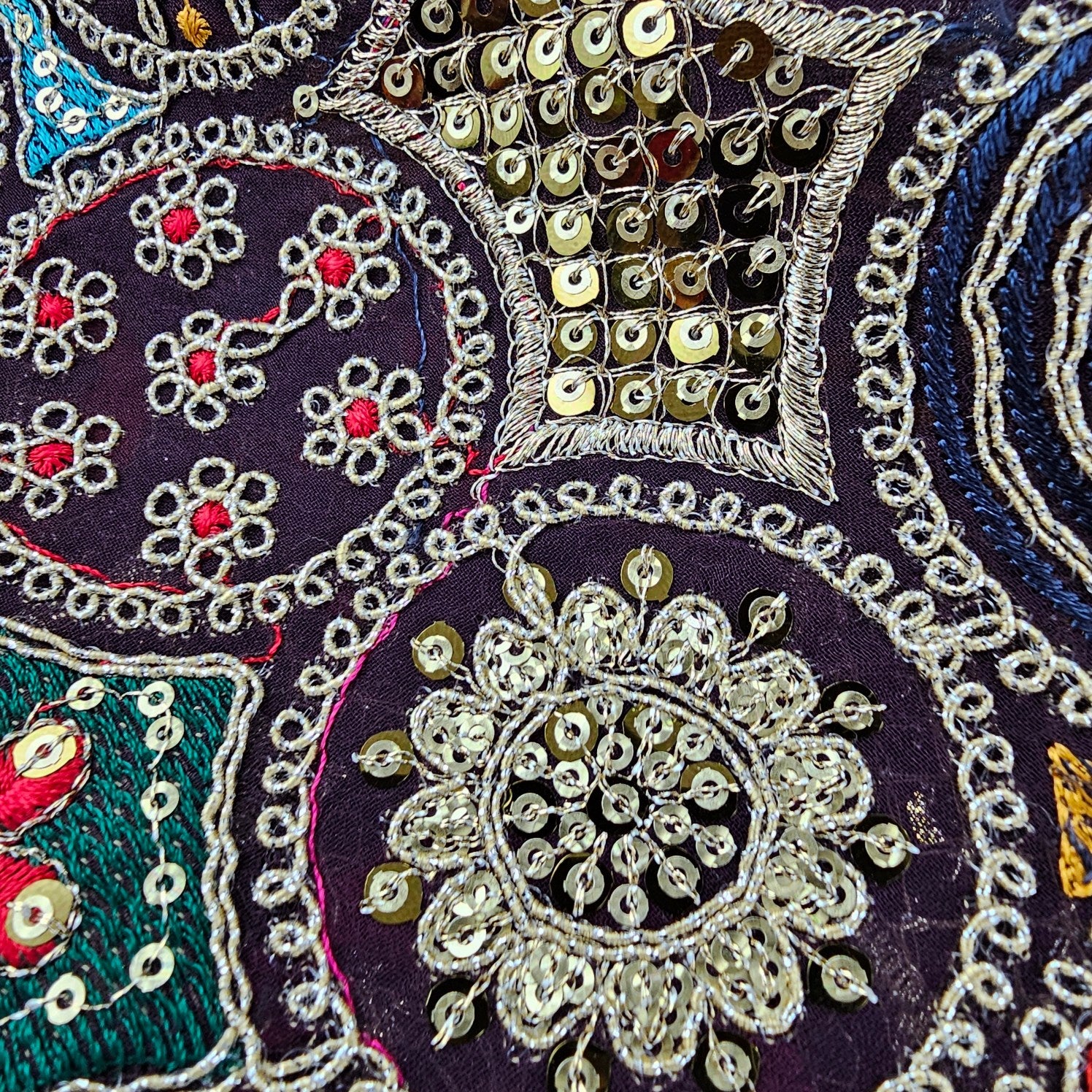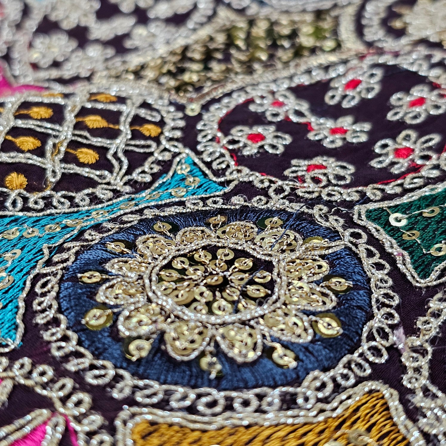 Exquisite handcrafted intricate embroidery and gota work on a rich fabric base. The vibrant mix of colors and detailed patterns create a visually stunning design, perfect for adding an ethnic and regal touch to any space. The meticulous embellishments enhance its luxurious appeal, making it ideal for traditional and festive wear.