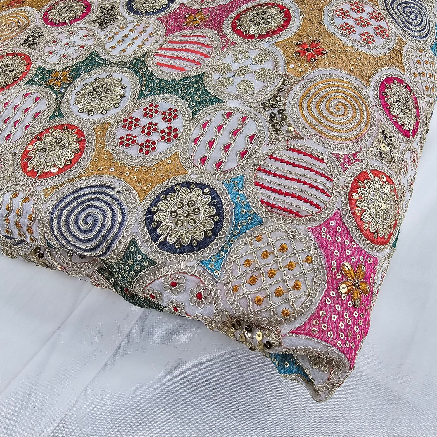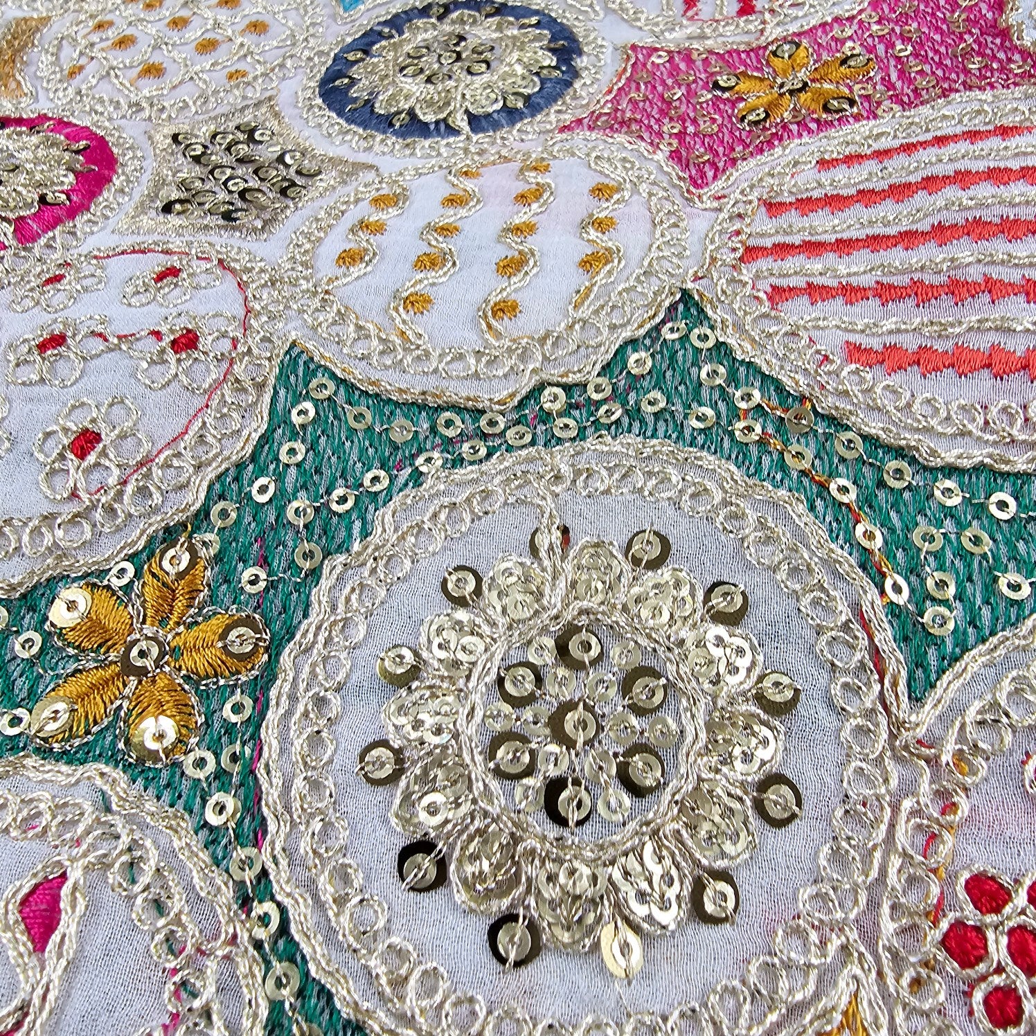 Exquisite handcrafted intricate embroidery and gota work on a rich fabric base. The vibrant mix of colors and detailed patterns create a visually stunning design, perfect for adding an ethnic and regal touch to any space. The meticulous embellishments enhance its luxurious appeal, making it ideal for traditional and festive wear.