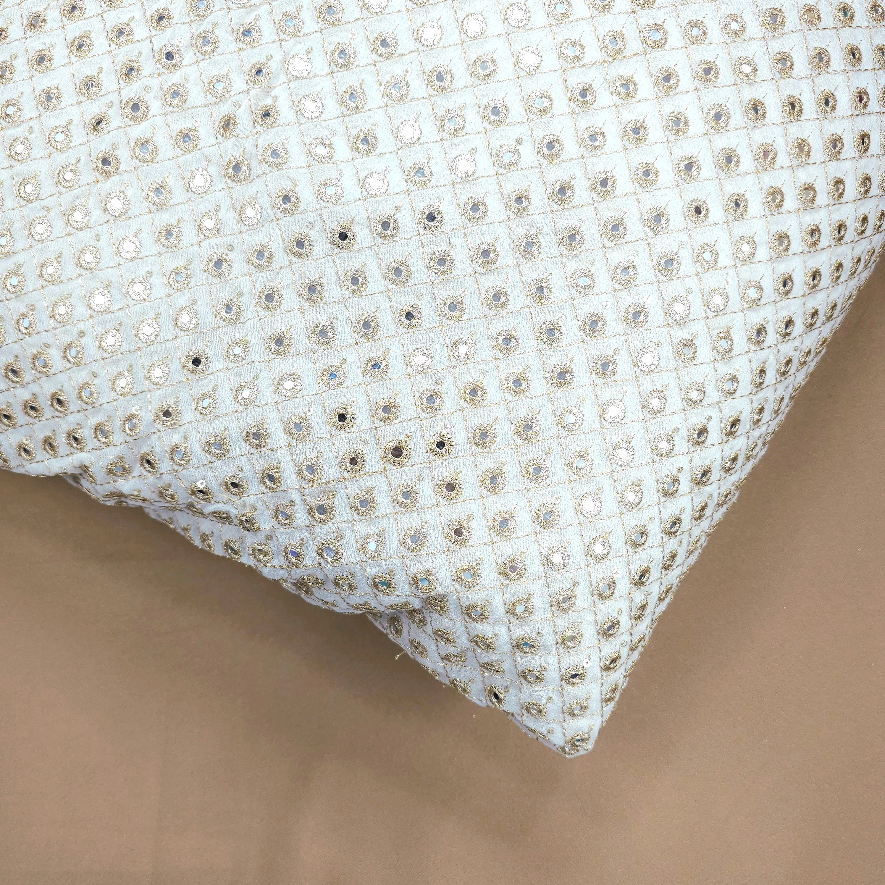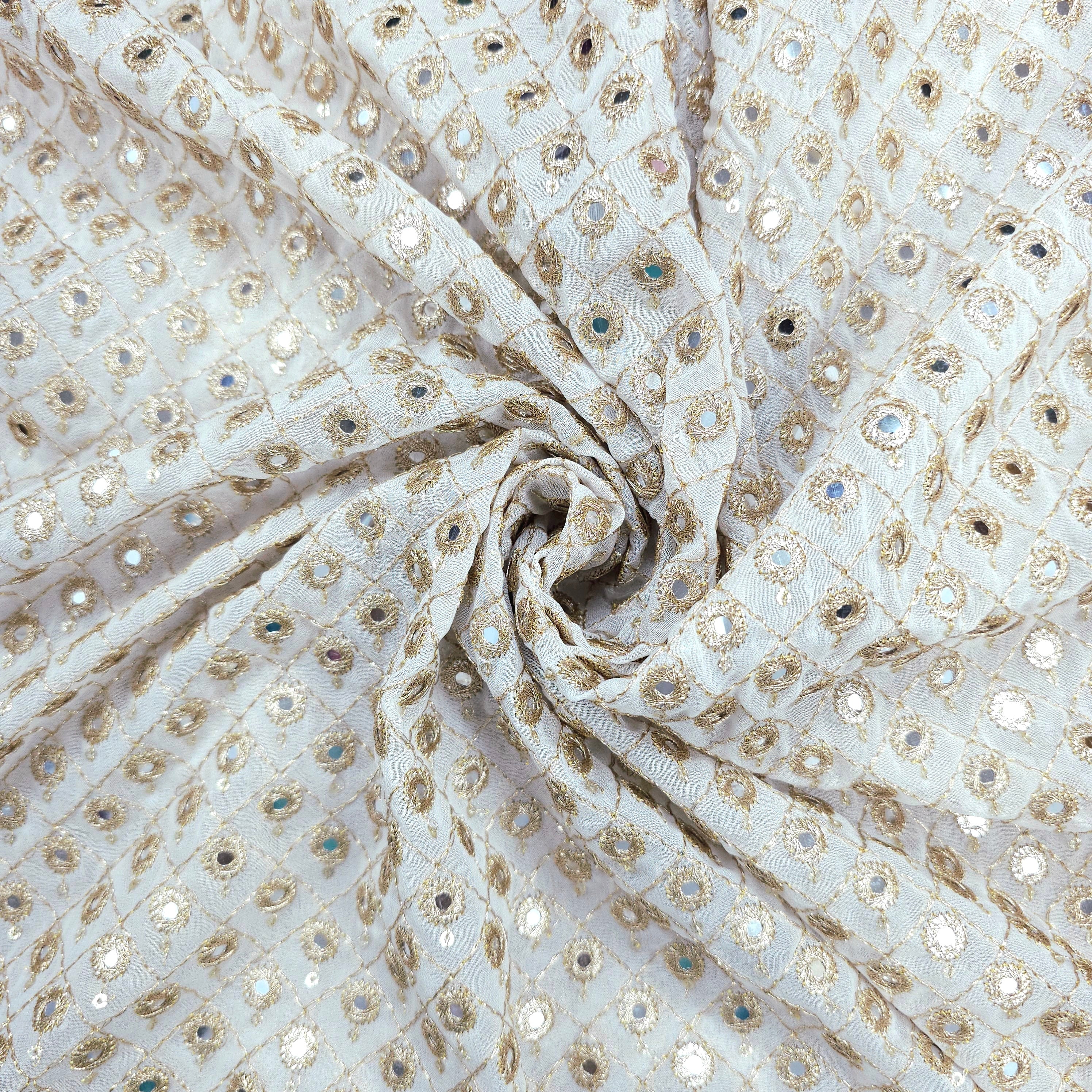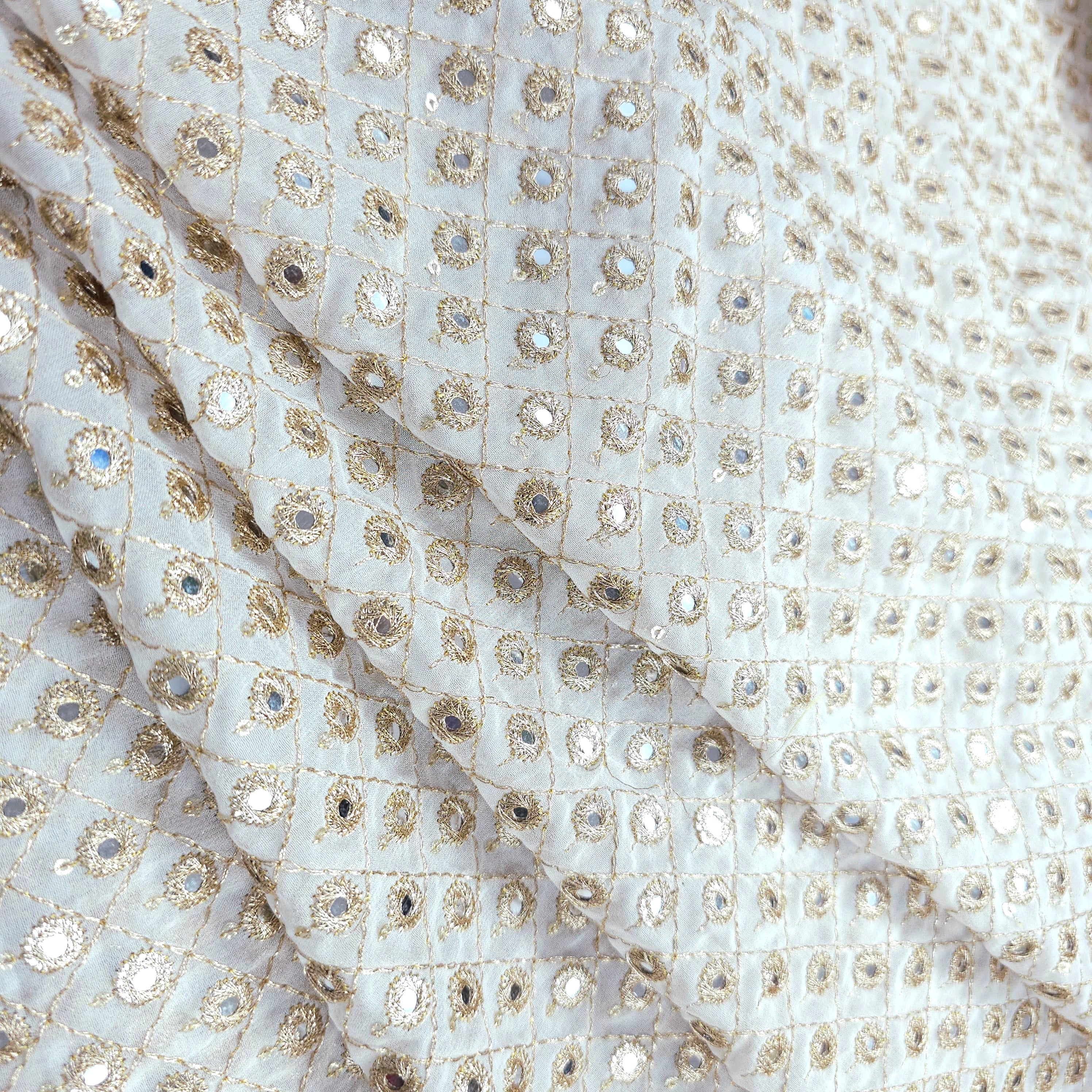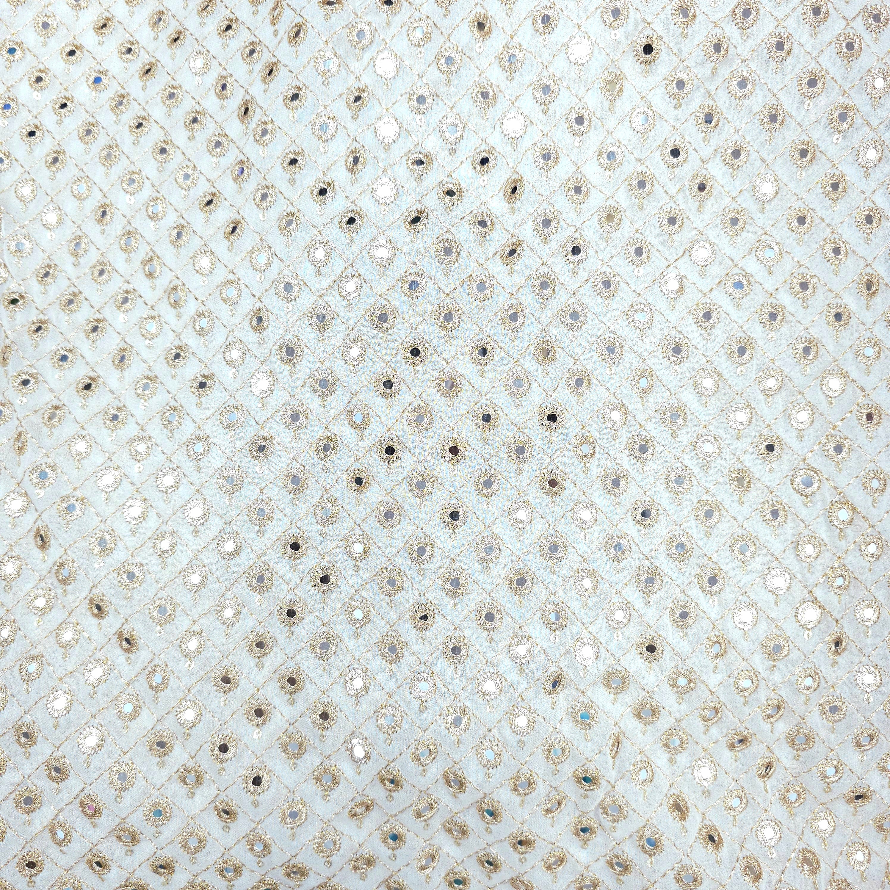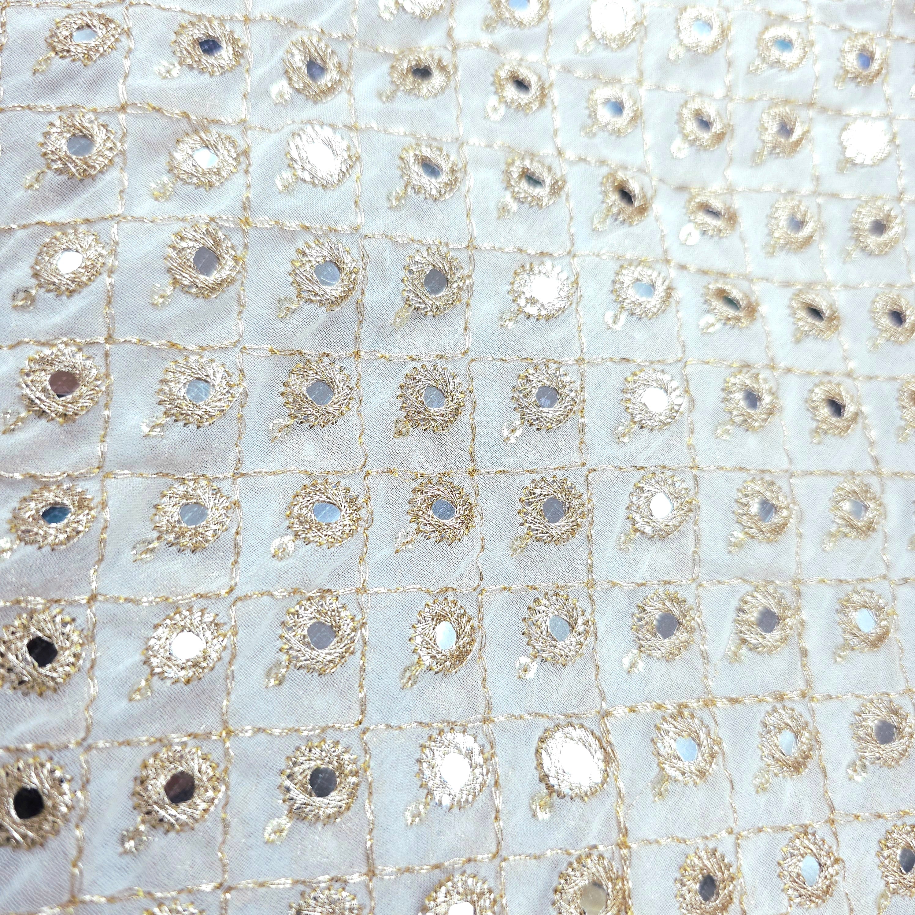 This fabric features a geometric jaali-style mirror work and zari embroidery, arranged in grid pattern. The layout gives a traditional yet elegant look, adding depth and dimension to the base.