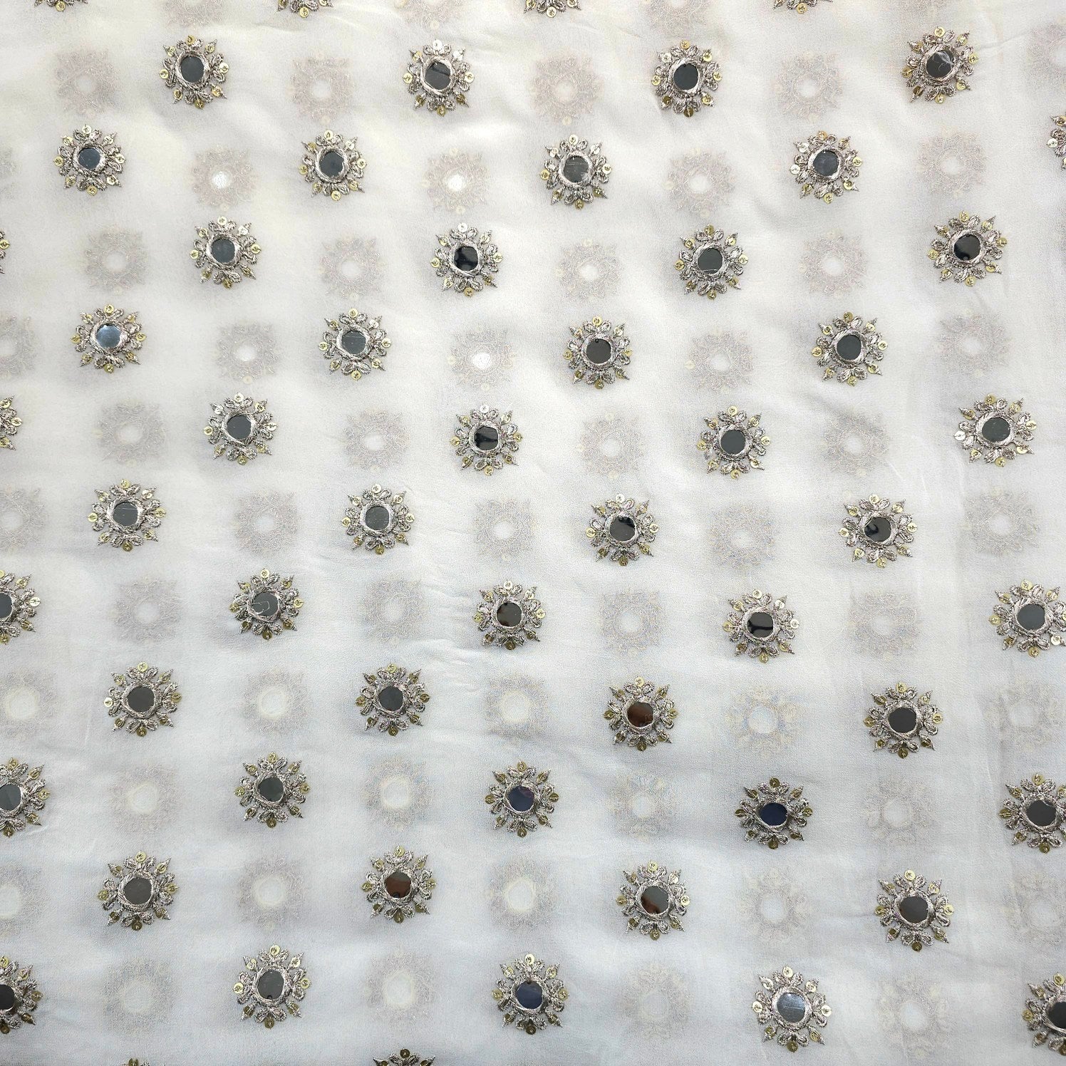 A radiant georgette fabric featuring all-over floral mirror buttis placed in a grid pattern. The mirror embellishments are bordered with delicate thread and sequin embroidery, creating a perfect harmony of tradition and sparkle. Ideal for festive and bridal silhouettes, this dyeable fabric offers endless design possibilities.