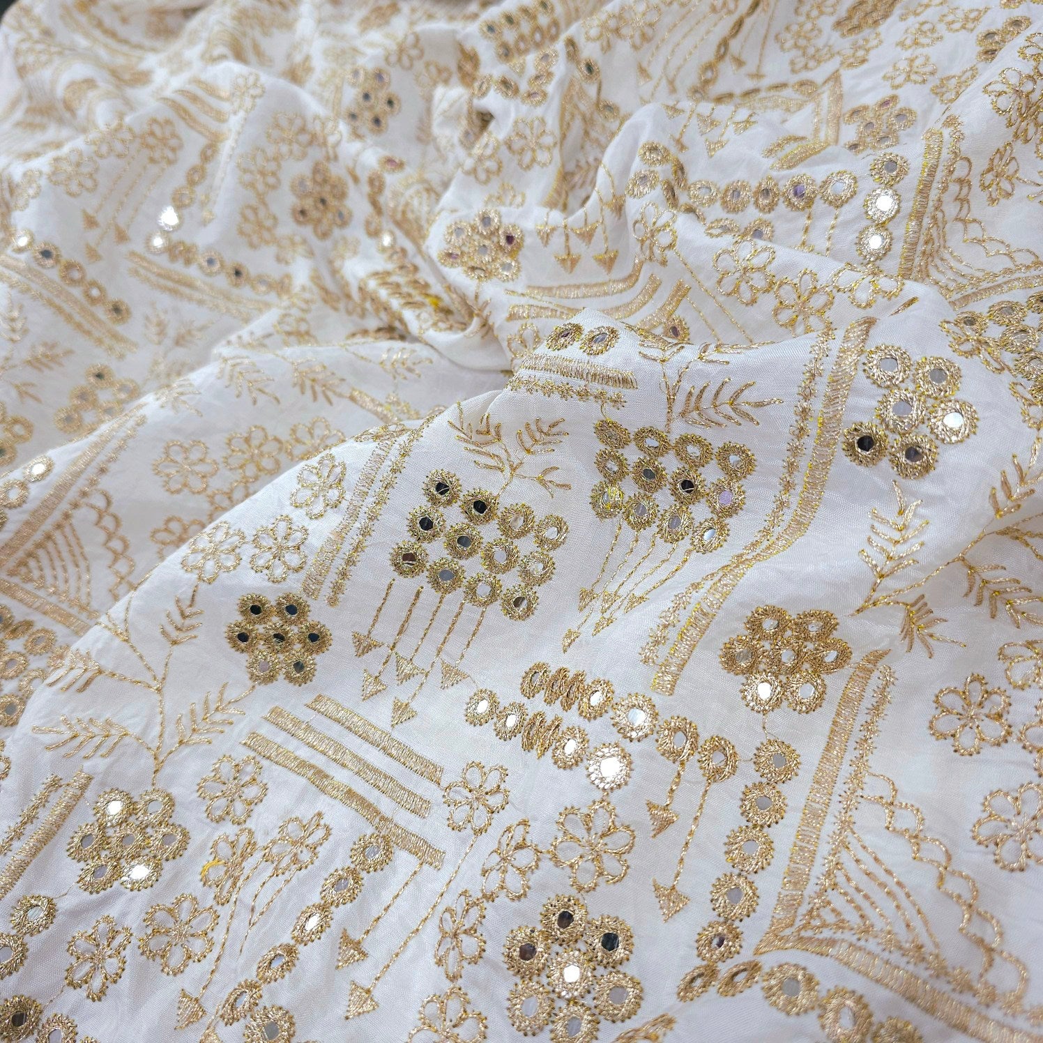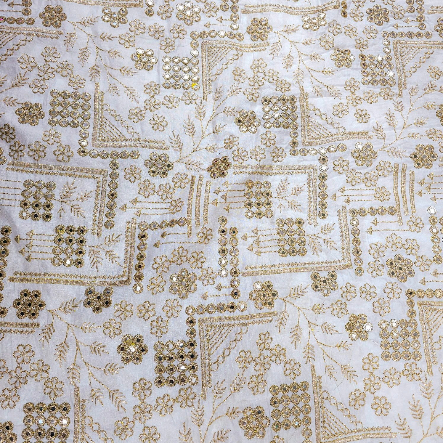 This Upada Silk fabric features all over mirror work, zari and sequin embroidery. The base is dyeable and work will remain as it is. The layout gives a traditional yet elegant look, adding depth and dimension to the base.