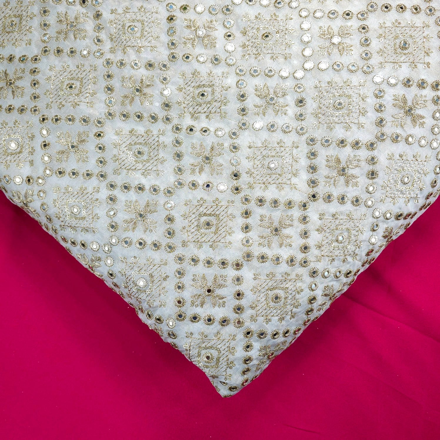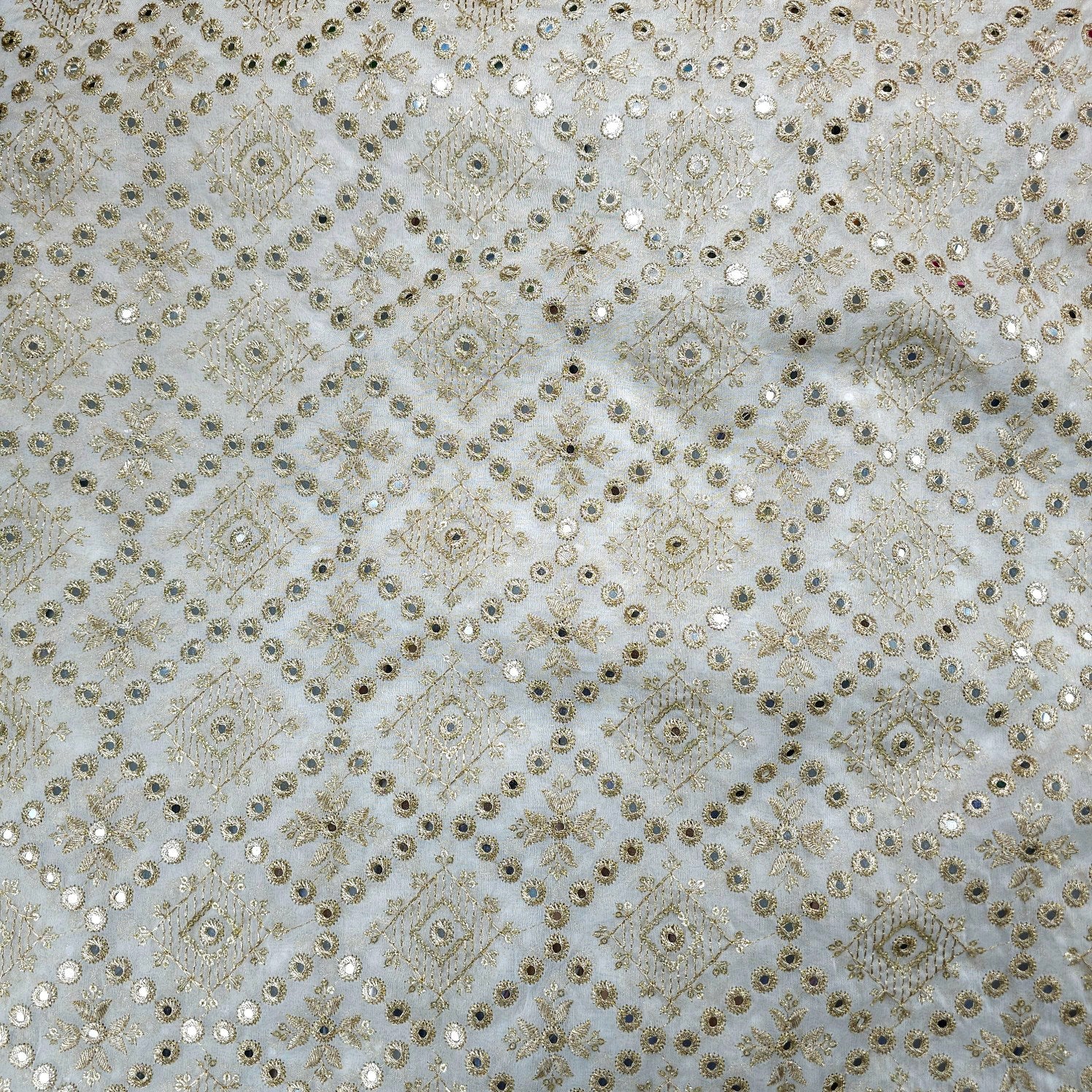 This fabric features a geometric jaali-style mirror work and zari embroidery, arranged in diamond grids. The layout gives a traditional yet elegant look, adding depth and dimension to the base.