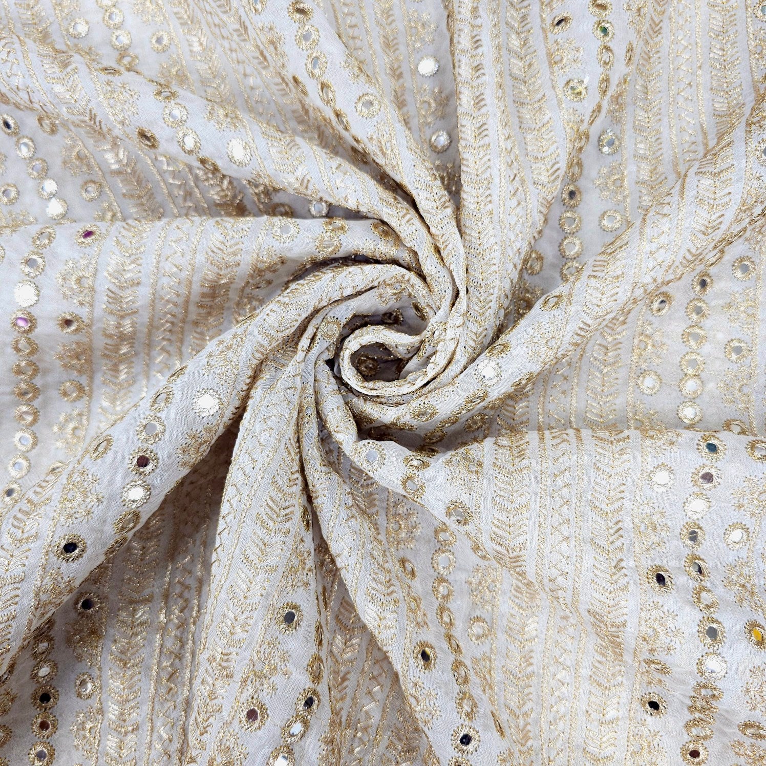 This fabric features linear mirror work embroidery, where small round mirrors are embedded into the design on organza base. The combination of embroidery and mirror embellishments gives the fabric a festive and elegant aesthetic, perfect for traditional or contemporary ethnic wear. Ideal for festive outfits, lehengas, dupattas, and blouses