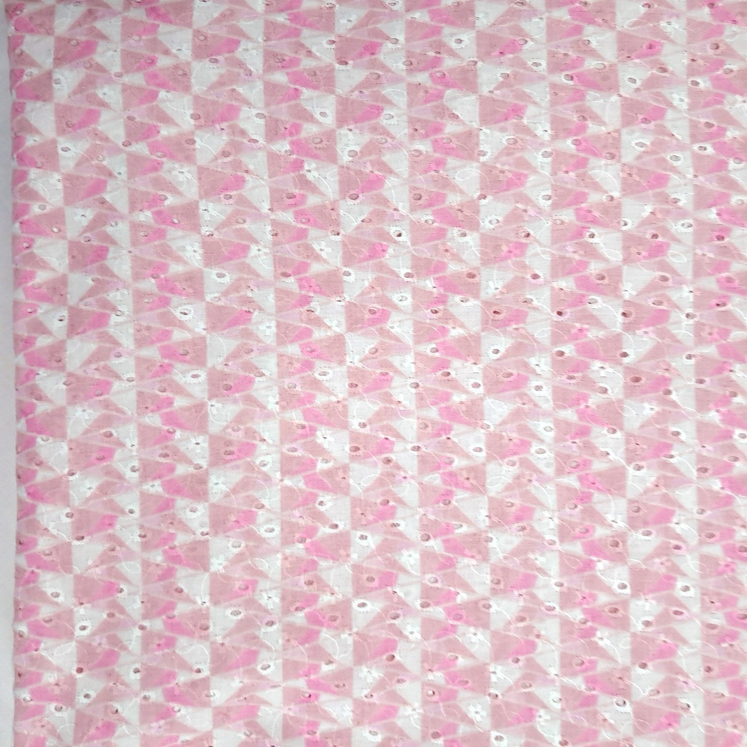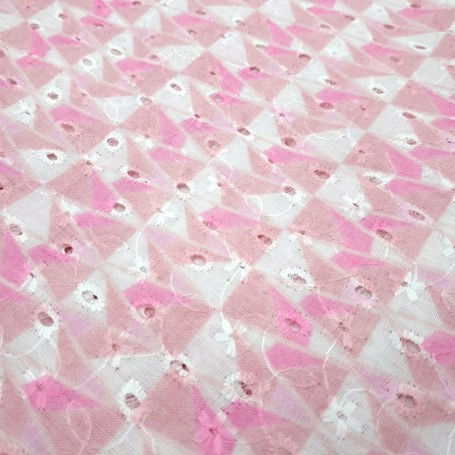 Delicate and breezy, this Hakoba cotton fabric combines intricate eyelet embroidery with cutwork and charming water color printed motifs on Pastel Pink base. Lightweight and breathable, it’s perfect for creating elegant summer wear like kurtis, tops, dresses, and more.