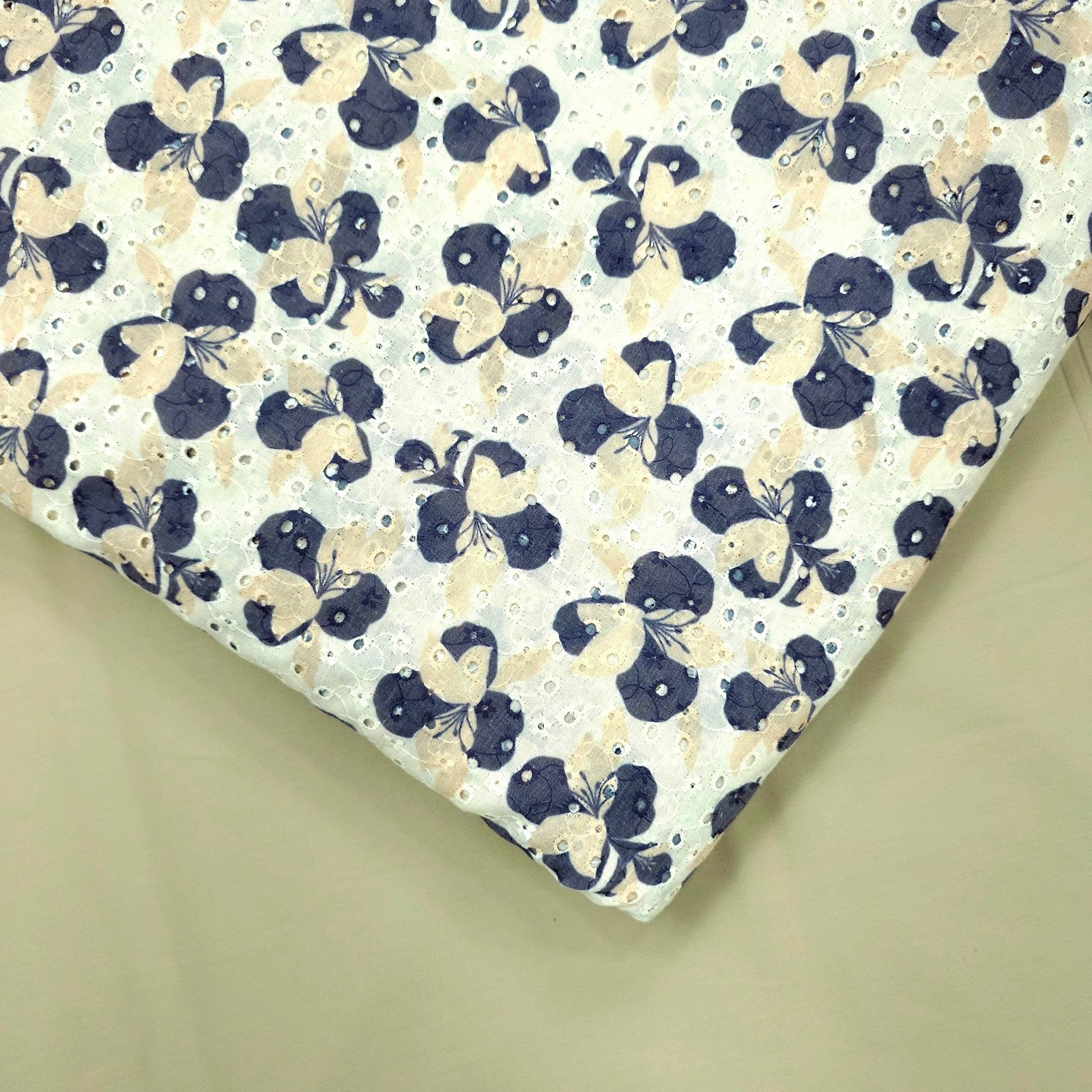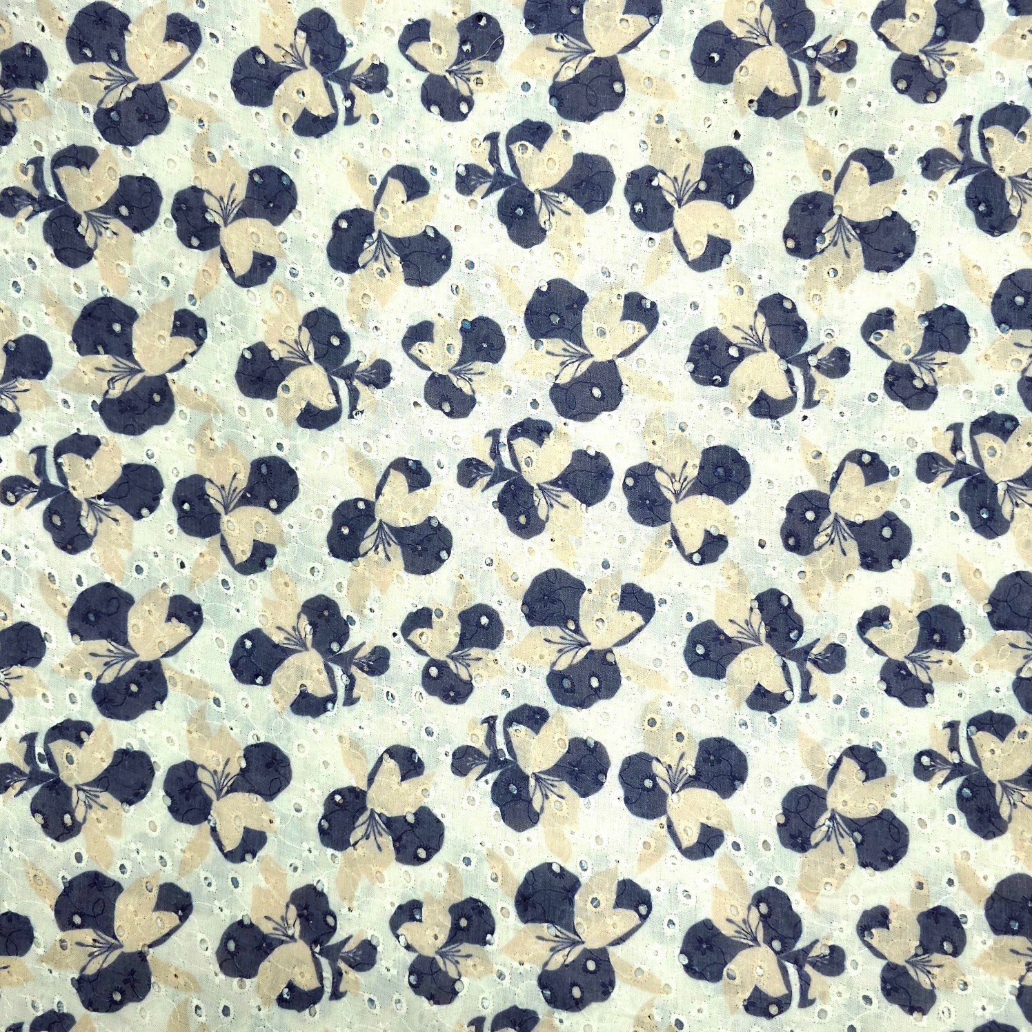 Delicate and breezy, this Hakoba cotton fabric combines intricate eyelet embroidery with cutwork and charming water color printed motifs. Deep Navy Blue Floral Silhouettes with Biege Bloom / Petals. Lightweight and breathable, it’s perfect for creating elegant summer wear like kurtis, tops, dresses, and more.
