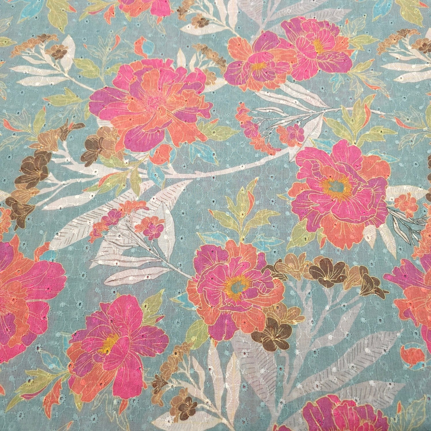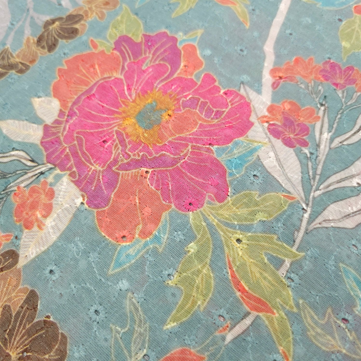 Delicate and breezy, this Hakoba cotton fabric combines intricate eyelet embroidery with cutwork and charming water color printed motifs on Light Sea blue base. Lightweight and breathable, it’s perfect for creating elegant summer wear like kurtis, tops, dresses, and more.