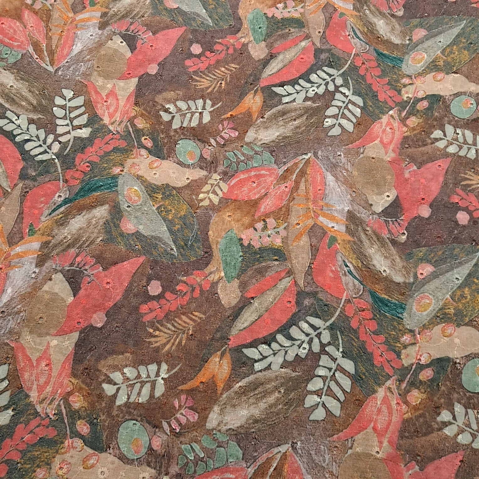 Delicate and breezy, this Hakoba cotton fabric combines intricate eyelet embroidery with cutwork and charming water color printed motifs on Brown base. Lightweight and breathable, it’s perfect for creating elegant summer wear like kurtis, tops, dresses, and more.