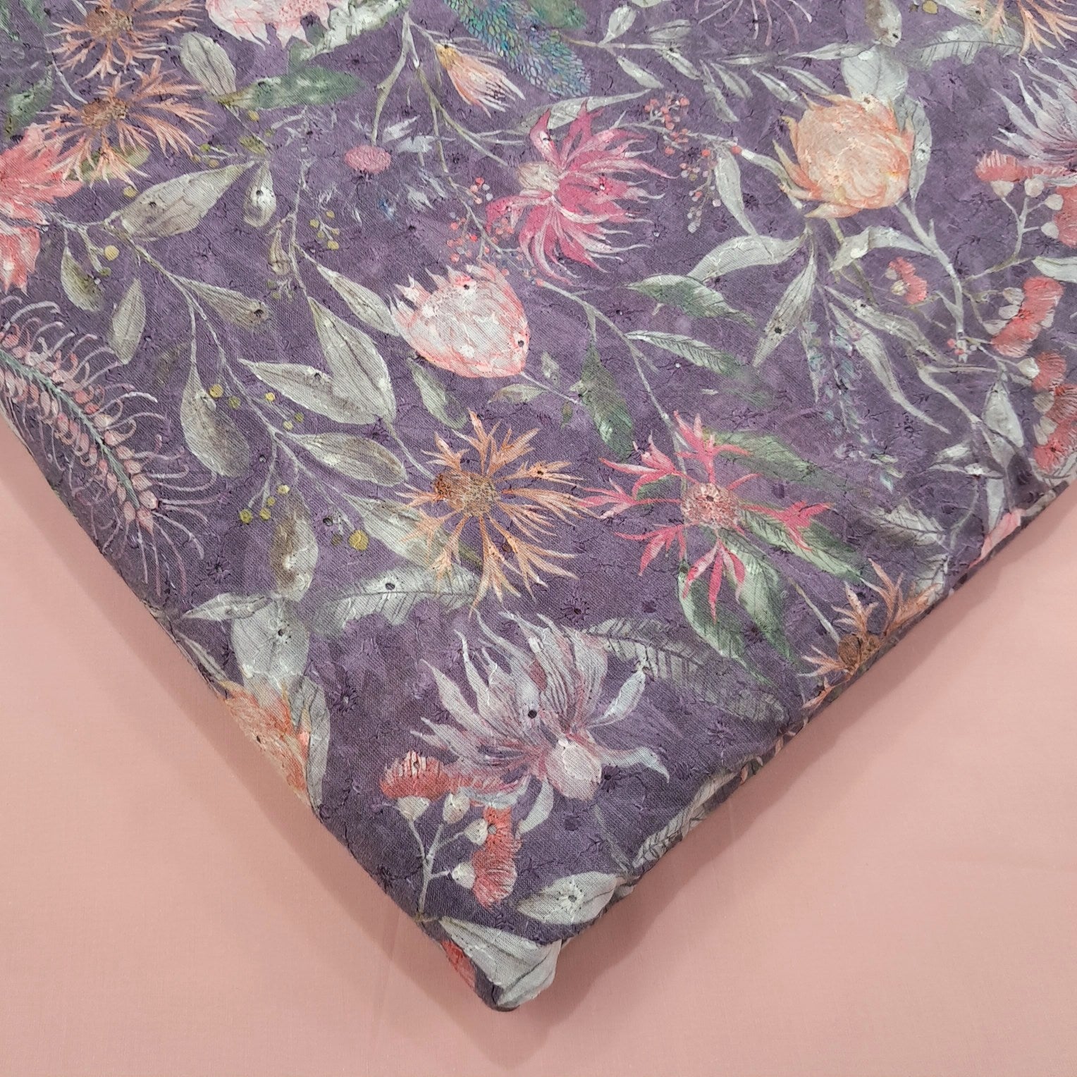 Delicate and breezy, this Hakoba cotton fabric combines intricate eyelet embroidery with cutwork and charming water color printed motifs on Dusty Purple base. Lightweight and breathable, it’s perfect for creating elegant summer wear like kurtis, tops, dresses, and more.