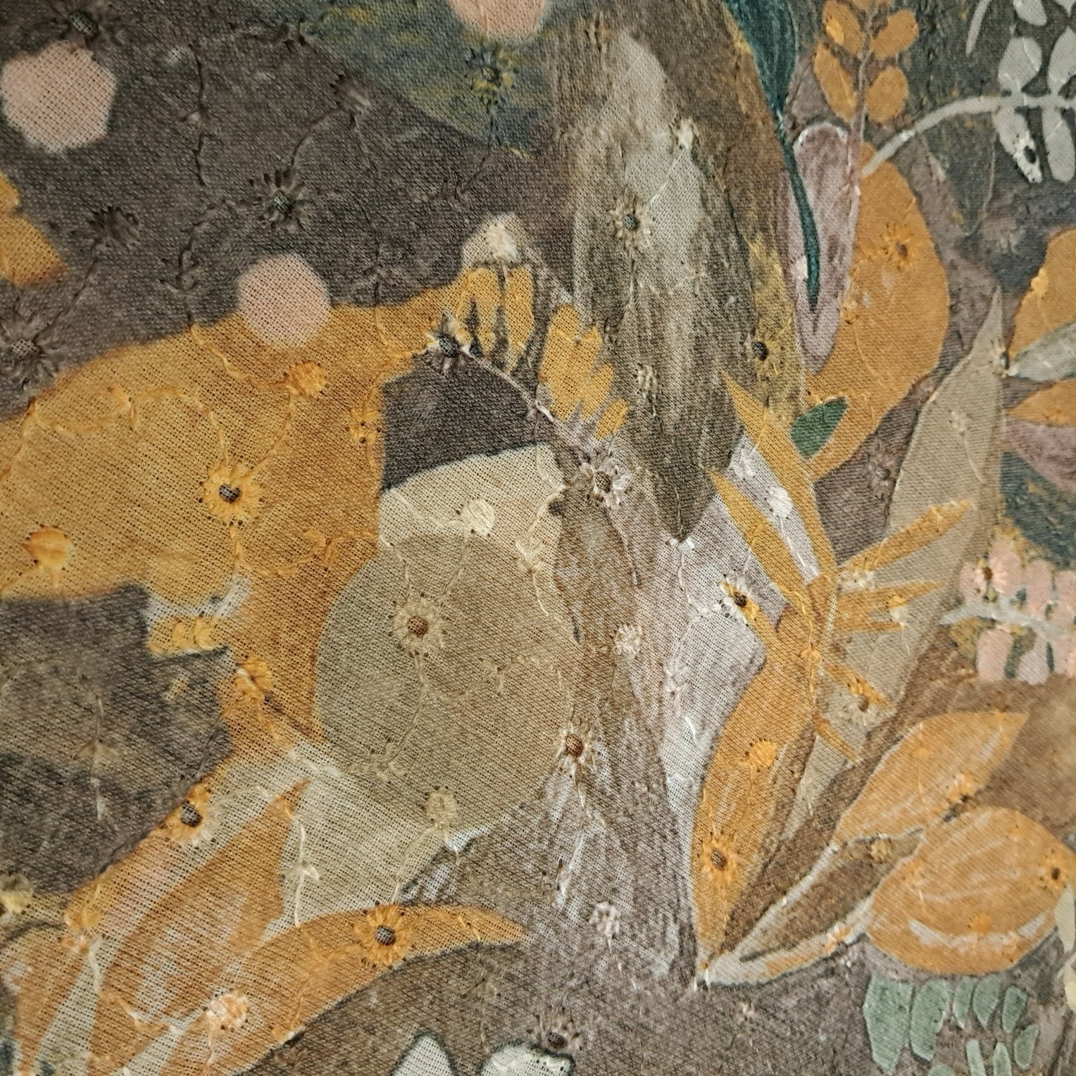 Delicate and breezy, this Hakoba cotton fabric combines intricate eyelet embroidery with cutwork and charming water color printed motifs on tones of brown base. Lightweight and breathable, it’s perfect for creating elegant summer wear like kurtis, tops, dresses, and more.