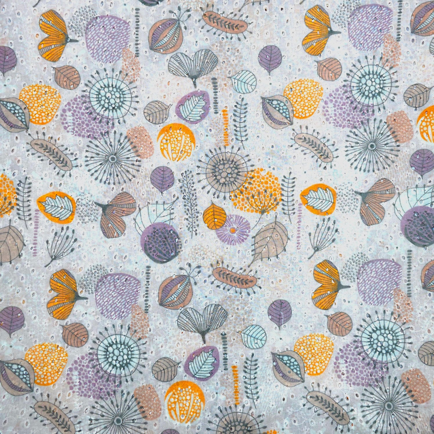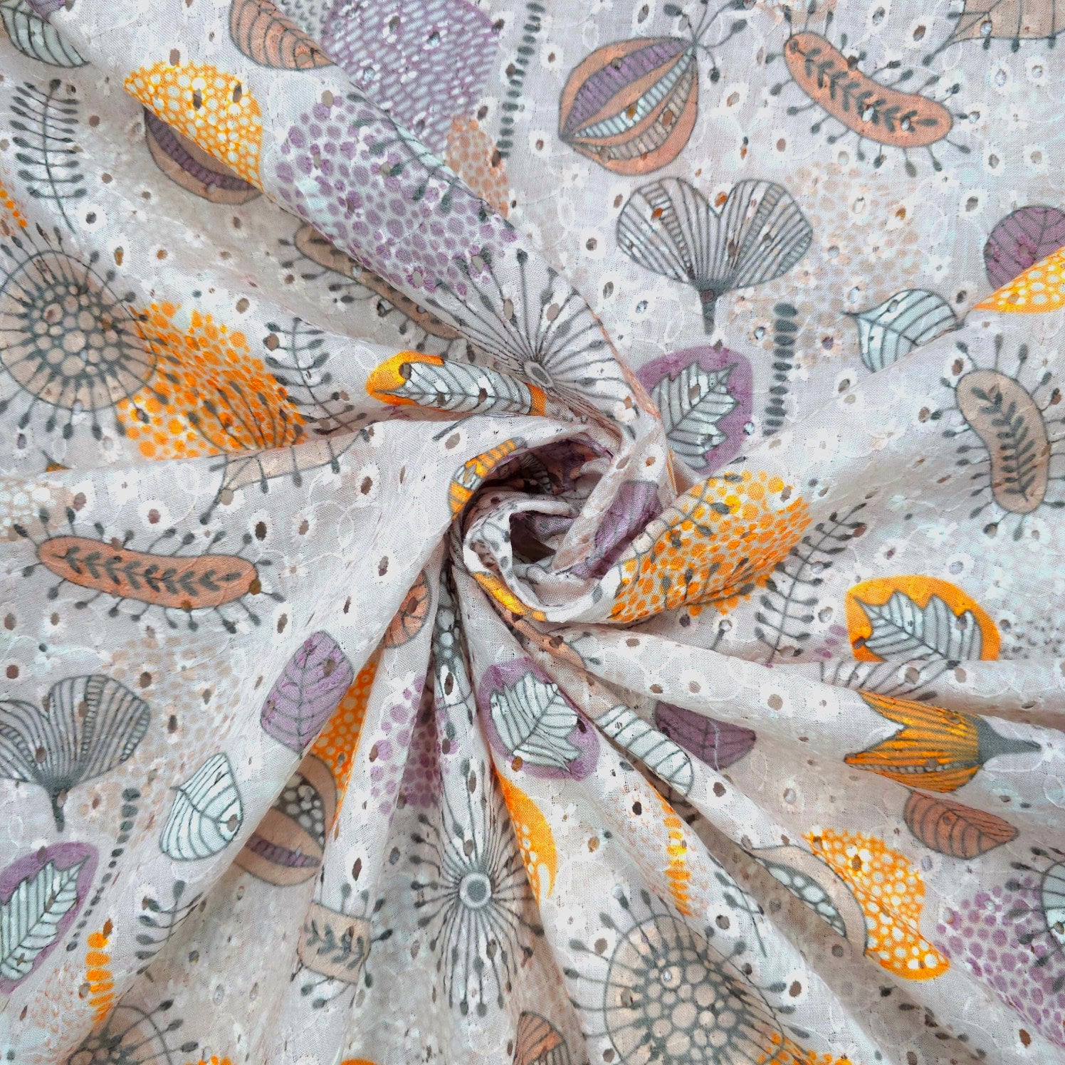 Delicate and breezy, this Hakoba cotton fabric combines intricate eyelet embroidery with cutwork and charming water color printed motifs—from earthy tones to abstract nature-inspired designs. Lightweight and breathable, it’s perfect for creating elegant summer wear like kurtis, tops, dresses, and more.