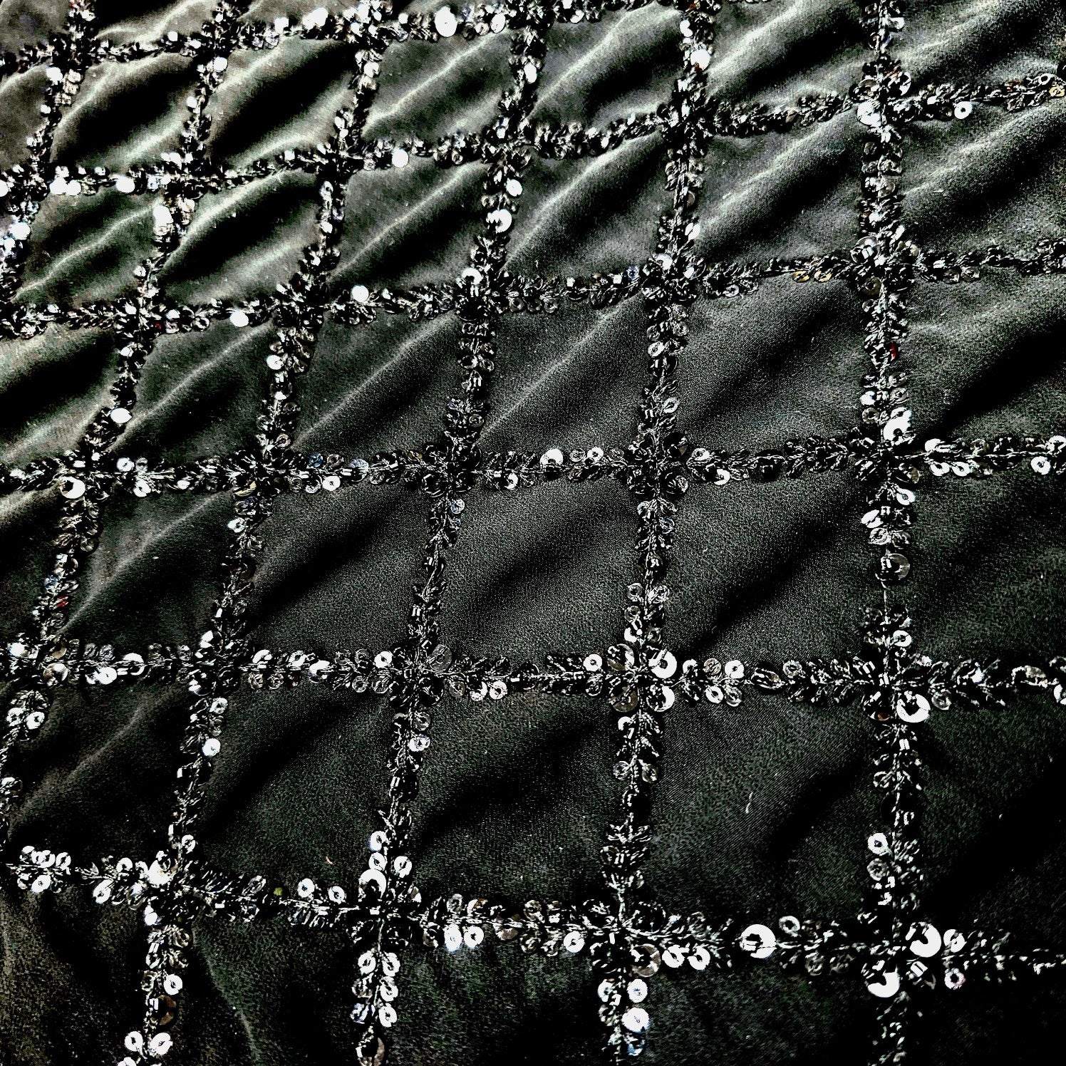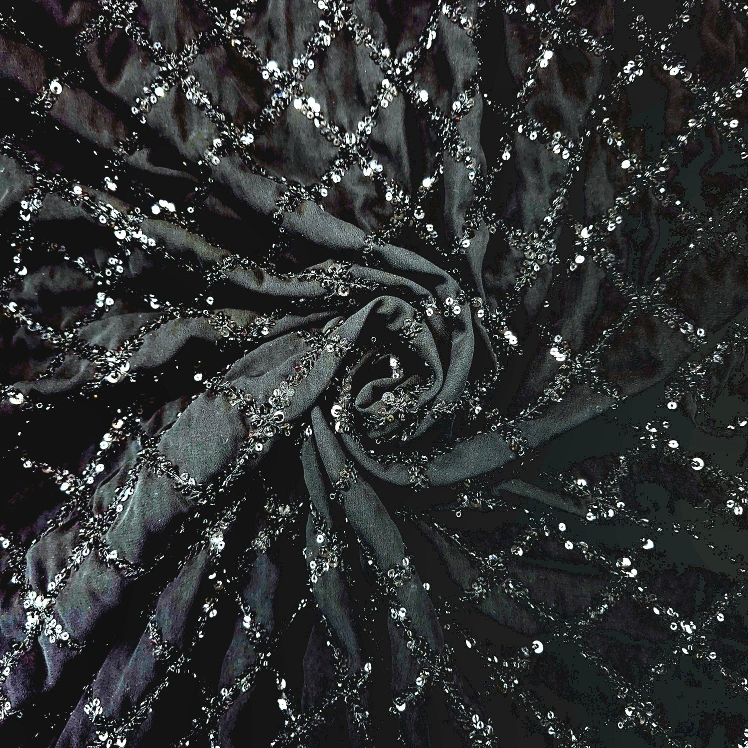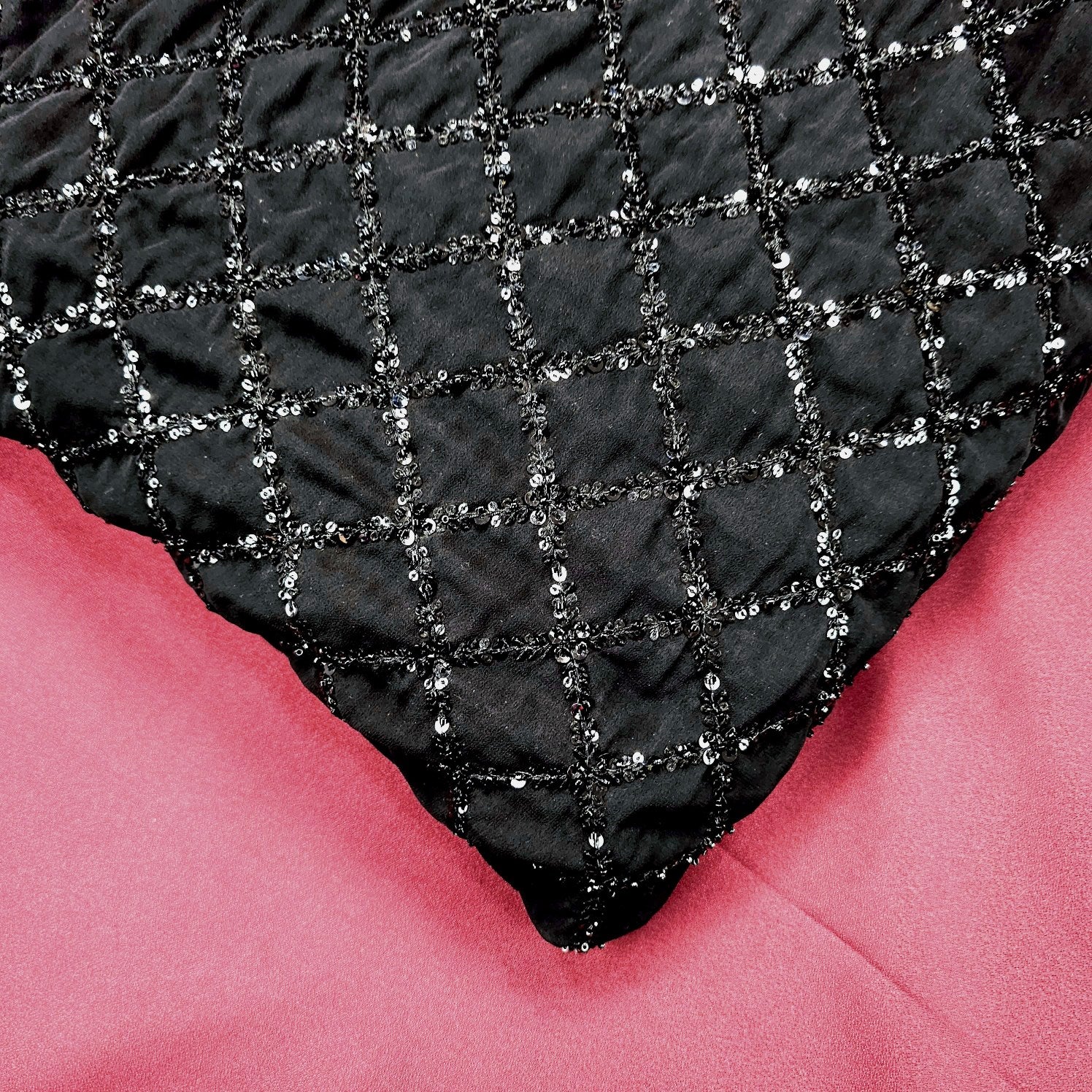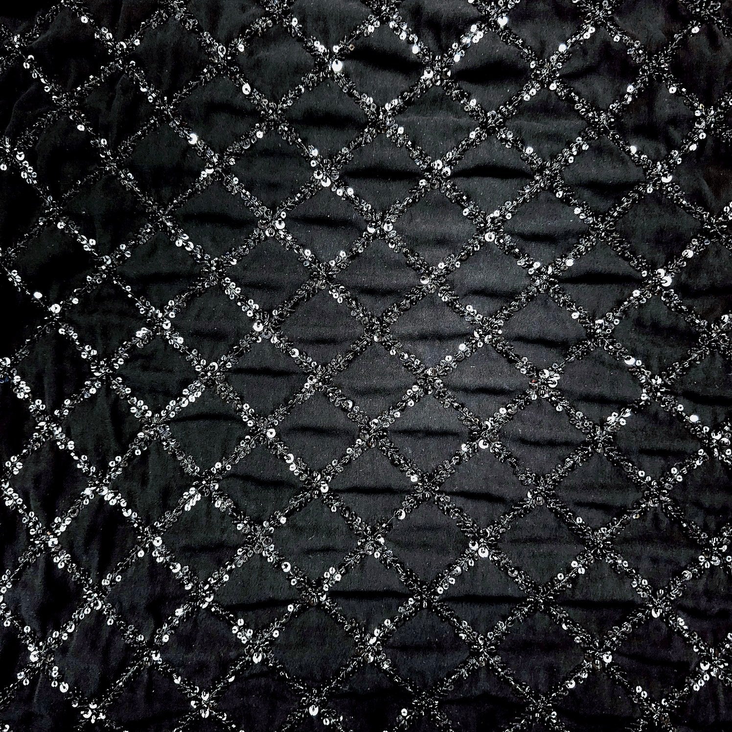 A rich black georgette base adorned with shimmering sequins arranged in a striking checkered pattern. Lightweight yet impactful, this fabric combines the elegance of georgette with the festive glam of all-over sequin work — ideal for creating standout ethnic or Indo-western pieces.