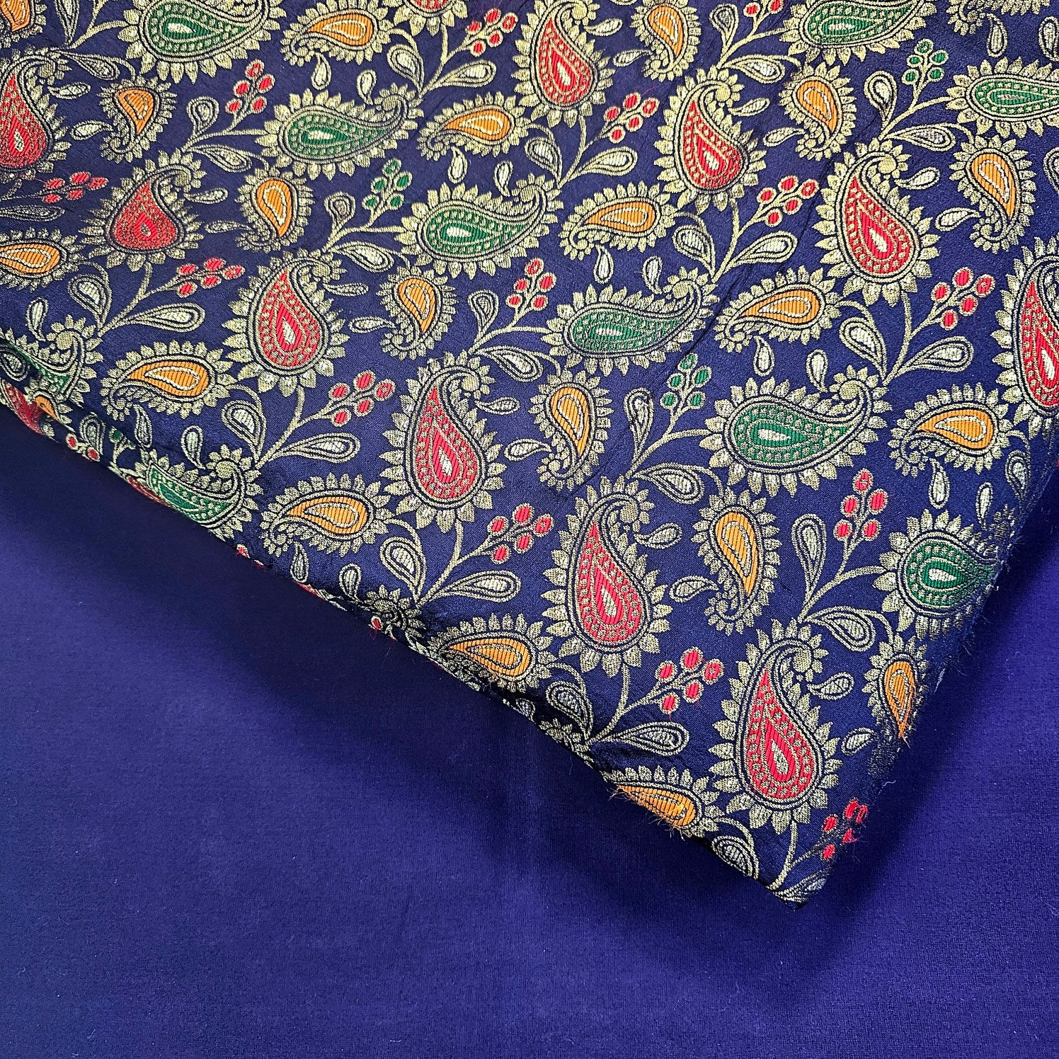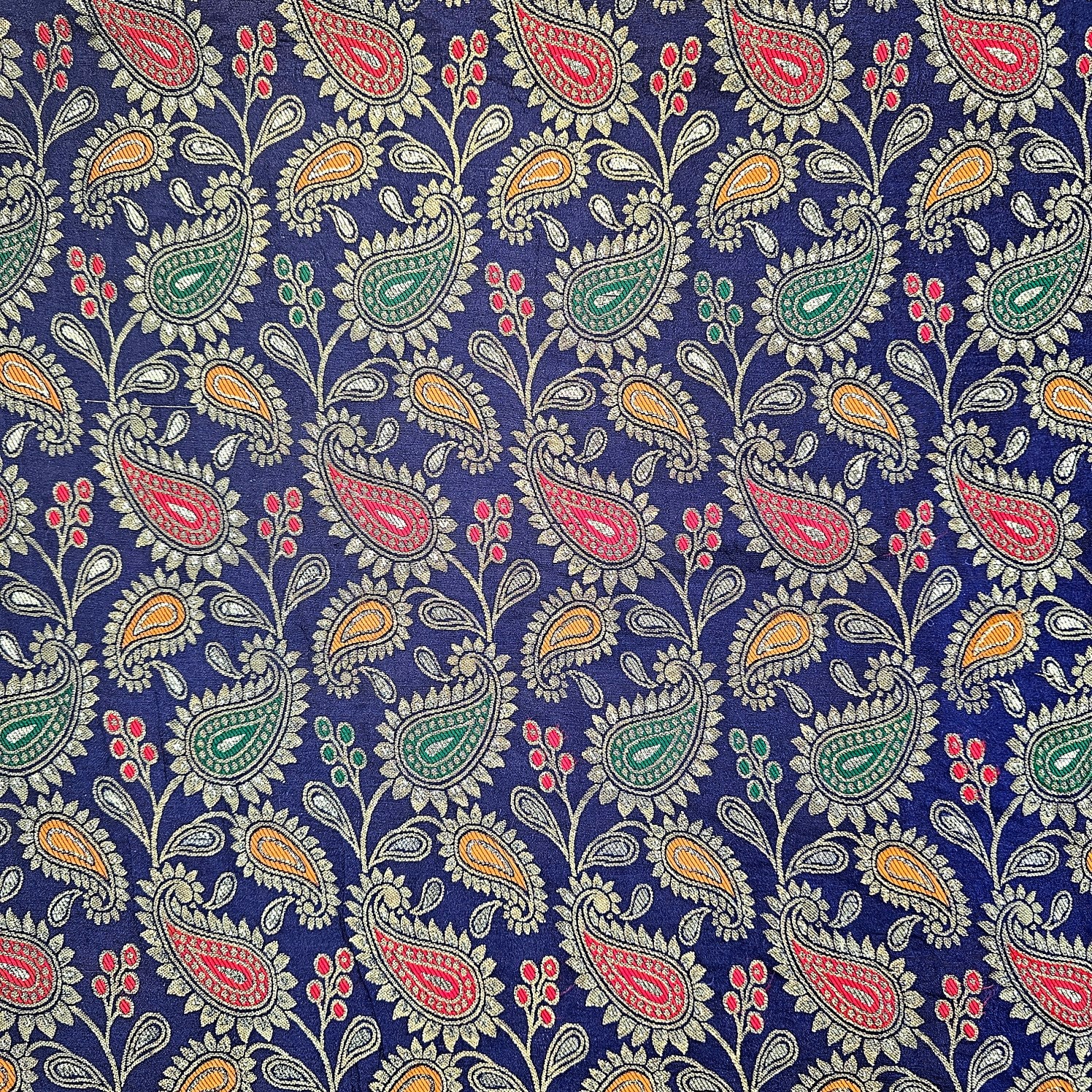 A rich brocade fabric adorned with intricate paisley motifs woven in gold zari, accented with green and orange highlights. The luxurious texture and traditional design make it perfect for festive and bridal wear.
